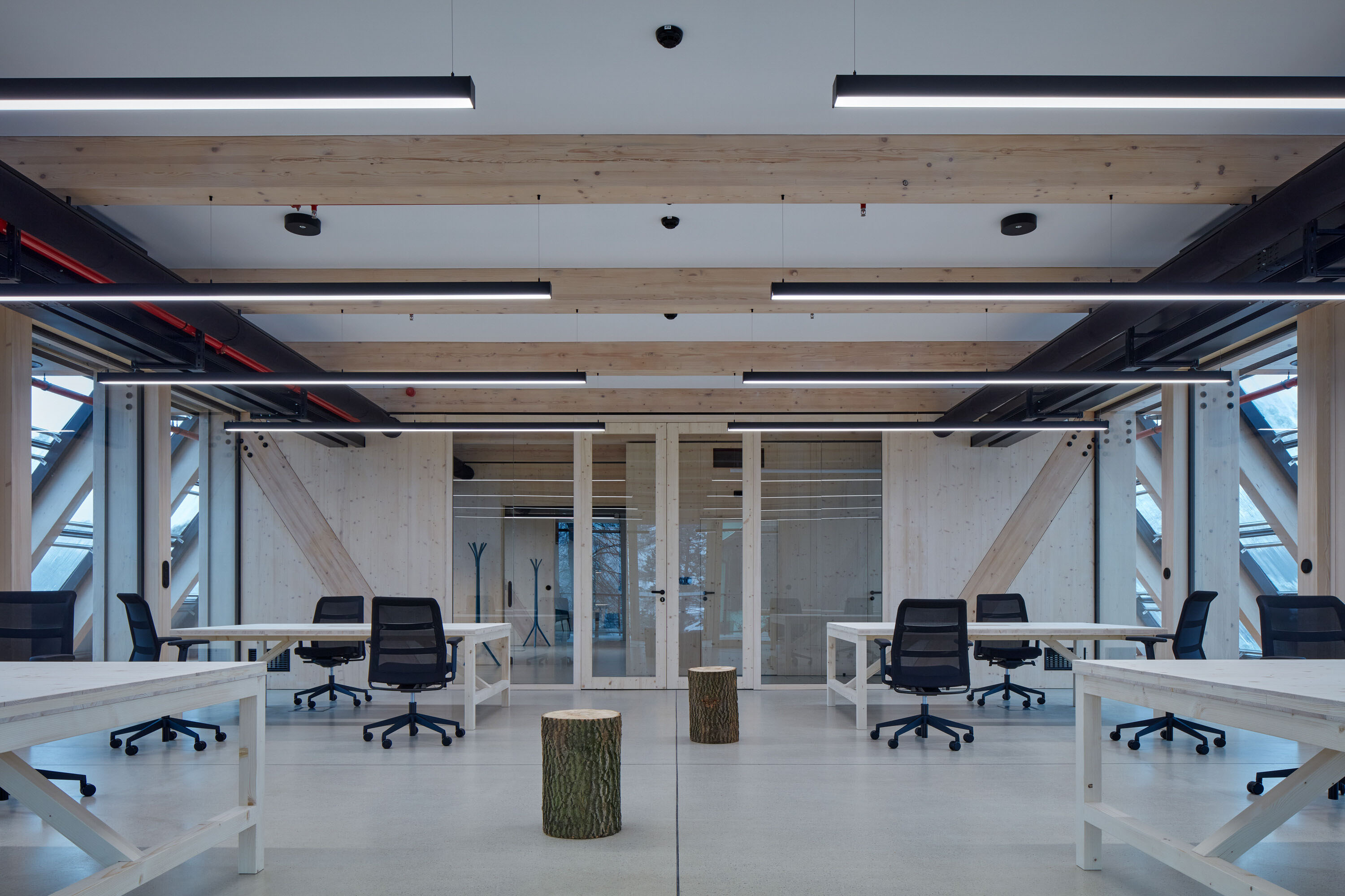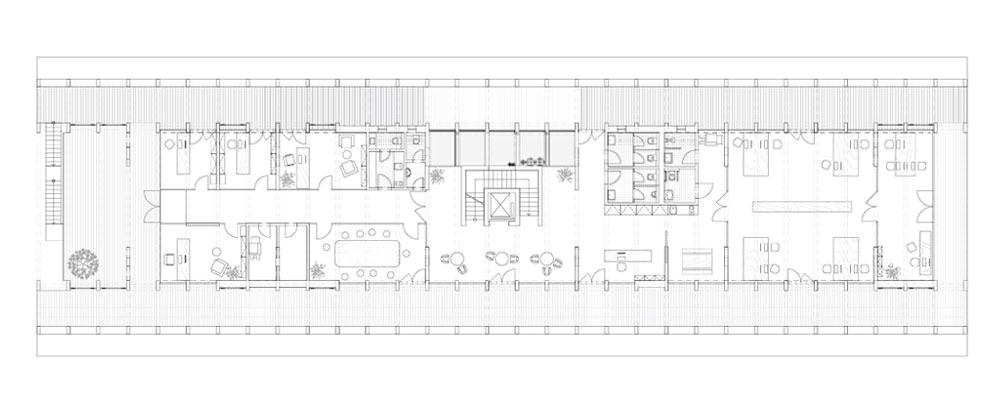 The primary internal load-bearing structure of the building forms the modular envelope of the building, allowing for flexibility in the use of interior spaces, even as the headquarters experiences rapid growth. The load-bearing structure of the building is constructed entirely from timber produced in the nearby Kloboucká lesní factory. Timber, despite being one of the oldest and simplest materials, undergoes a highly modern production process. The company's flagship product, adhesive laminated timber, is used for the building frame, and the repeated traditional frame shapes visible on the exterior create a long and elegant volume.