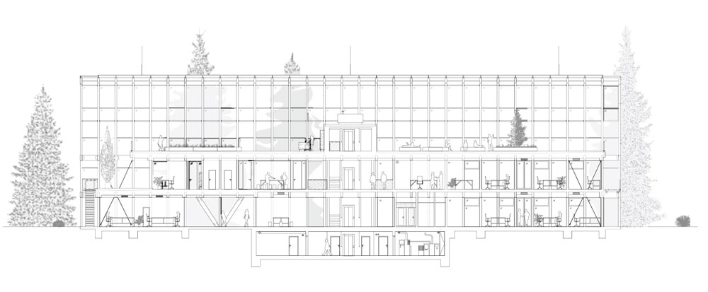 The primary internal load-bearing structure of the building forms the modular envelope of the building, allowing for flexibility in the use of interior spaces, even as the headquarters experiences rapid growth. The load-bearing structure of the building is constructed entirely from timber produced in the nearby Kloboucká lesní factory. Timber, despite being one of the oldest and simplest materials, undergoes a highly modern production process. The company's flagship product, adhesive laminated timber, is used for the building frame, and the repeated traditional frame shapes visible on the exterior create a long and elegant volume.