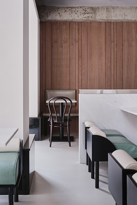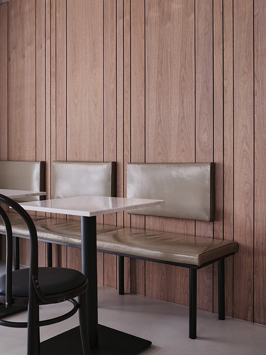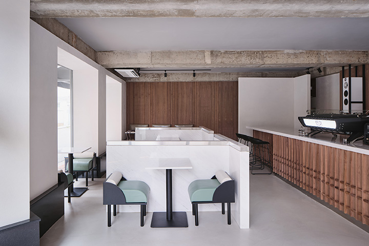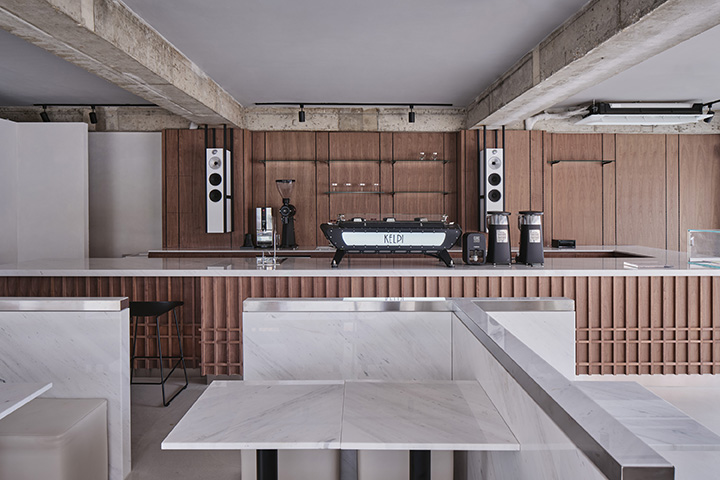 Located in Mangwon-dong, KELPI is a cafe that quietly reveals its presence. STUDIO GIMGEOSIL, who was in charge of the design, naturally matched detailed elements against a calm background, creating a clean and powerful space. Walnut-patterned wood is used in some areas of the interior and exterior that are cleanly finished in black and white to feel the warmth. In addition, the fan-shaped shape was used as a point element and chairs of various colors and designs were properly arranged to complete the non-monotonous space. You can see the sophisticated and serious KELPI through the cute Mangridan-gil alleys. The eye-catching sign from the entrance is boldly designed with black-colored stone, giving off a concise and weighty atmosphere. The door handle was made in the shape of a fan and gave some wit to the somewhat serious-looking entrance. When you come inside, various details are stably combined to reveal a subtle charm that you won't get tired of for a long time. Overall, a simple space with a black and white connection and a walnut pattern with a vertical line added a classic look. The long bar space on the right side was finished with walnut-patterned wood, and the grid-patterned point was given to the bottom of the table to accentuate the traditional feeling. It gave uniformity in black and white colors so that the pattern neck did not stand out and harmonized well, with a white marble top on the bar table and a black-colored chair at one end of the table. In addition, two white Bowers & Wilkins speakers hanging from a black frame harmonize with the patterned neck wall. The hall space, located opposite the bar, created a private atmosphere by dividing seats into two T-shaped partitions with white natural marble and stainless steel. The fan-shaped individual chairs placed in the hall revitalize the space while properly balancing them with black frames on the mint leather sofa. The seat on the wall of the walnut patterned neck shows a soft blend of vintage design with brown colored chairs and built-in sofas.