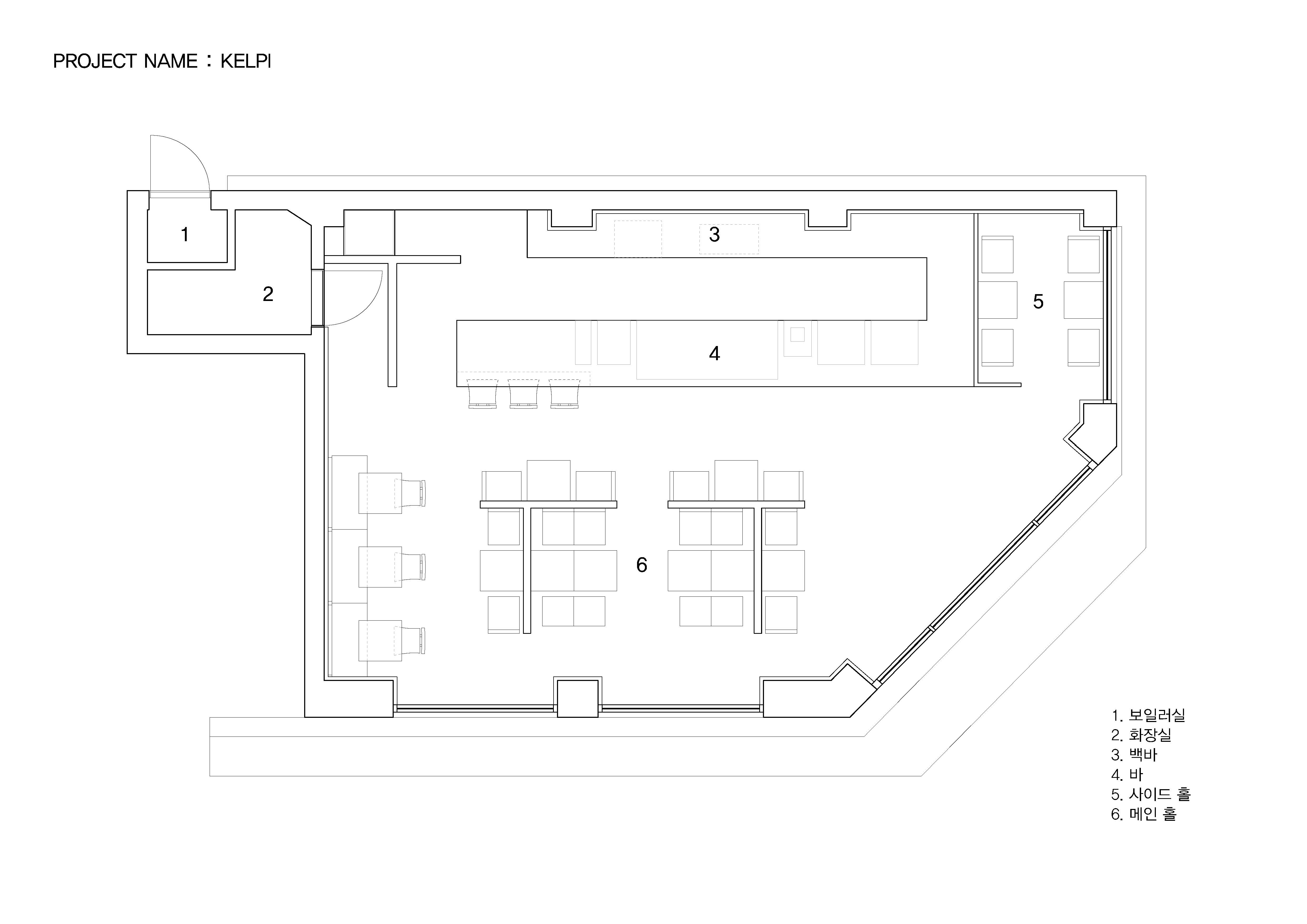 망원동에 위치한 KELPI는 조용히 존재감을 드러내는 카페다. 디자인을 담당한 STUDIO GIMGEOSIL은 차분한 배경에 디테일 요소를 자연스럽게 매치하면서 깔끔하고 힘 있는 공간을 연출했다. 블랙 앤 화이트로 깨끗하게 마감한 내외부 인테리어 일부 영역에 월넛 무늬목을 사용해 온기가 느껴지도록 했다. 또한 포인트 요소로 부채꼴 형태를 활용하고 다양한 색감과 디자인의 의자를 적절히 배치함으로써 단조롭지 않은 공간을 완성했다. 아기자기한 망리단길 골목 사이로 세련되고 진중한 모습의 KELPI를 볼 수 있다. 입구에서부터 시선을 사로잡는 간판은 블랙 컬러 석재로 볼드하게 디자인해 간결하고 무게감 있는 분위기를 풍긴다. 출입구 손잡이는 부채꼴 형태로 제작했는데 다소 진지해 보이는 입구에 약간의 위트를 준것이다. 내부로 들어오면 여러 디테일이 안정감 있게 어우러져 오래도록 질리지 않는 은은한 매력이 드러난다. 전체적으로 블랙 앤 화이트 연결감의 심플한 공간에 세로선이 가미된 월넛 무늬목으로 클래식한 멋을 더했다. 오른쪽에 길게 이어지는 바 공간은 월넛 무늬목으로 마감했고 테이블 아래쪽 무늬목에 격자무늬 포인트를 주면서 전통적인 느낌을 살렸다. 무늬목이 튀지 않고 잘 어우러지도록 블랙 앤 화이트 색감으로 통일성을 주었는데 바 테이블 위에 화이트 대리석 상판을 올리고 테이블 한쪽 끝에는 블랙 컬러 의자를 두었다. 또한 블랙 프레임에 매달린 화이트 Bowers & Wilkins 스피커 두 대가 무늬목 벽체와 조화를 이룬다. 바 맞은편에 위치한 홀 공간은 화이트 천연 대리석과 스테인리스 스틸을 적용한 두 개의 T자형 파티션으로 좌석을 나눠 프라이빗한 분위기를 조성했다. 홀에 배치된 부채꼴 모양의 개성 있는 의자는 민트 가죽 소파에 블랙 프레임으로 적절히 균형을 유지하면서 공간에 활력을 불어넣는다. 월넛 무늬목 벽 쪽에 위치한 좌석은 빈티지한 디자인에 갈색 계열 색감을 적용한 의자와 붙박이 소파로 부드러운 어울림을 보여준다.