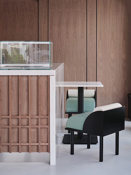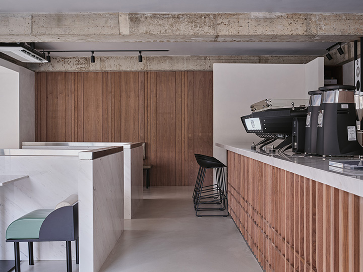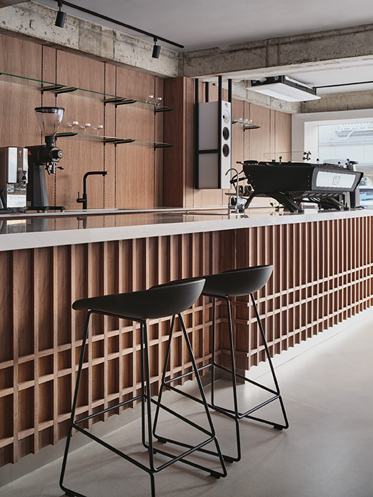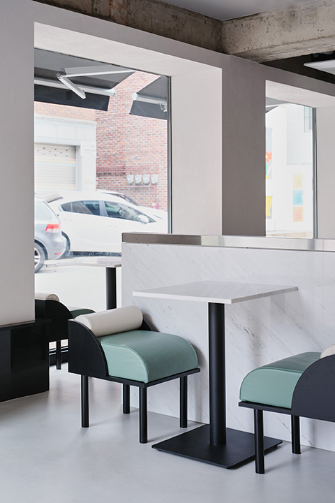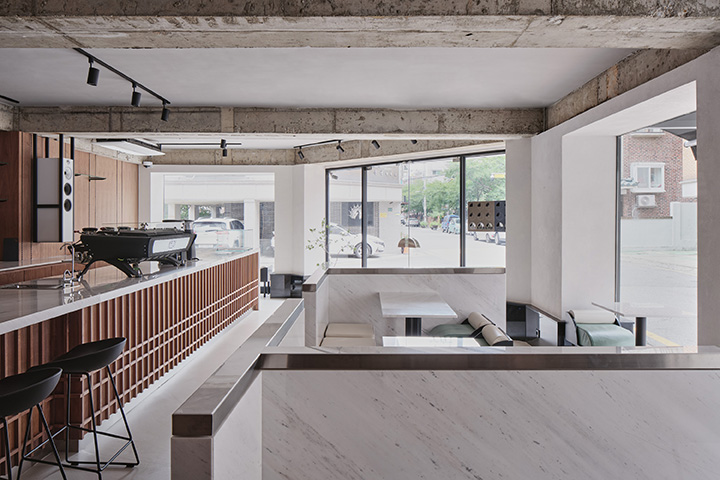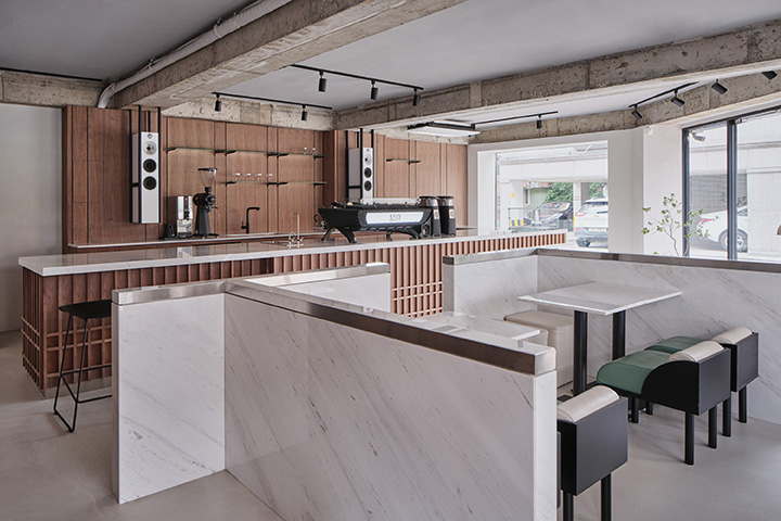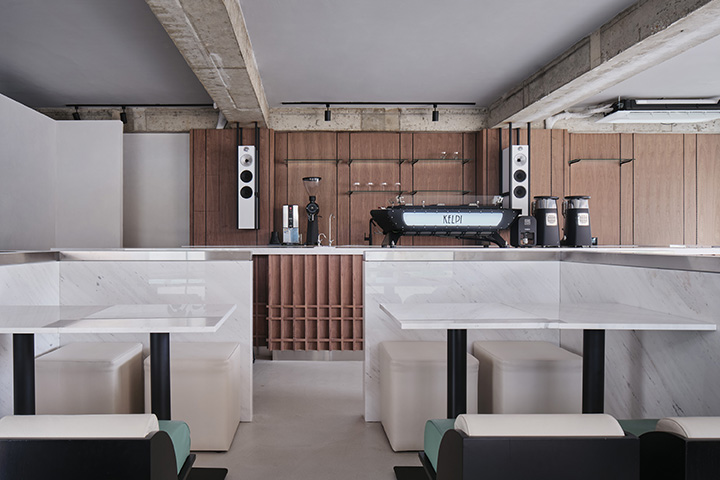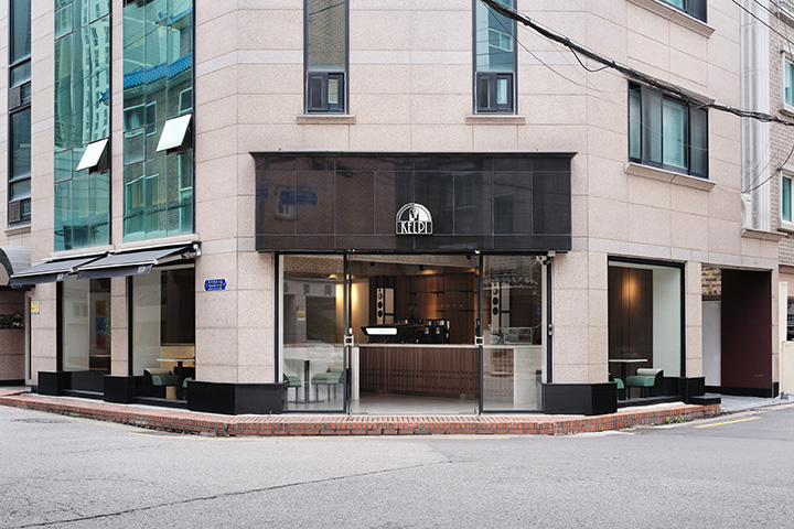 Located in Mangwon-dong, KELPI is a cafe that quietly reveals its presence. STUDIO GIMGEOSIL, who was in charge of the design, naturally matched detailed elements against a calm background, creating a clean and powerful space. Walnut-patterned wood is used in some areas of the interior and exterior that are cleanly finished in black and white to feel the warmth. In addition, the fan-shaped shape was used as a point element and chairs of various colors and designs were properly arranged to complete the non-monotonous space. You can see the sophisticated and serious KELPI through the cute Mangridan-gil alleys. The eye-catching sign from the entrance is boldly designed with black-colored stone, giving off a concise and weighty atmosphere. The door handle was made in the shape of a fan and gave some wit to the somewhat serious-looking entrance. When you come inside, various details are stably combined to reveal a subtle charm that you won't get tired of for a long time. Overall, a simple space with a black and white connection and a walnut pattern with a vertical line added a classic look. The long bar space on the right side was finished with walnut-patterned wood, and the grid-patterned point was given to the bottom of the table to accentuate the traditional feeling. It gave uniformity in black and white colors so that the pattern neck did not stand out and harmonized well, with a white marble top on the bar table and a black-colored chair at one end of the table. In addition, two white Bowers & Wilkins speakers hanging from a black frame harmonize with the patterned neck wall. The hall space, located opposite the bar, created a private atmosphere by dividing seats into two T-shaped partitions with white natural marble and stainless steel. The fan-shaped individual chairs placed in the hall revitalize the space while properly balancing them with black frames on the mint leather sofa. The seat on the wall of the walnut patterned neck shows a soft blend of vintage design with brown colored chairs and built-in sofas.