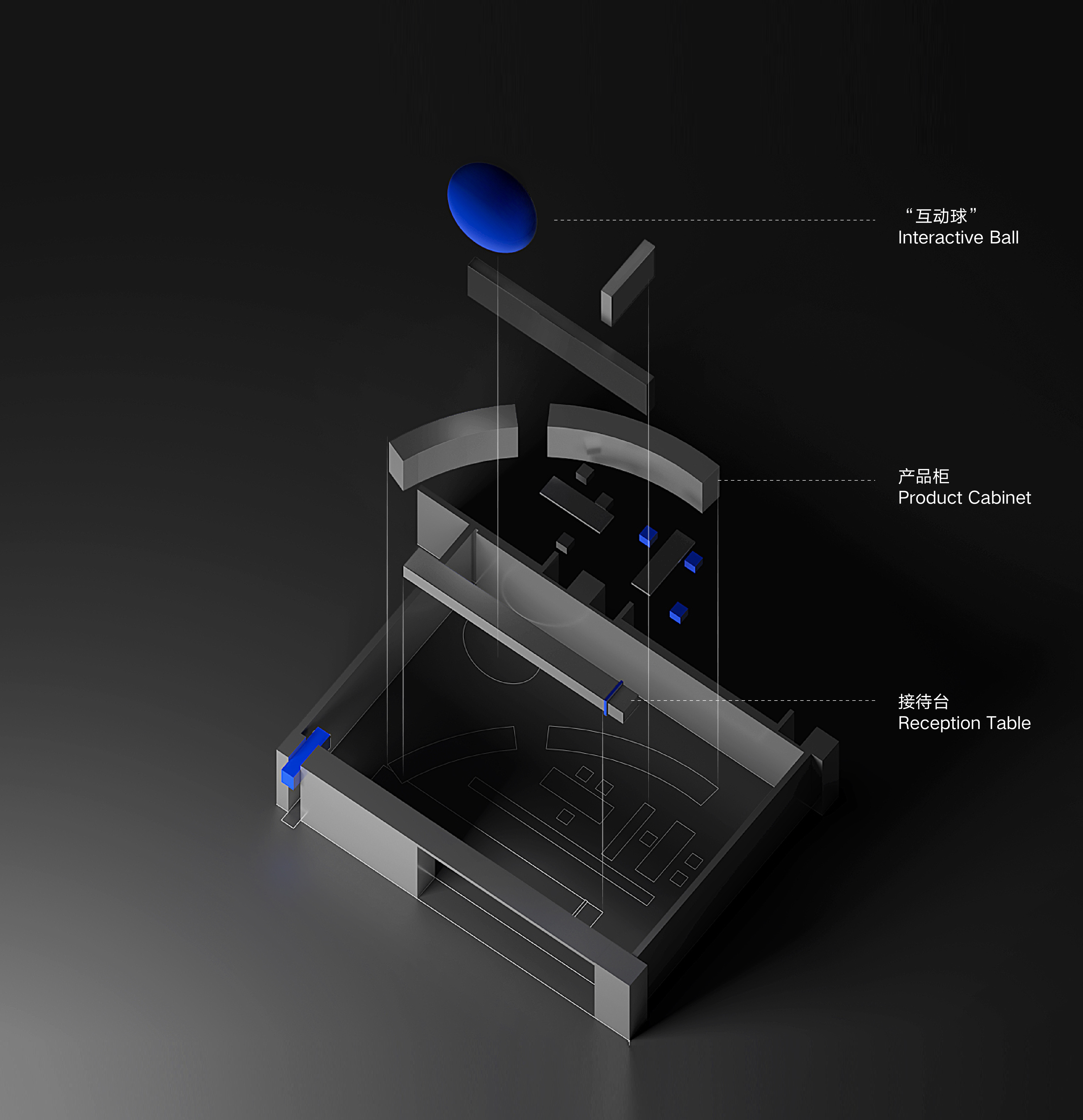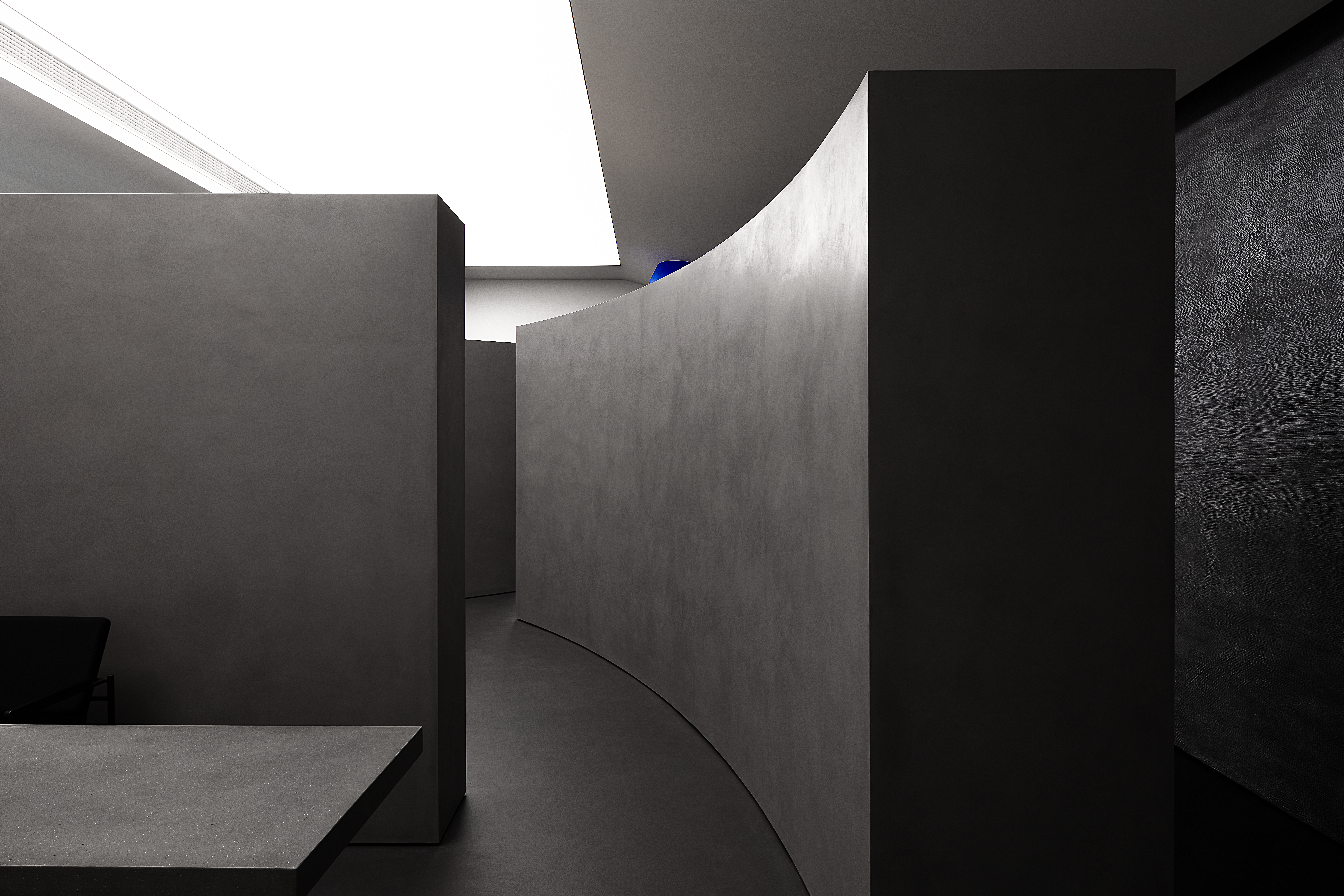 이 프로젝트는 유동인구가 적은 쇼핑몰의 모서리에 위치한다. 노바컬러(Novacolor)는 이탈리아의 긴 역사를 지닌 친환경 미네랄 페인트 개발회사다. 디자인팀은 200개의 페인트 질감과 색상들을 180m2 공간에서 조화롭게 전시하고 눈길을 사로잡는 전시와 환상적인 경험을 통해 더 많은 손님들의 발길을 이끄는 것을 목표로 작업했다. 작은 입구는 다른 감성과 분위기의 공간으로 들어간다는 암시이며, 사람들의 흥미와 상상력을 자극하는 요소이다. 상단에 매달린 파란 타원체는 평면의 곡선을 따라 반복되며, 힘의 강력한 감각을 만들어낸다. 유연한 공간은 구에 의해 나눠진다. 리셉션 데스크에 새겨진 파란색 타원체와 파란 접시 형태는 혼자 있기를 좋아하는 두 사람이 귓속말을 하는 것처럼 보이며, 균형 잡힌 느낌을 형성한다.