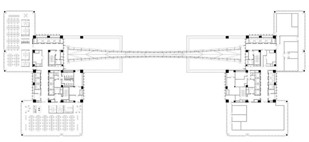DJI 회사의 창업자 Frank Wang은 모든 직원의 성장과 복지에 큰 관심을 기울이며, 실용적이면서 기쁨을 줄 수 있는 작업 환경을 마련하고자 했다. 이러한 대표의 이념에 따라 DJI 스카이시티는 발전, 지혜, 가능성을 새로이 높이고 사회에 환원할 수 있는 솔루션에 대한 영감을 줄 수 있는 공간이 되었다. 건축가는 주요 연구 및 혁신 센터의 역할을 할 수 있도록 건물의 내부 공간을 설계하였다. 두 개의 타워는 각각 사무 공간과 연구 공간으로 사용되며 고도 105m, 길이 90m의 현수교로 연결되어 있다. 이는 두 타워의 볼륨 사이에서 우아한 연결고리를 만든다. 내부에는 사무실, 연구실, 시험 비행 공간, 직원 교육실 및 공공시설이 포함되어 있다. 각각 타워의 볼륨은 메가트러스 공법과 원형으로 프로파일 된 강철 서스펜션 로드로 이루어진 캔틸레버로 구성되어 독특한 느낌을 준다. 초고층 규모의 건물에서 비대칭 형태의 강철 서스펜션 구조를 혁신적으로 사용함으로써 기둥을 최소화였고 두 공간의 영역이 연속되도록 인상적인 외관을 만들어냈다. 또한, 기둥이 없는 높은 층고의 스튜디오를 형성하여 실내에서도 드론 제품을 개발하고 테스트할 수 있는 공간을 만들어냈다. 이러한 스튜디오 공간은 DJI 스카이시티의 독특한 정체성을 강조하는 V 형상의 트러스를 통해 외부에서 볼 수 있도록 표현되었다. 이는 도시의 스카이라인을 배경으로 타워에 두드러지는 정체성을 부여한다.