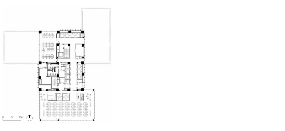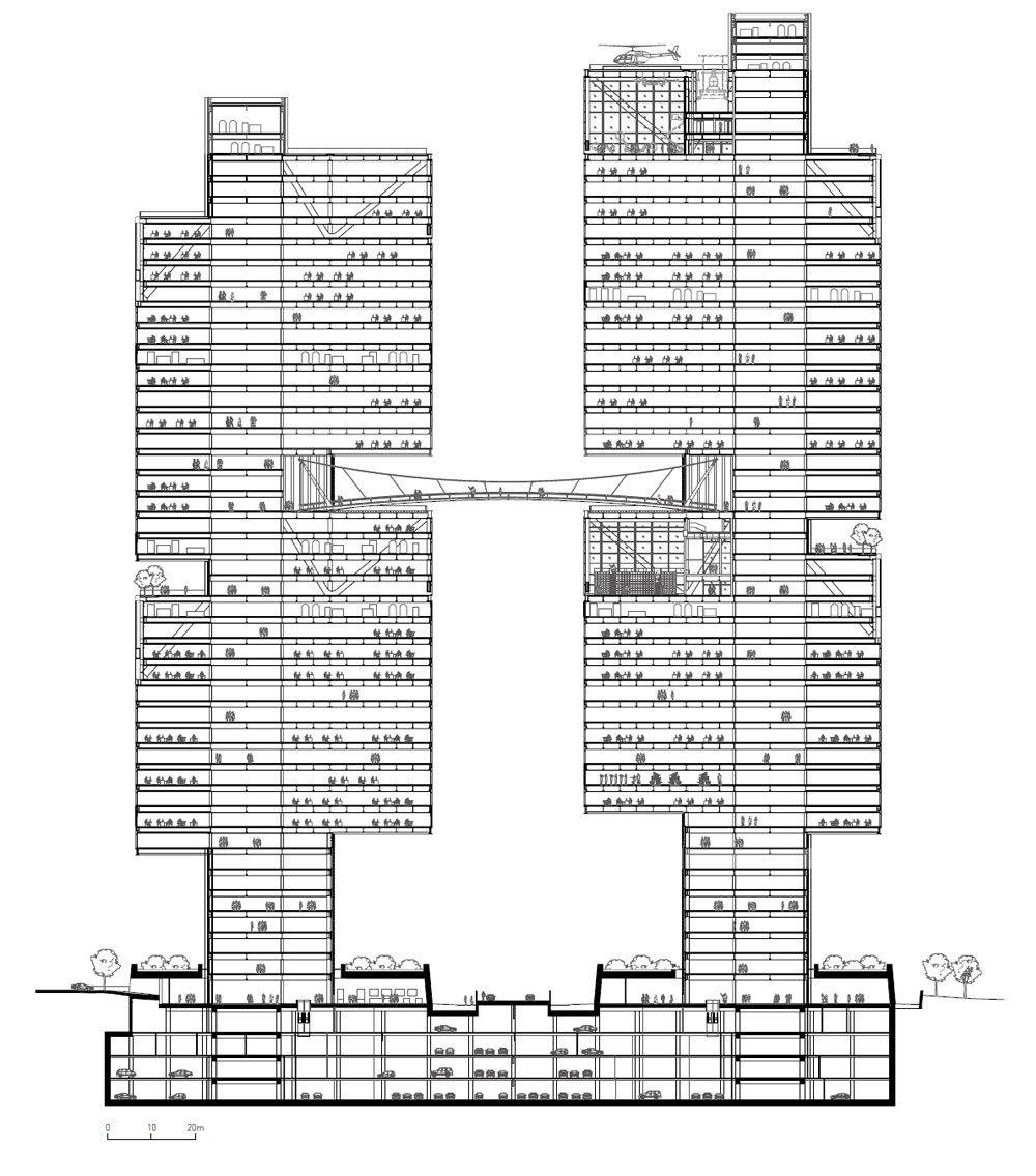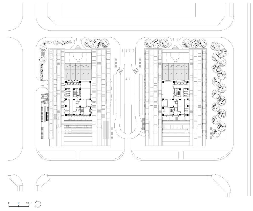 1층의 높이에서 띄워진 볼륨은 주변부의 경사진 녹색 정원으로부터 건물 바닥까지 녹지를 끌어들이는 역할을 한다. 또한, 1층은 지역 보건소 등의 공공시설을 갖추고 있어 모든 이들에게 열린 개방적인 공간으로 디자인되었다. 이로써 DJI 스카이시티가 도시 환경을 존경하고 지역 사회에 기여하는 역할을 하도록 한다. 타워의 각각 볼륨의 옥상에는 스카이가든이 마련되어 직원들이 활용할 수 있는 실외 공간을 제공한다.