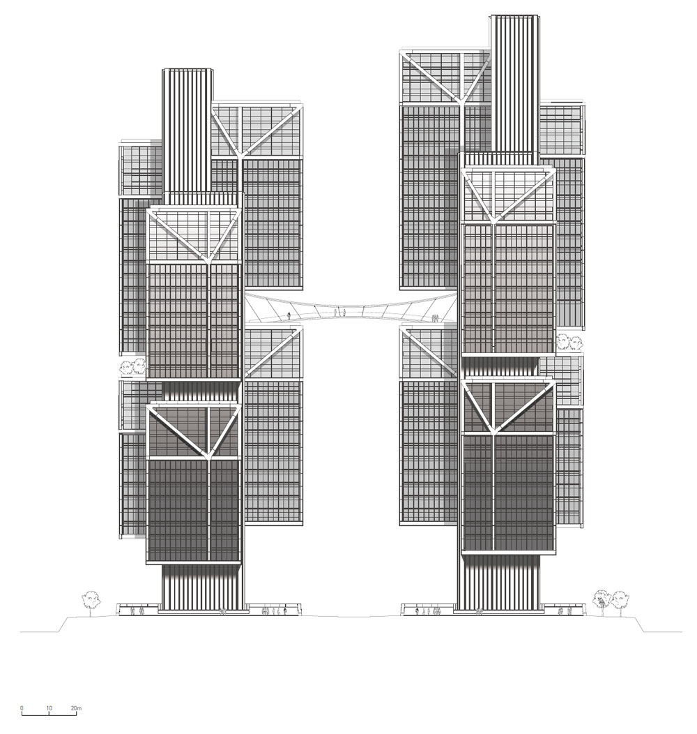 DJI 회사의 창업자 Frank Wang은 모든 직원의 성장과 복지에 큰 관심을 기울이며, 실용적이면서 기쁨을 줄 수 있는 작업 환경을 마련하고자 했다. 이러한 대표의 이념에 따라 DJI 스카이시티는 발전, 지혜, 가능성을 새로이 높이고 사회에 환원할 수 있는 솔루션에 대한 영감을 줄 수 있는 공간이 되었다. 건축가는 주요 연구 및 혁신 센터의 역할을 할 수 있도록 건물의 내부 공간을 설계하였다. 두 개의 타워는 각각 사무 공간과 연구 공간으로 사용되며 고도 105m, 길이 90m의 현수교로 연결되어 있다. 이는 두 타워의 볼륨 사이에서 우아한 연결고리를 만든다. 내부에는 사무실, 연구실, 시험 비행 공간, 직원 교육실 및 공공시설이 포함되어 있다. 각각 타워의 볼륨은 메가트러스 공법과 원형으로 프로파일 된 강철 서스펜션 로드로 이루어진 캔틸레버로 구성되어 독특한 느낌을 준다. 초고층 규모의 건물에서 비대칭 형태의 강철 서스펜션 구조를 혁신적으로 사용함으로써 기둥을 최소화였고 두 공간의 영역이 연속되도록 인상적인 외관을 만들어냈다. 또한, 기둥이 없는 높은 층고의 스튜디오를 형성하여 실내에서도 드론 제품을 개발하고 테스트할 수 있는 공간을 만들어냈다. 이러한 스튜디오 공간은 DJI 스카이시티의 독특한 정체성을 강조하는 V 형상의 트러스를 통해 외부에서 볼 수 있도록 표현되었다. 이는 도시의 스카이라인을 배경으로 타워에 두드러지는 정체성을 부여한다.