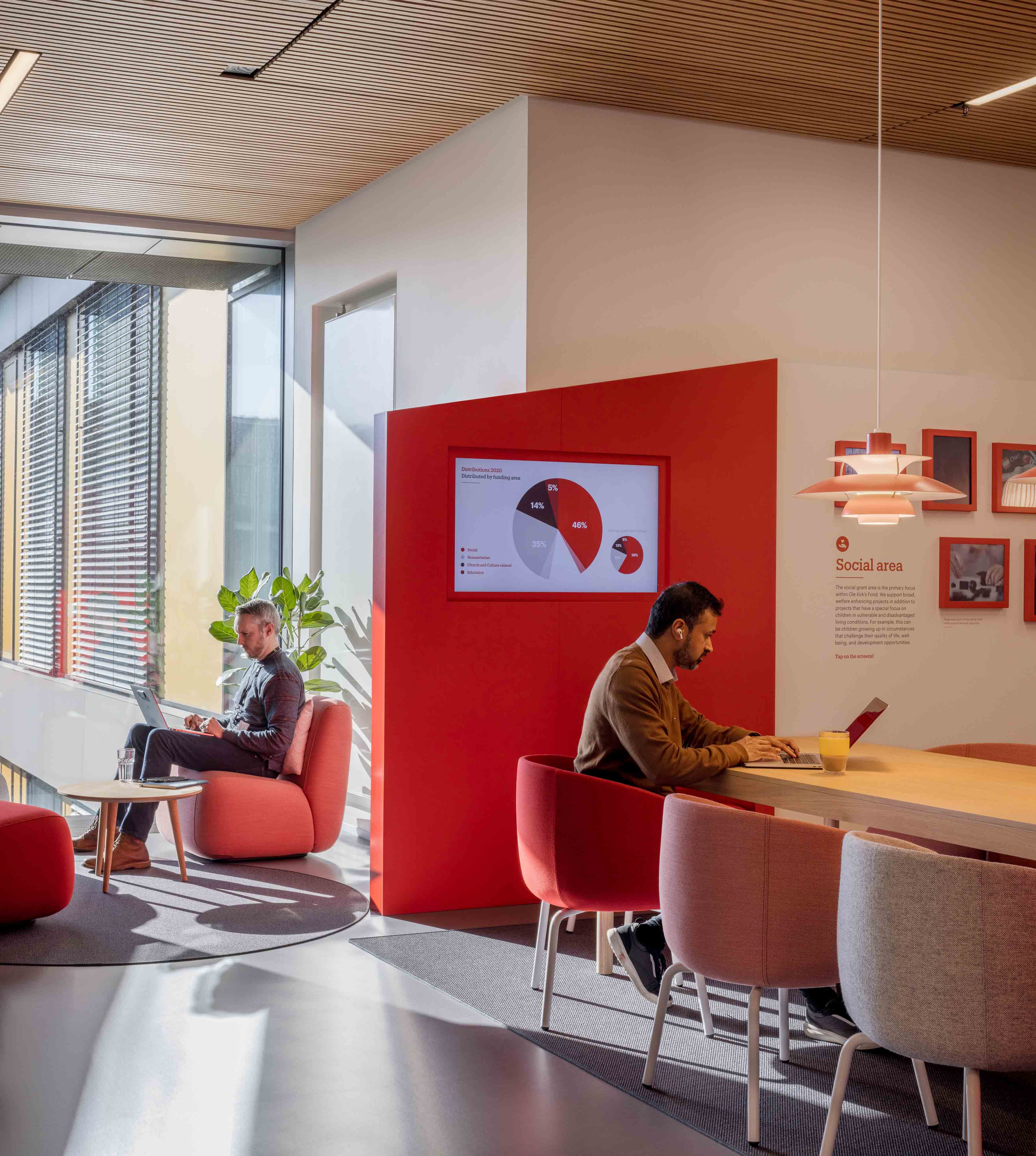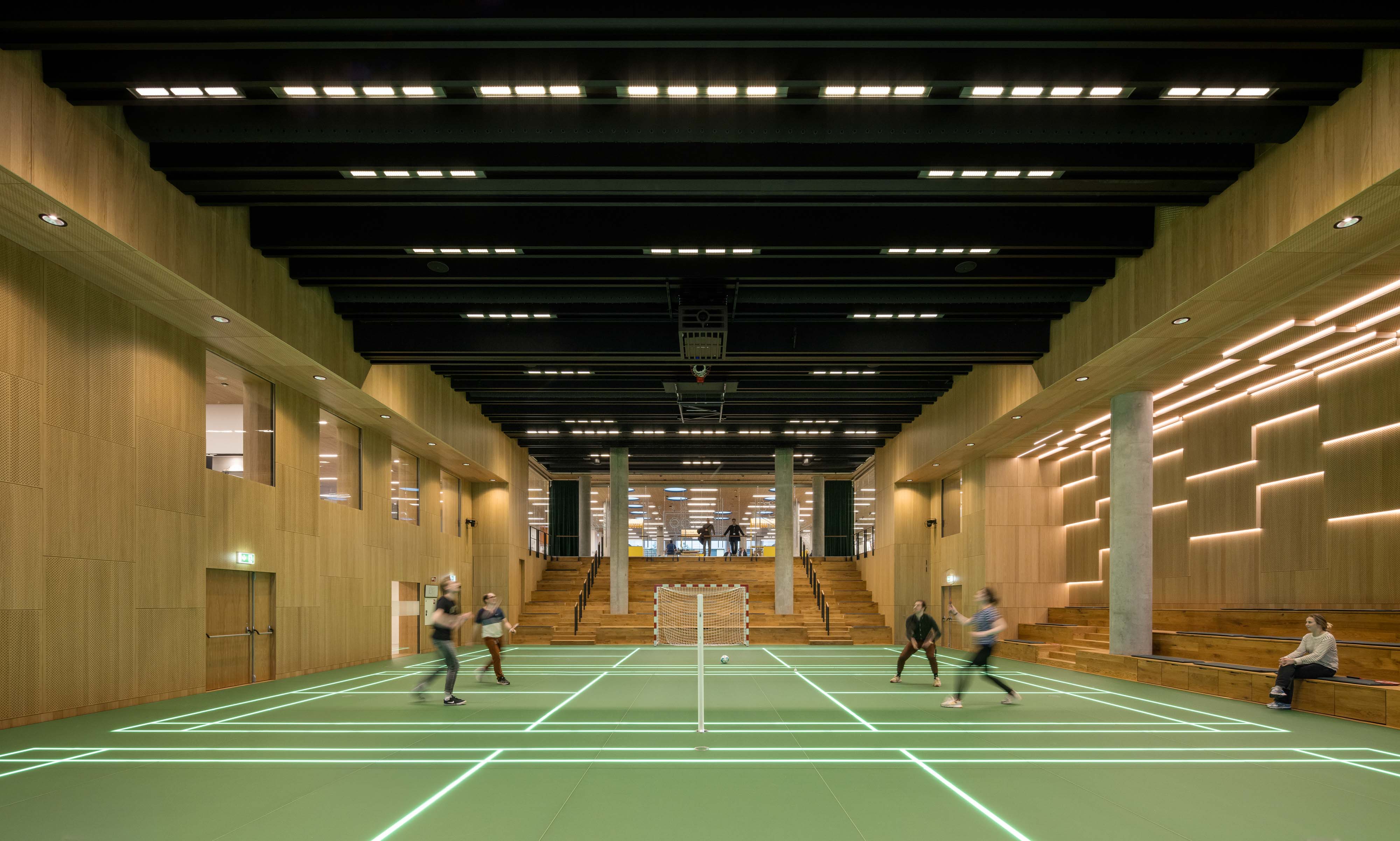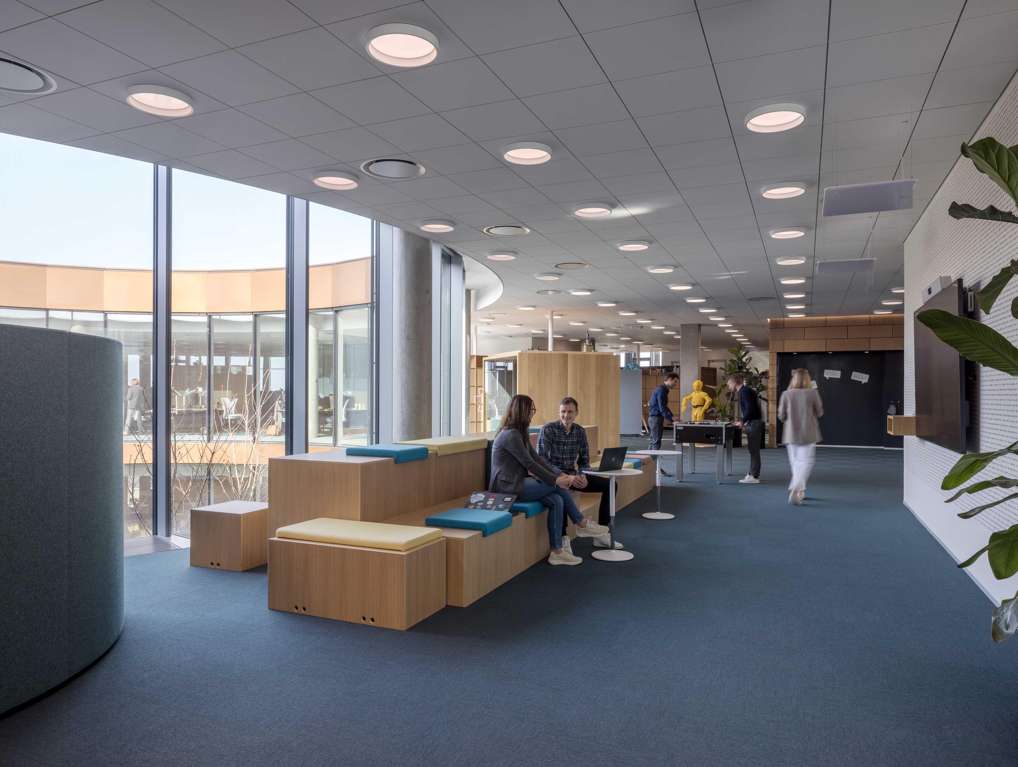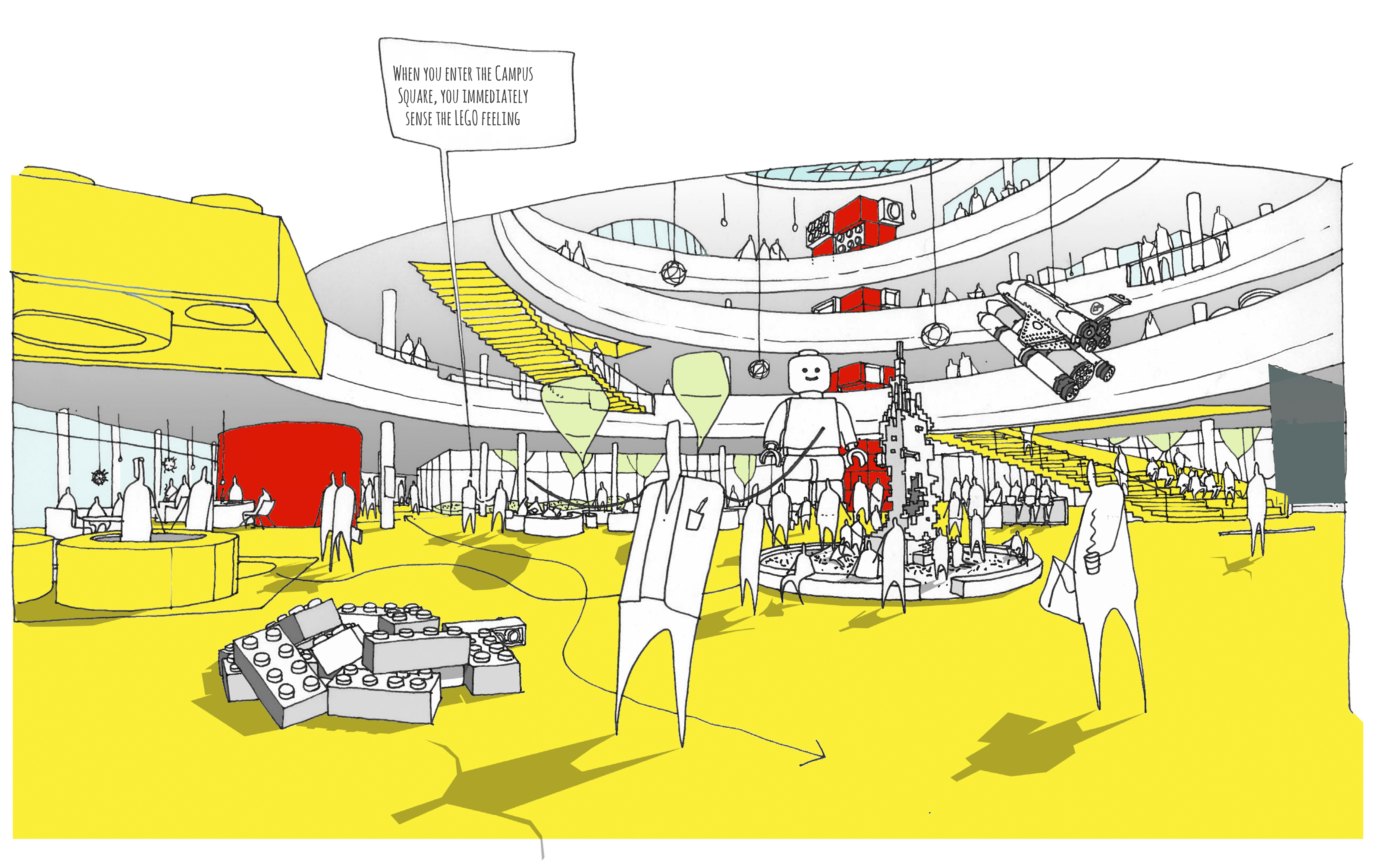 1층의 ‘피플 하우스’는 문화·활동의 허브이며 스포츠 홀, 이벤트 공간, 숙박시설 등 사회의 다양성과 신체 활동을 위한 공유 시설로 구성되어 있다. 레고 캠퍼스의 여러 협업 공간은 편안하고 영감을 주는 분위기를 조성한다. 상층부에는 창의성과 혁신을 지원하기 위한 다양한 작업 공간과 놀이 활동 공간이 있다. 각각의 건물이 겹치는 일부에 위치한 채도가 높고 밝은 색상의 계단실 공간은 소셜 네트워크의 요소를 이루는 사람과 각각의 부서를 연결하고 웨이파인딩(wayfinding)을 지원하는 역할을 한다. 건축물의 파사드는 내부로 들어오는 일광을 통해 열효율을 최대화하여 냉난방 시설의 요구사항을 최소화하도록 설계되었다. 또한, 건물의 모티프 중 하나인 대형 레고 블록을 연상시키는 장난스럽고 아름다운 외관을 만든다. 두 개의 거대한 레고 블록의 최상부에는 회의 공간이 마련되었다.