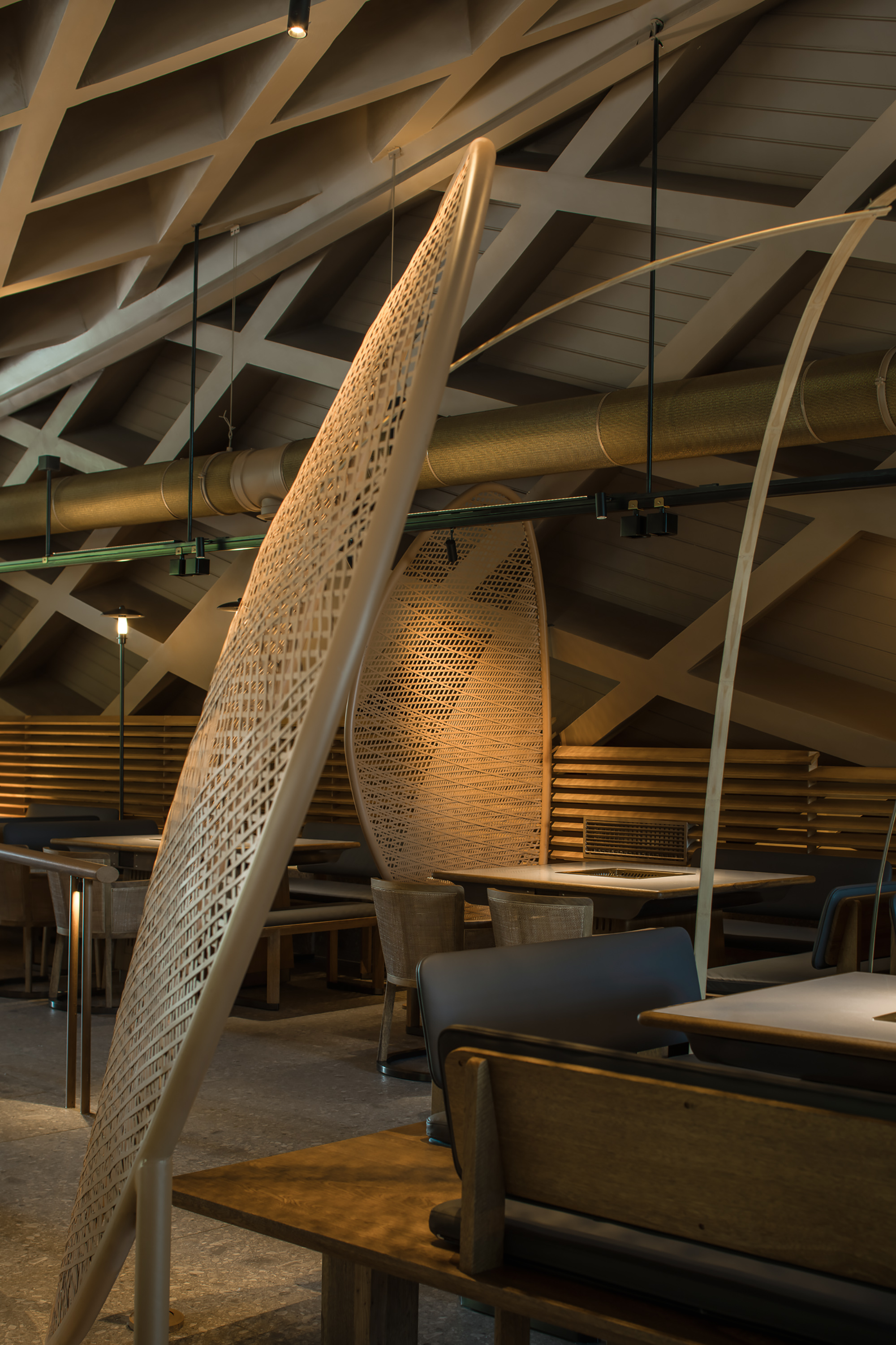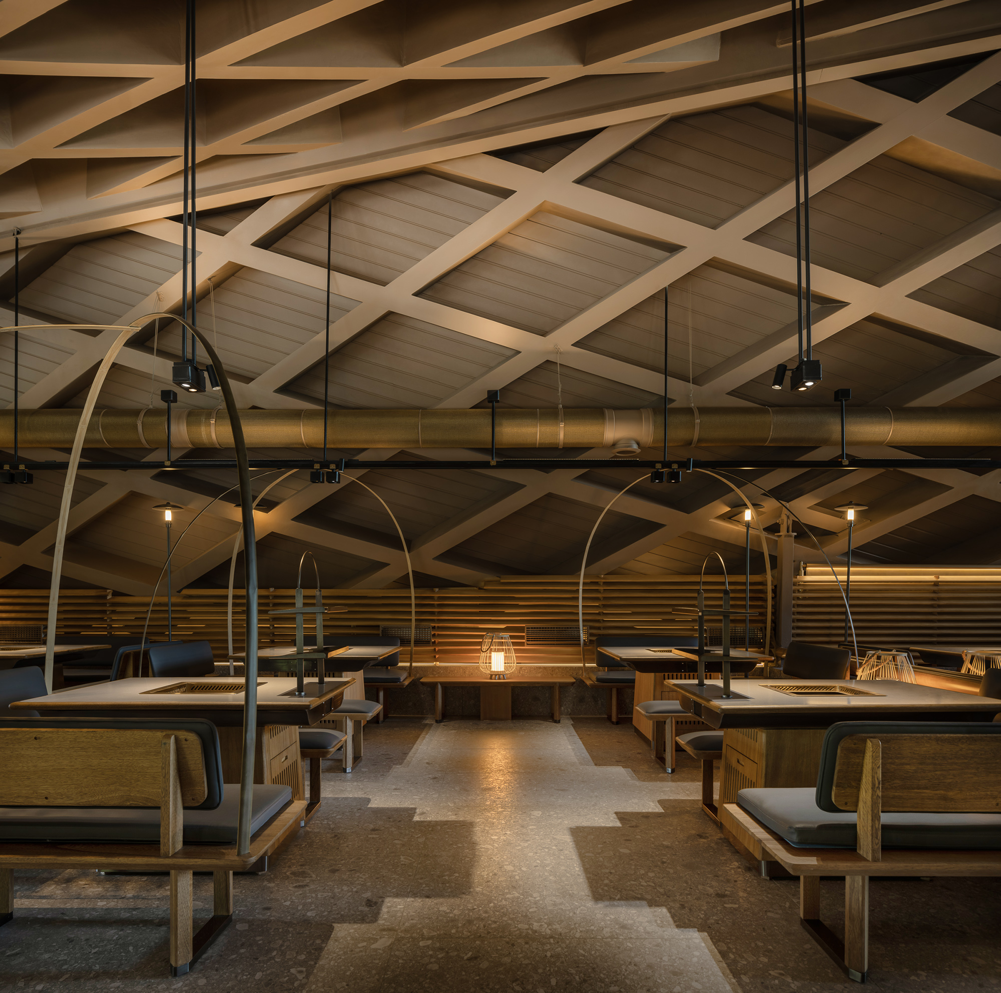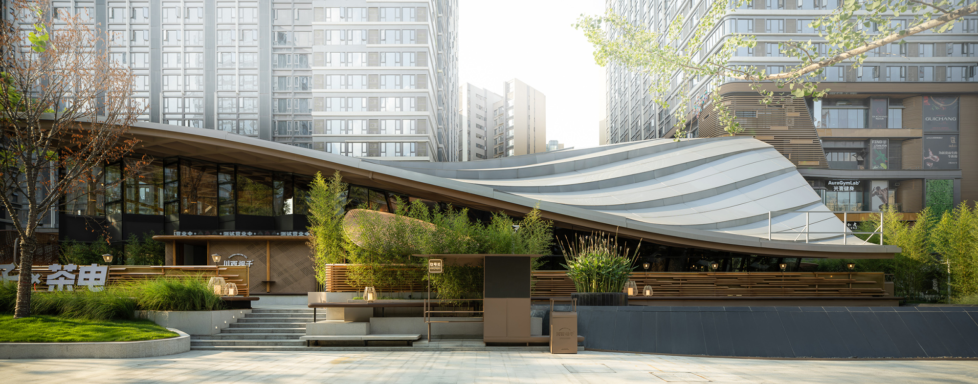 중국 서부 쓰촨은 풍부하고 비옥한 땅을 가지고 있는 곳으로, 이곳의 사람들은 일 년 내내 특별한 식탁을 차린다고 한다. 쓰촨 자오쯔 거리에 있는 이 독특한 공간은 촨시바쯔 훠궈의 새로운 레스토랑이다. 유선형의 기울어진 지붕 디자인은 사람들에게 목가적이고 아늑한 삶을 꿈꾸게 한다. 대나무로 짜인 수공예 자재들은 쓰촨성 서부 전문가들이 직접 만든 것이다. 디자이너는 다양한 대나무 짜임의 패턴들로 내부 공간을 더욱 풍성하게 만들어냈고, 훠궈를 즐기기 위해 방문한 사람들에게 미각적.시각적 유희할 요소를 만들었다. 폐쇄적이면서도 자유로운 배치 구조는 레스토랑만의 규칙을 따른다. 입구와 야외의 관계, 디자인의 초점, 구조는 어우러지며 사람들을 끌어들인다.