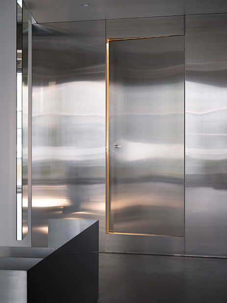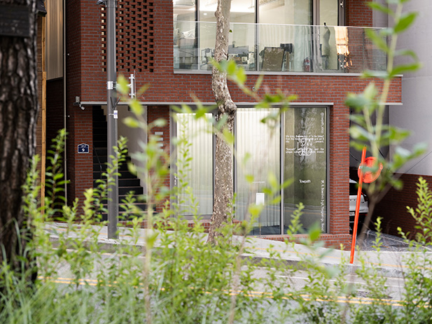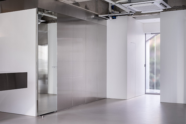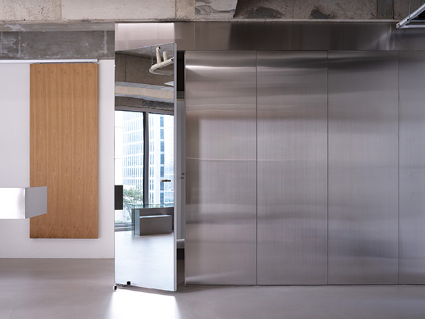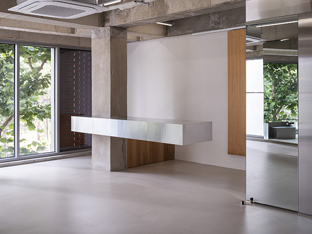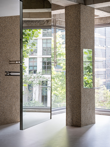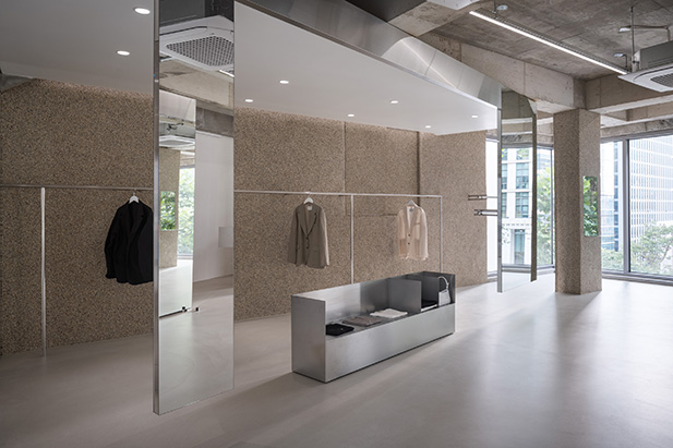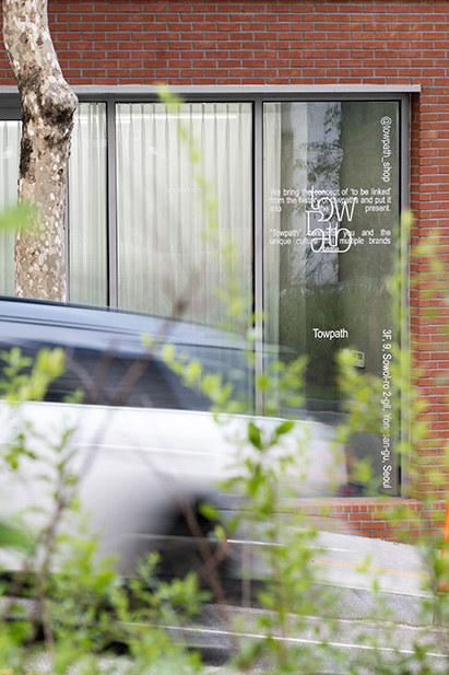 프로젝트에서 가장 중요한 점은 외부의 푸르른 경관을 내부로 풍성하게 들여오는 것이었다. 주어진 공간은 전면이 통창으로 구성돼 외부 조경이 한눈에 들어오는 형태였기에, 공간 가장자리에 중점적으로 디스플레이 존을 구현하고 자연스럽게 흐르는 동선을 마련해 사람들이 풍경을 감상하며 여유롭게 둘러보도록 신경 썼다. 아울러 직선을 부각한 조형 위주로 공간 요소를 삼고 탁 트인 내부를 시원하게 가로지르거나 교차하게끔 구성해 미니멀한 무드임에도 공간감은 무척 입체적이다. 입구에 들어서면 일부를 비워 공중에 붕 뜬 것처럼 연출한 디스플레이 존이 좌측으로 길게 뻗어 발길을 이끈다. 매끄럽고 광택 있는 소재를 넓게 시공해 외부에서 들어오는 자연 풍경과 내부 전경을 품어내는데, 천장에서 거울을 떨어뜨리는 형태로 제작하거나 가느다란 라인 형태의 진열대가 벽 사이를 잇게 하는 등 일관된 조형 언어를 창의적으로 조합한 점이 흥미롭다. 아울러 디스플레이 존과 마주한 카운터는 하부를 완전히 비워낸 좁고 긴 형태로 아찔한 감각을 더한다. 보강에 집중해 구조를 구현한 결과 수직 수평의 굵직한 라인이 맞물려 과감한 밸런스를 이루게 만드는 데 성공했다. 이처럼 구조적 미학을 집약한 디스플레이 존과 카운터는 Towpath 호안의 다리에 모티브를 둔 것으로 더욱 뜻깊으며, 그 풍경을 은근하게 묘사하면서 숍의 아이덴티티를 드러낸다.