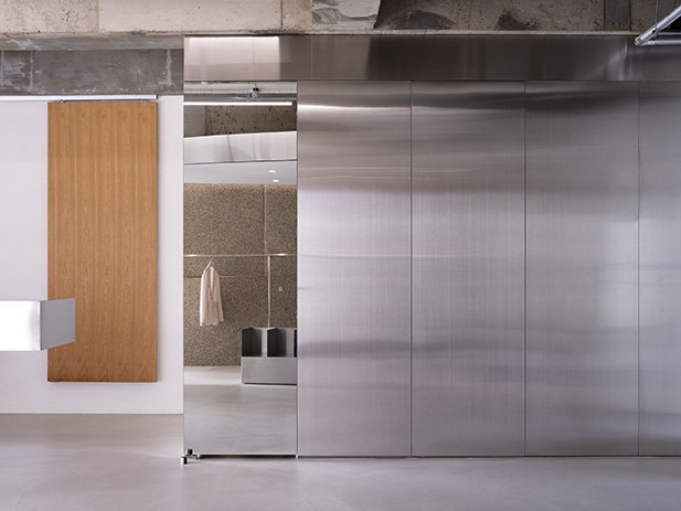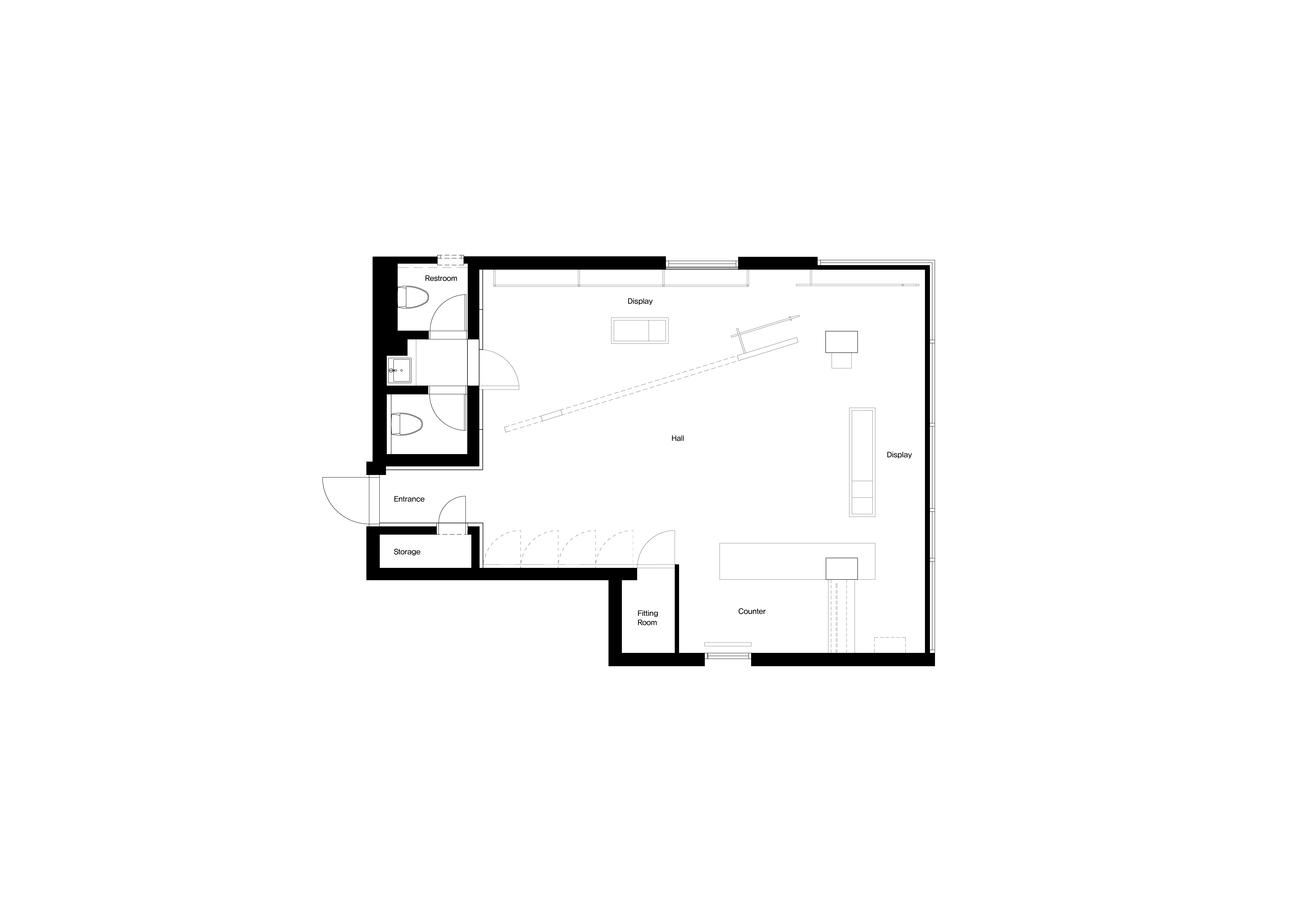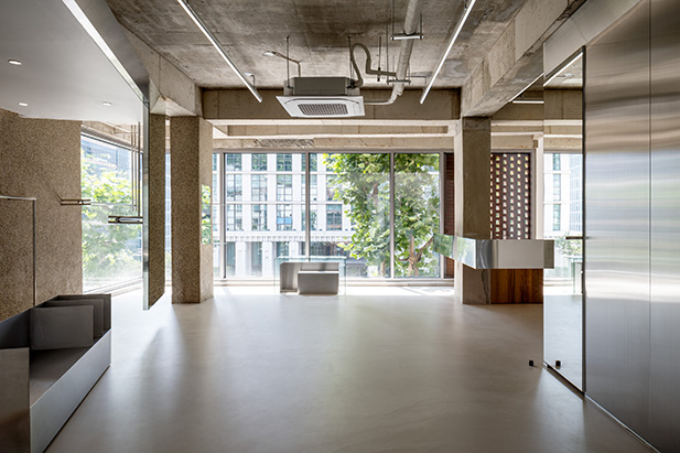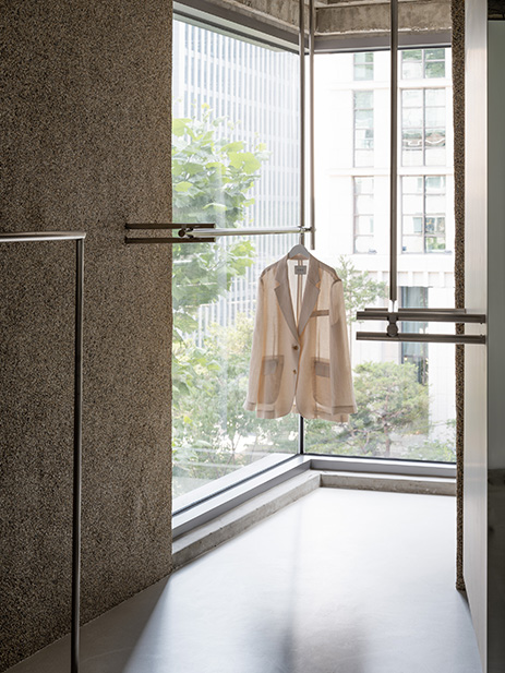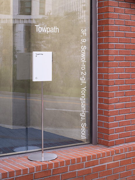 프로젝트에서 가장 중요한 점은 외부의 푸르른 경관을 내부로 풍성하게 들여오는 것이었다. 주어진 공간은 전면이 통창으로 구성돼 외부 조경이 한눈에 들어오는 형태였기에, 공간 가장자리에 중점적으로 디스플레이 존을 구현하고 자연스럽게 흐르는 동선을 마련해 사람들이 풍경을 감상하며 여유롭게 둘러보도록 신경 썼다. 아울러 직선을 부각한 조형 위주로 공간 요소를 삼고 탁 트인 내부를 시원하게 가로지르거나 교차하게끔 구성해 미니멀한 무드임에도 공간감은 무척 입체적이다. 입구에 들어서면 일부를 비워 공중에 붕 뜬 것처럼 연출한 디스플레이 존이 좌측으로 길게 뻗어 발길을 이끈다. 매끄럽고 광택 있는 소재를 넓게 시공해 외부에서 들어오는 자연 풍경과 내부 전경을 품어내는데, 천장에서 거울을 떨어뜨리는 형태로 제작하거나 가느다란 라인 형태의 진열대가 벽 사이를 잇게 하는 등 일관된 조형 언어를 창의적으로 조합한 점이 흥미롭다. 아울러 디스플레이 존과 마주한 카운터는 하부를 완전히 비워낸 좁고 긴 형태로 아찔한 감각을 더한다. 보강에 집중해 구조를 구현한 결과 수직 수평의 굵직한 라인이 맞물려 과감한 밸런스를 이루게 만드는 데 성공했다. 이처럼 구조적 미학을 집약한 디스플레이 존과 카운터는 Towpath 호안의 다리에 모티브를 둔 것으로 더욱 뜻깊으며, 그 풍경을 은근하게 묘사하면서 숍의 아이덴티티를 드러낸다.