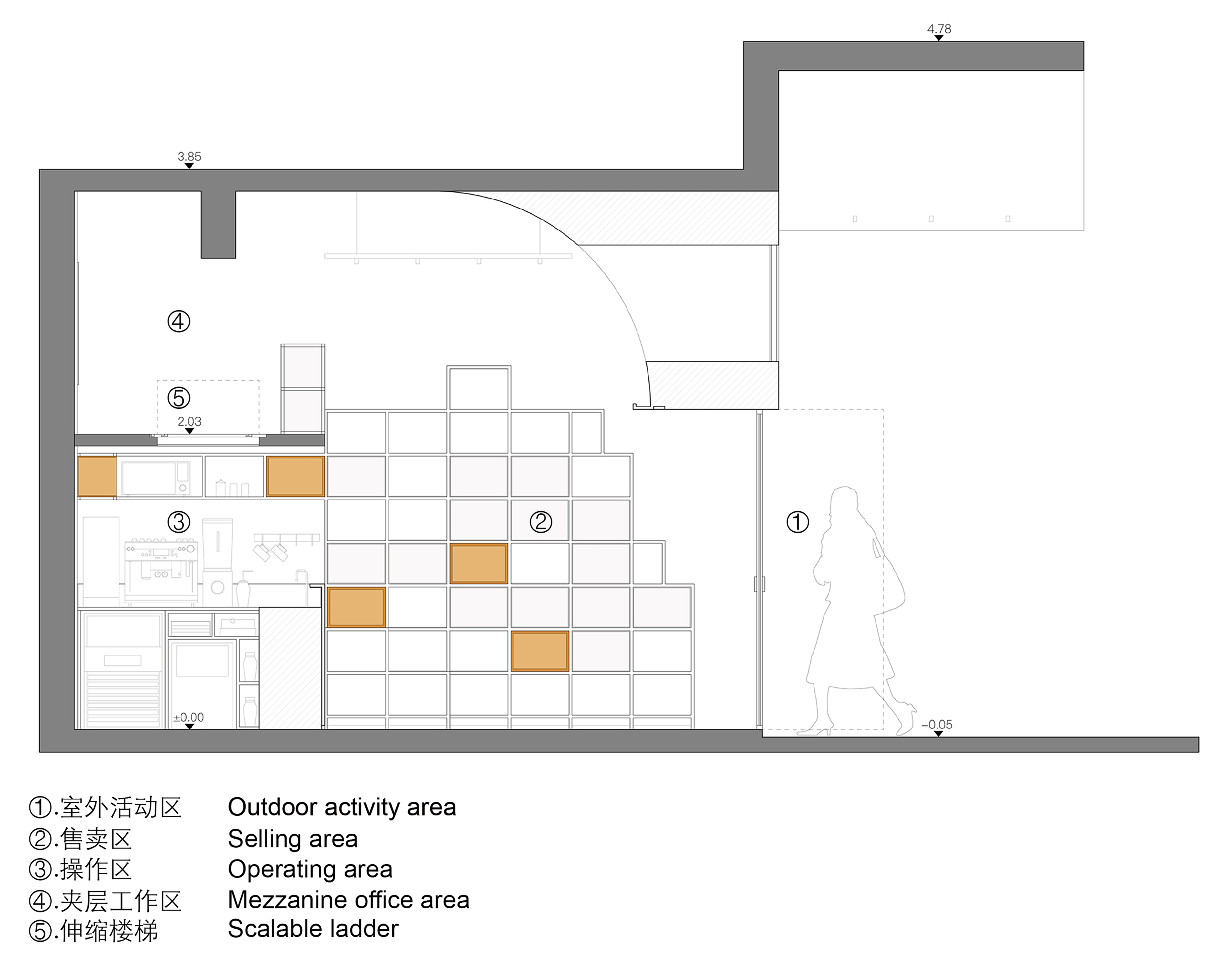 원래 공간은 이 지역의 에어컨 수리점이었다. 부지는 선형적이고 좁으며 너비가 3m 미만인 곳이다. 이 공간의 콘셉트는 멀리서도 쉽게 보이게 하며 동시에 공간 내부에서 즐거운 경험을 만드는 것이 었다. 상점 정면, 즉 외관은 전체 구조 구성에서 최우선 순위다. 내부는 맞춤형 선반과 중이층을 통해 공간 활용 효율을 높였다. 이 프로젝트의 성공 또는 실패를 결정하는 핵심 요소는 단면에 대한 심층 연구에 있다. 건축가는 소규모 부지에 더 많은 기능과 저장 공간을 만들기 위해 노력했을 뿐만 아니라 일광 개선도 기대했다. 입구의 높이가 높아져 내부로의 햇빛 침투가 극대화되어 일광이 크게 향상된다. 현관 디자인을 통해 JOYS에 색다른 이미지를 주고 빛을 더 부드럽게 보이게 하고 싶었다. 밤이 되면 실내 조명이 빛을 투과하여 도시를 응시하는 ‘눈’이 된다.