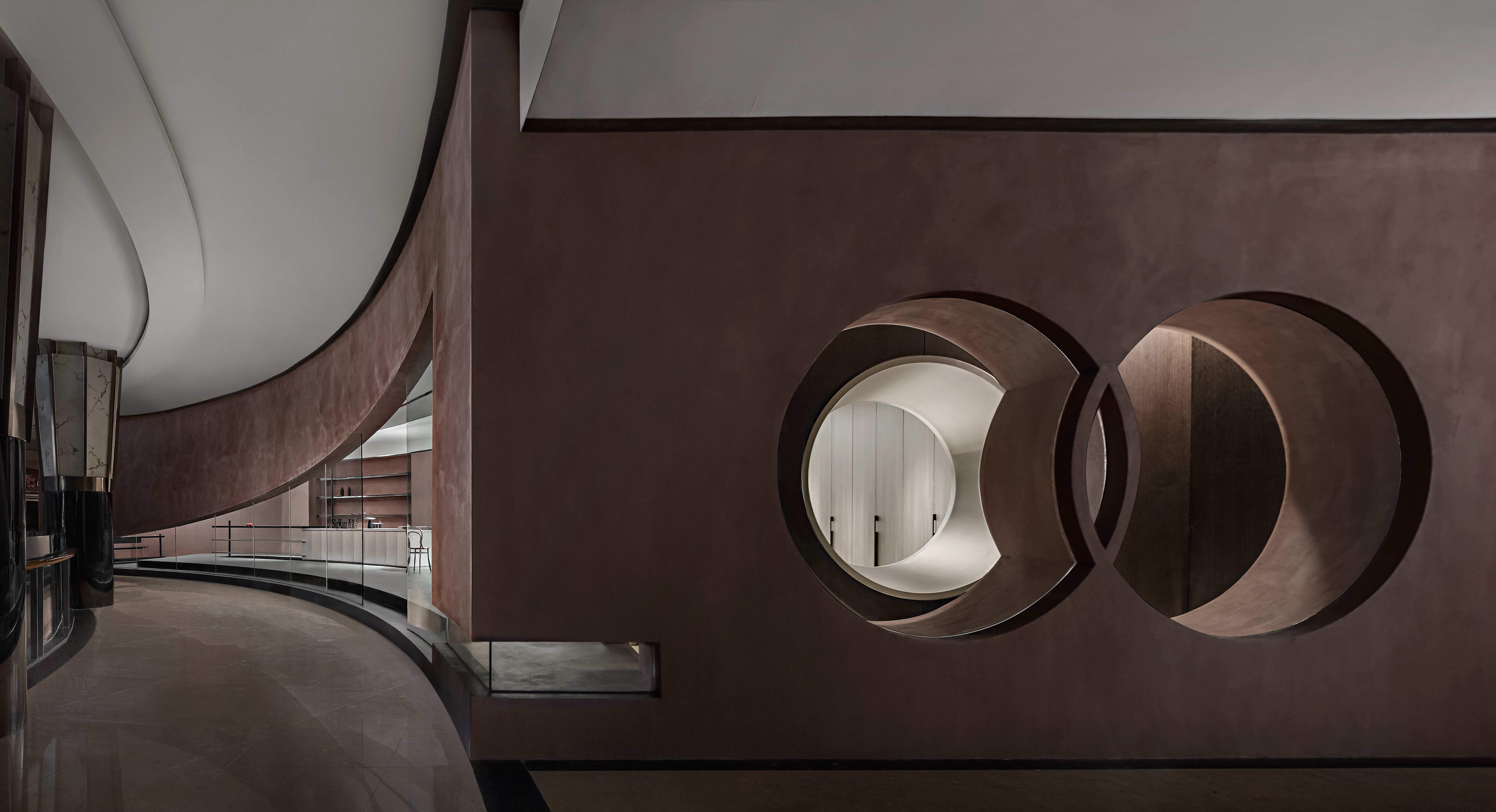 This showroom is located in a large household goods shopping mall in Guangzhou, China. Designers broke away from the original spatial pattern and installed a rolling glass curtain wall in the atrium. The natural light creates diverse storytelling spaces. The ceiling features curves and appears to be loosely spread like curtains. The plan incorporates the technique of "borrowed scenery" from traditional Chinese garden design, enhancing the sense of depth in the space. Additionally, through a symmetrical and balanced relationship of circles, a rhythm is established. Large custom-made, systematic island furniture for the showroom creates contrast and tension with the stainless steel, exuding a strong industrial atmosphere. The unique coating and the rough, texture of the cabinet walls resemble the red earth of a plateau, embodying a primitive sense of inclusiveness.