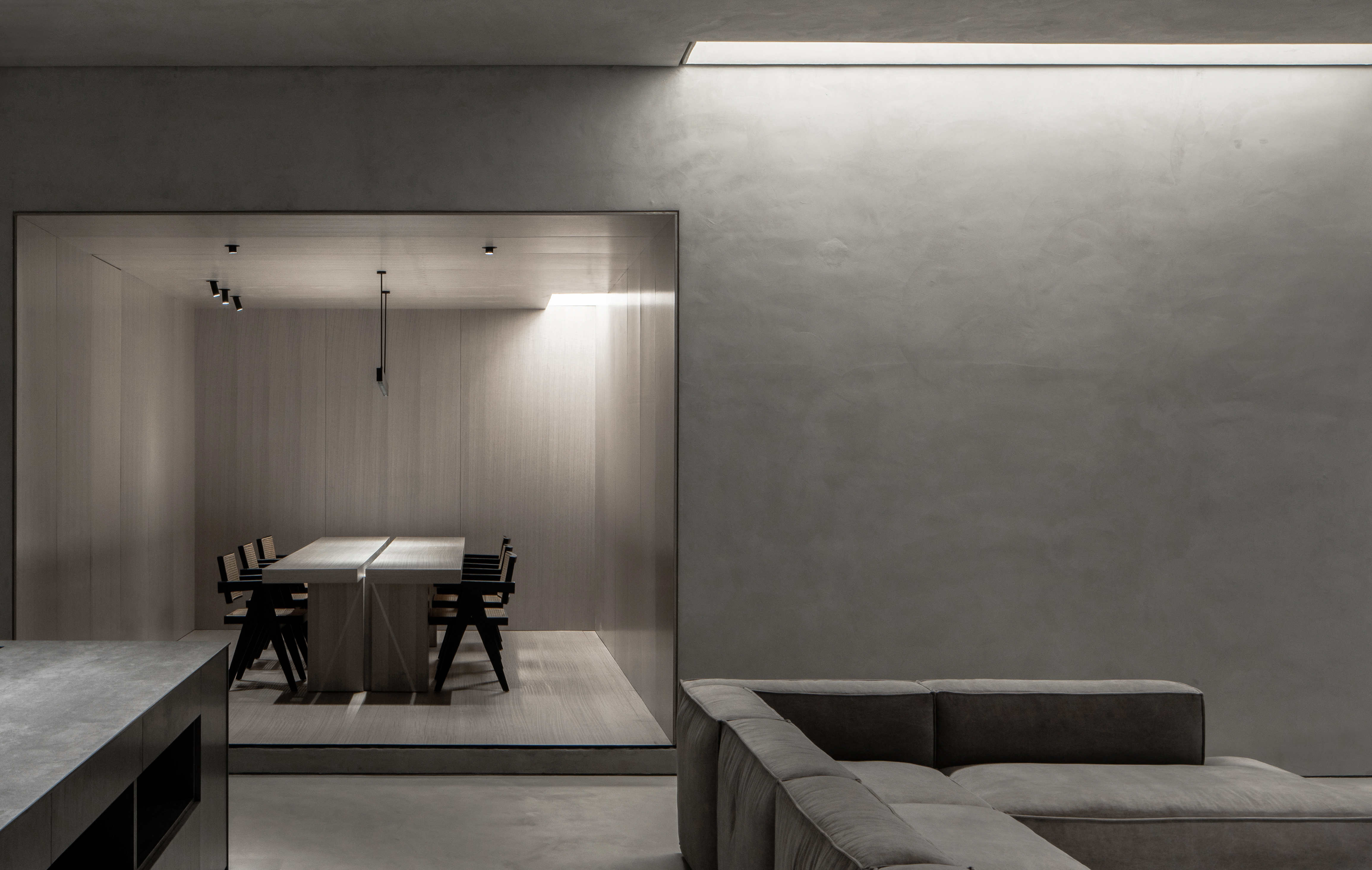 The existing space was divided into irregular patterns utilizing rectangular and fan-shaped zones. Instead of typical doors, the long and narrow rectangular passageway acts as a transitional space, giving people a sense of stepping through a threshold when they go down it. A series of partition walls were installed along the pathways, forming the spatial pattern, and maintaining continuity throughout the entire place while separating different areas. Some of these intersect with the existing interior architectural structure, showcasing asymmetrical aesthetics to create diverse spatial experiences. Natural light coming through rectangular ceilings gives the space a warm feeling.