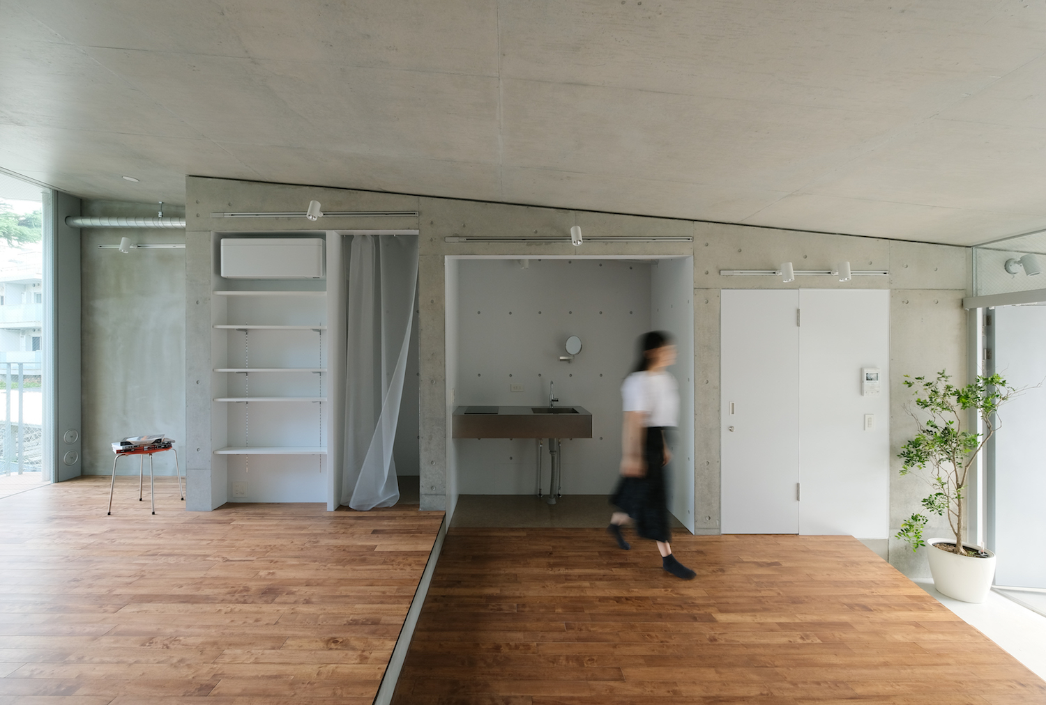 This project is situated in the renowned bustling district of Roppongi in Japan, and offers a unique setting with views of small buildings and commercial structures to the east in a park landscape. The diagonally sloped slabs toward the park create various cross-sections for space for each floor. By combining the slabs with folding windows, light and air flow into the interior as if gliding across the ceiling. The interior is designed with skip-floor layouts on diagonal slabs, creating various studio spaces. The architect blends work style and lifestyle, generating a more flexible and innovative urban living concept.