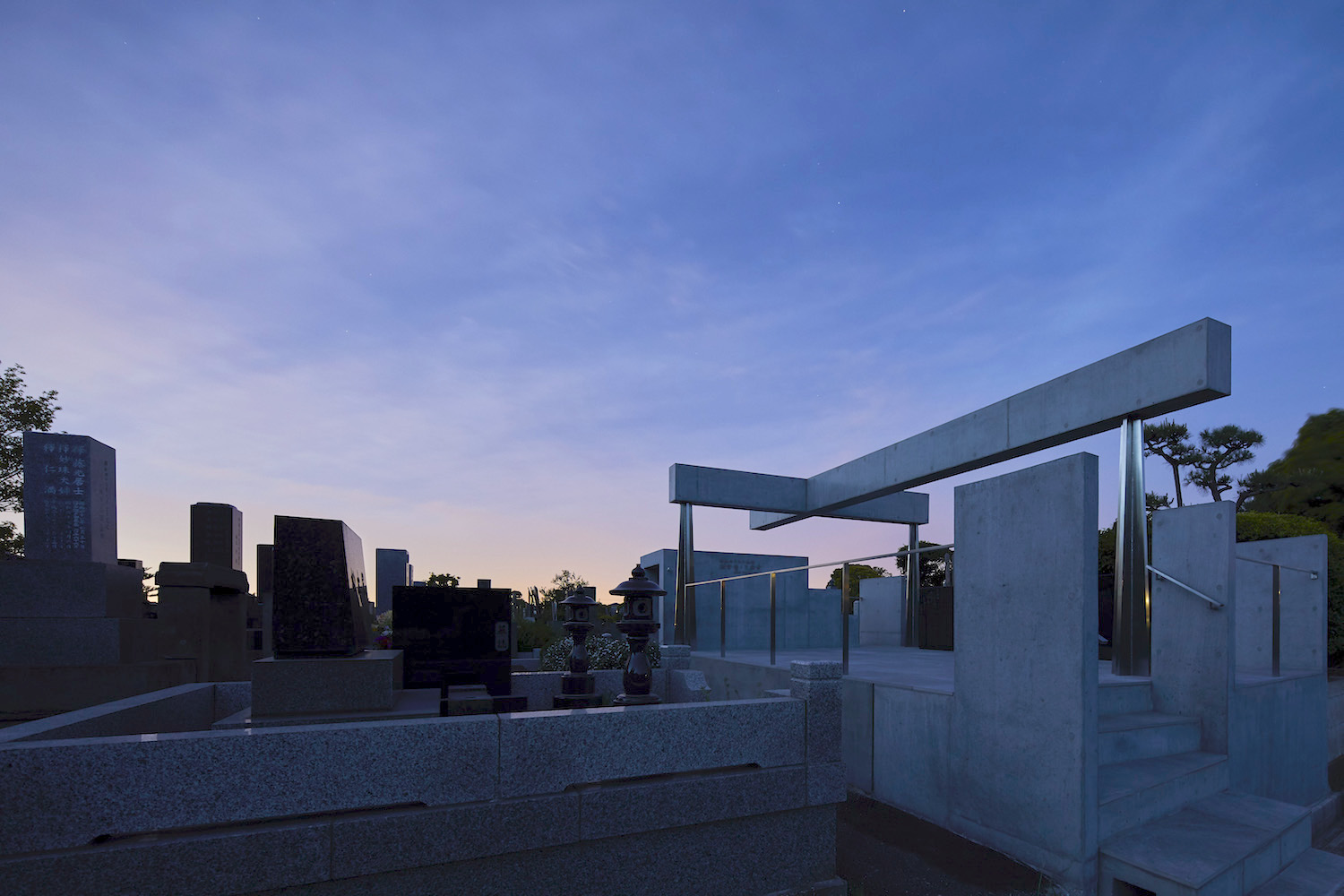 This project involves the renovation of a cemetery owned by a church. The above-ground space serves as an expansive and flat area for funeral services, while the existing underground space is repurposed as a communal burial room for caretakers. The main concept of this tomb is revealed in the light of resurrection behind the cross incorporating the sky (heaven), sunlight, and moonlight. The cross is supported horizontally by three columns. As the cross floats in mid-air, the tomb appears abstract, and the cross is not perceived at eye level by the living. On day when the sun is bright and during full moons, the cross pointing toward the sky casts a significant shadow over the tomb. The architect says, "This cross will spread the gospel to all visitors to this place and to all park visitors who come here."