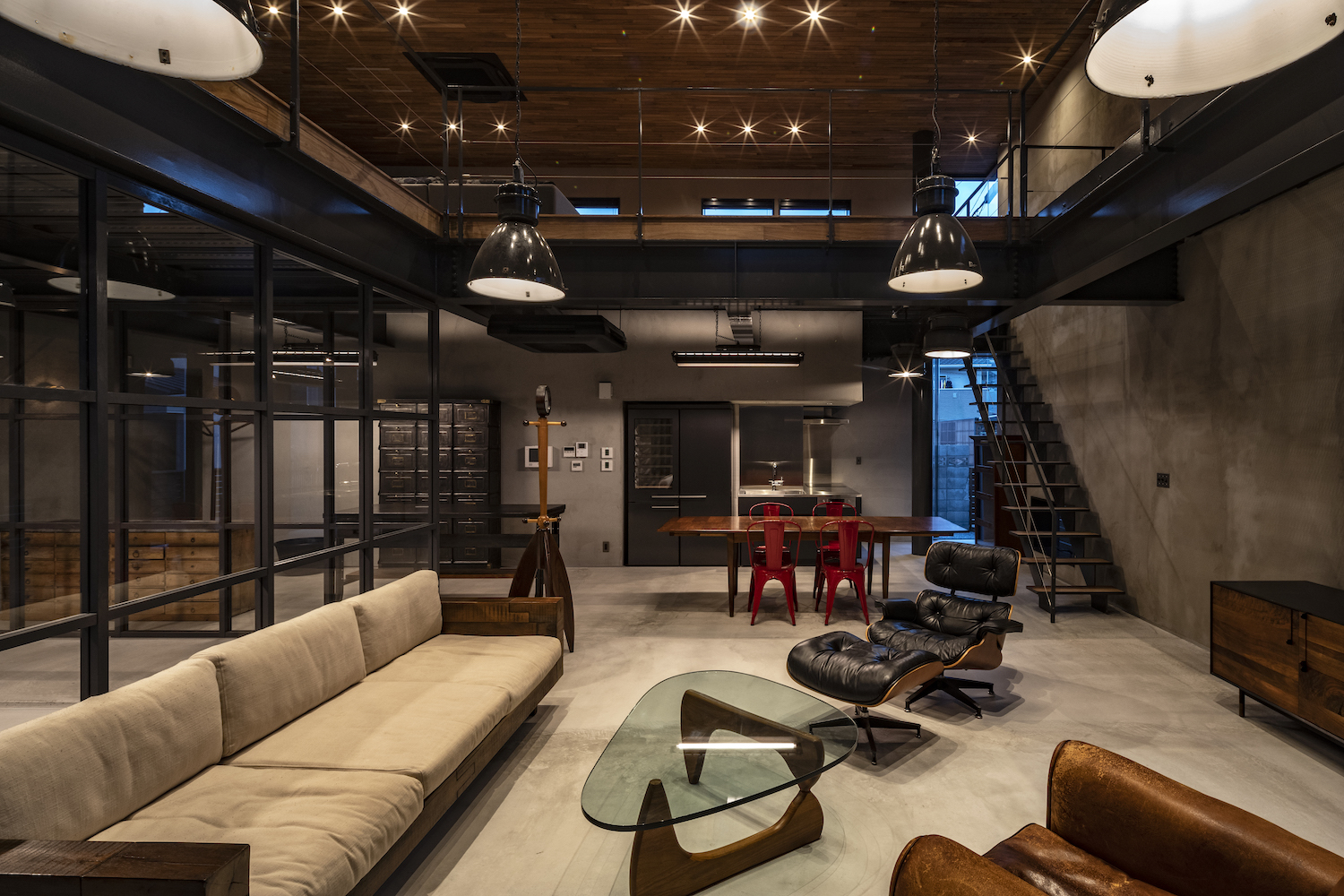 This two-story steel-frame building located in the center of Takamatsu was designed as a home for single individuals. Only the positions of the kitchen and bathroom were set to allow for flexible living arrangements. The architect chose a steel-frame structure to create spaciousness. A huge atrium, which occupies a quarter of the entire building, forms a large studio-like space withour partitions connecting the first and second floors. Much of the interior exposes the structural elements, and the walls are finished with mortar creating a rough texture. Additionally, external wooden were added, providing a cheerful impression and cover. The garage is enclosed by glass and is integrated with the living space. Upon entering, the interior space with its rugged feel combines with the design, creating the illusion of being in the past.