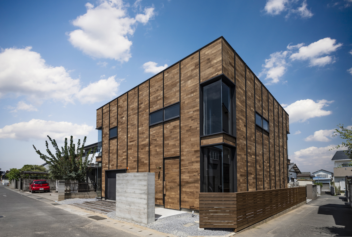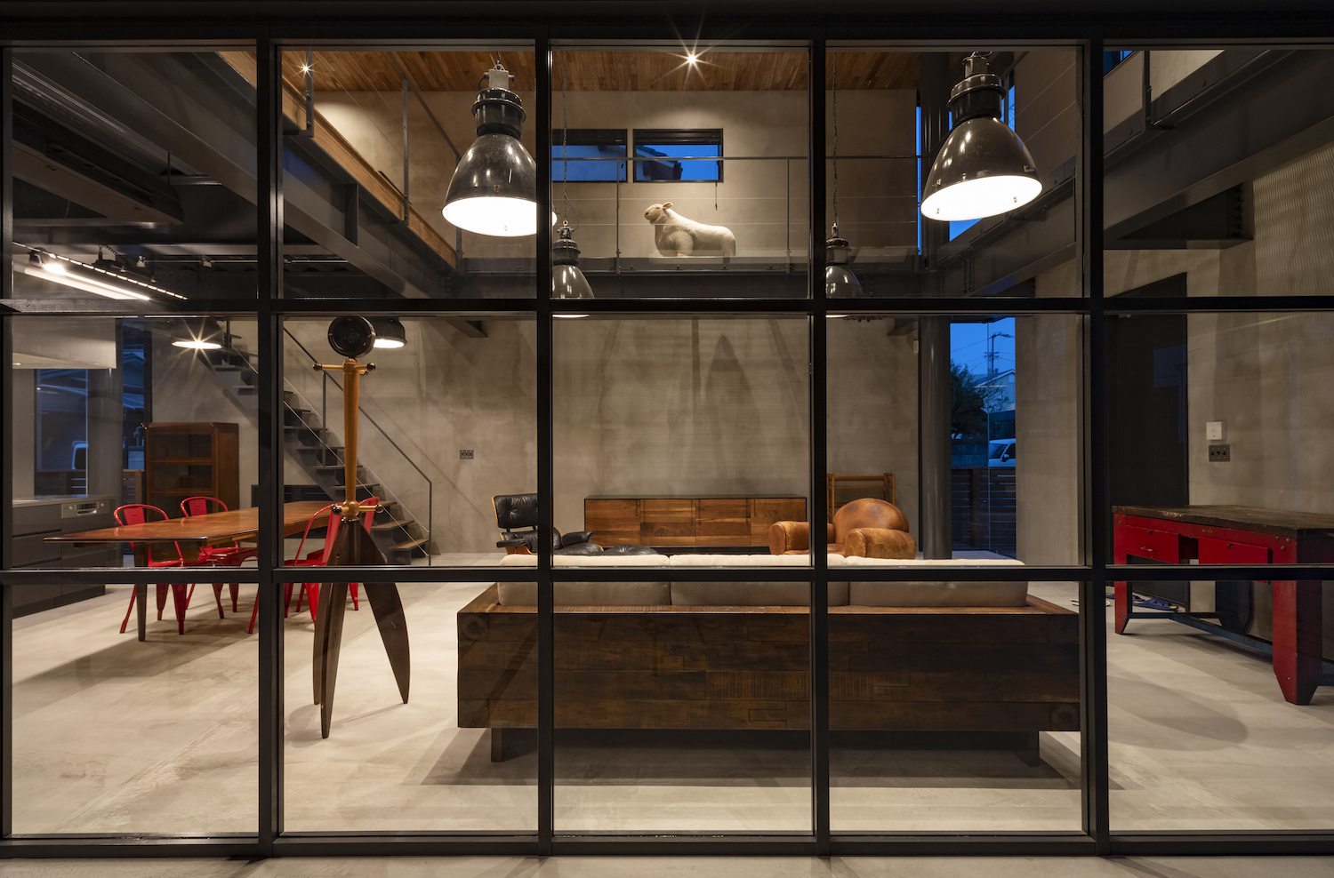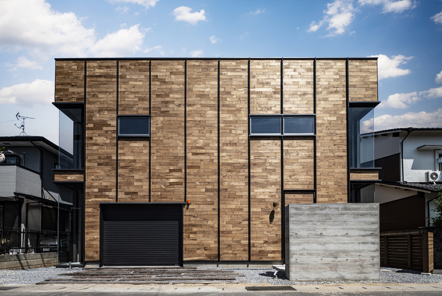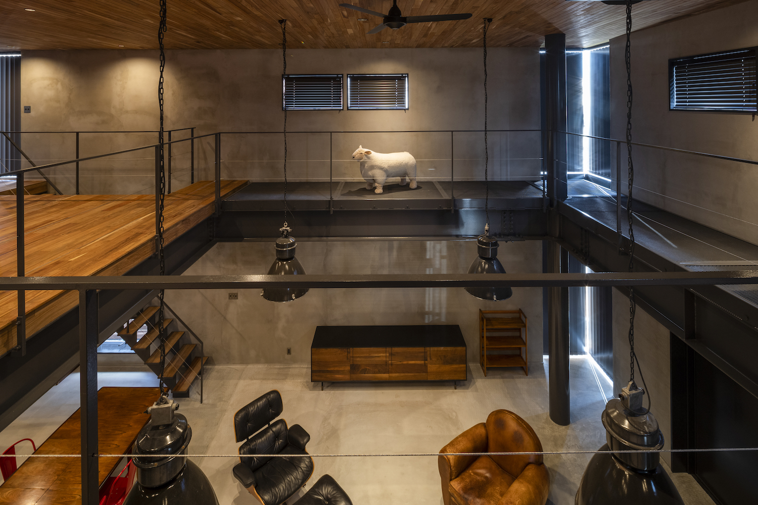 This two-story steel-frame building located in the center of Takamatsu was designed as a home for single individuals. Only the positions of the kitchen and bathroom were set to allow for flexible living arrangements. The architect chose a steel-frame structure to create spaciousness. A huge atrium, which occupies a quarter of the entire building, forms a large studio-like space withour partitions connecting the first and second floors. Much of the interior exposes the structural elements, and the walls are finished with mortar creating a rough texture. Additionally, external wooden were added, providing a cheerful impression and cover. The garage is enclosed by glass and is integrated with the living space. Upon entering, the interior space with its rugged feel combines with the design, creating the illusion of being in the past.