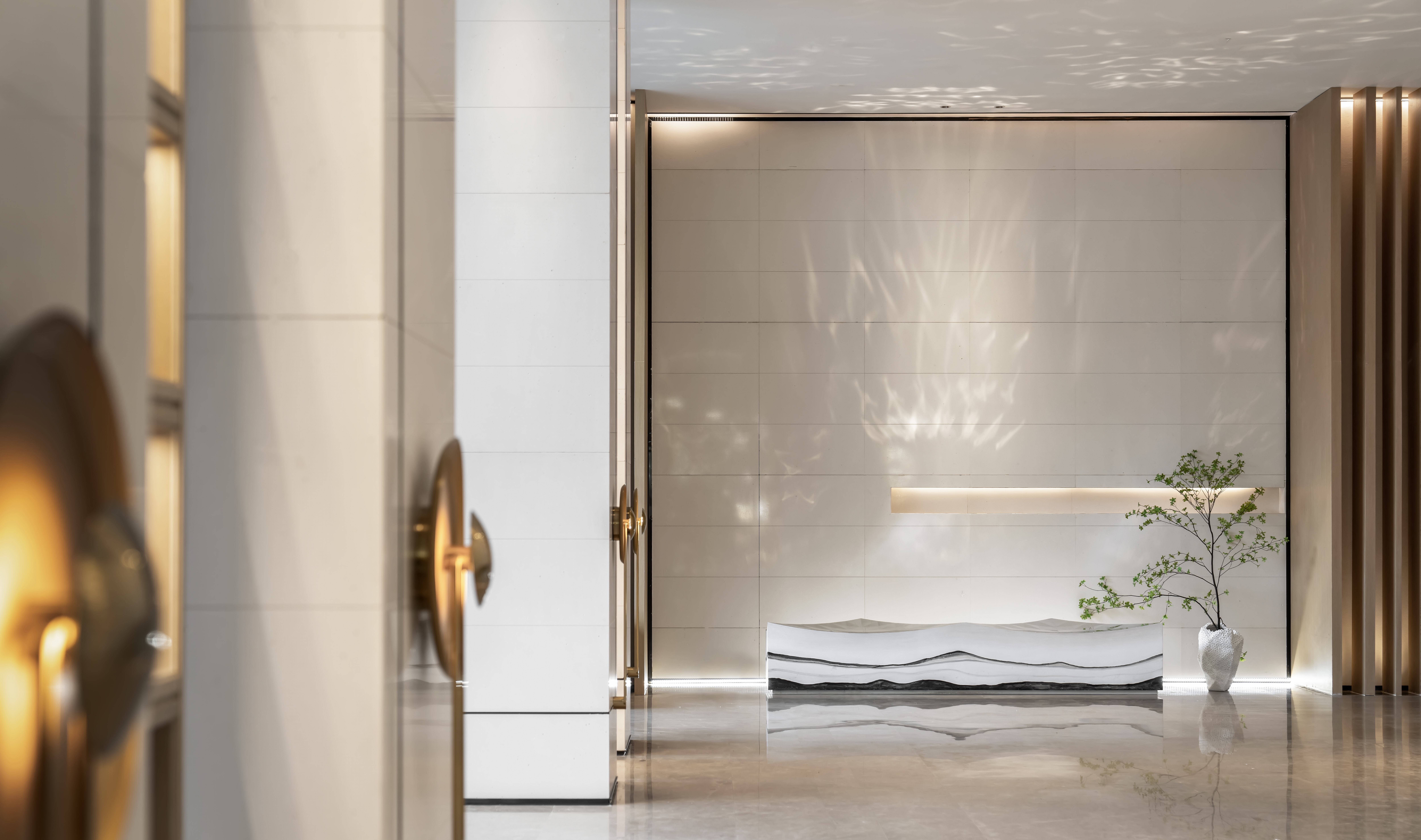 This project is a sales office located in the city of Beihai in China, one of the starting points of the Maritime Silk Road. Drawing inspiration from the local environment and cultural background, the designer unfolds the space from the distinctive elements of mountains and sea by abstracting the flowing ripples and showcasing the form of seawater through rich changes in light and shadow. Without a fixed form, the light creates an artistic atmosphere, effortlessly traversing the edges and corners of the space. The light illuminates the rocks, refracted and extended by the glass. Extracting the simple and pure essence of deep-sea coral, the space integrates harmoniously with nature.