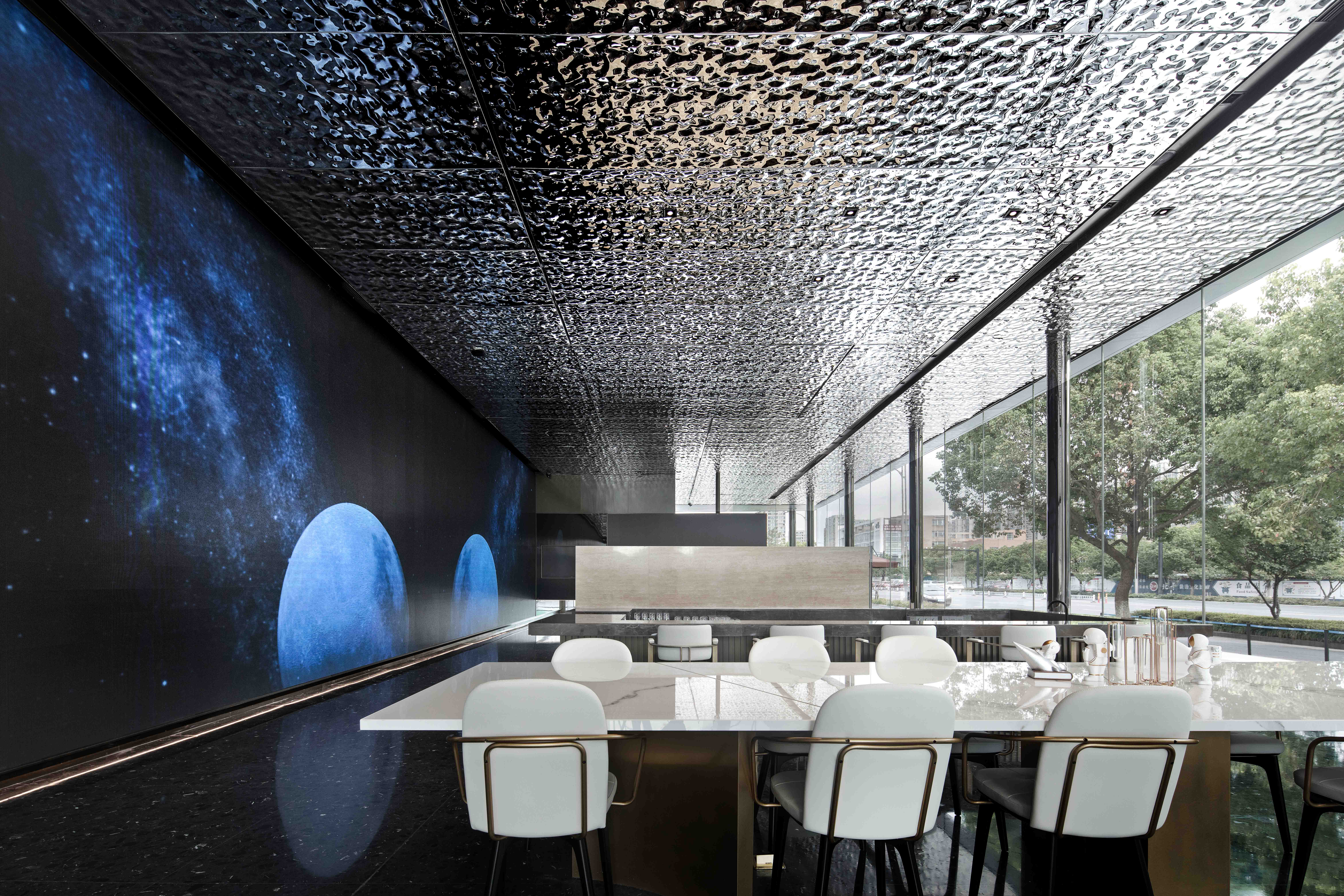 This project is located at the intersection of several key waterfront areas in Hangzhou, China, and it showcases a future way of life through extreme imagination by incorporating the city's creativity into the box. Simplified points, lines, and planes reveal a classical minimalist concept and structure for the interior. The straightforward spaces leave ample room for envisioning the interior. The entrance wall is reflected in glossy stainless steel, creating transparency. Dark-colored surfaces extend from the wall to the center of the space, forming partitions. Each space is open, allowing for a clear view of the entire area, while dynamic lighting casts dappled shadows, blurring the boundaries between reality and unreality.