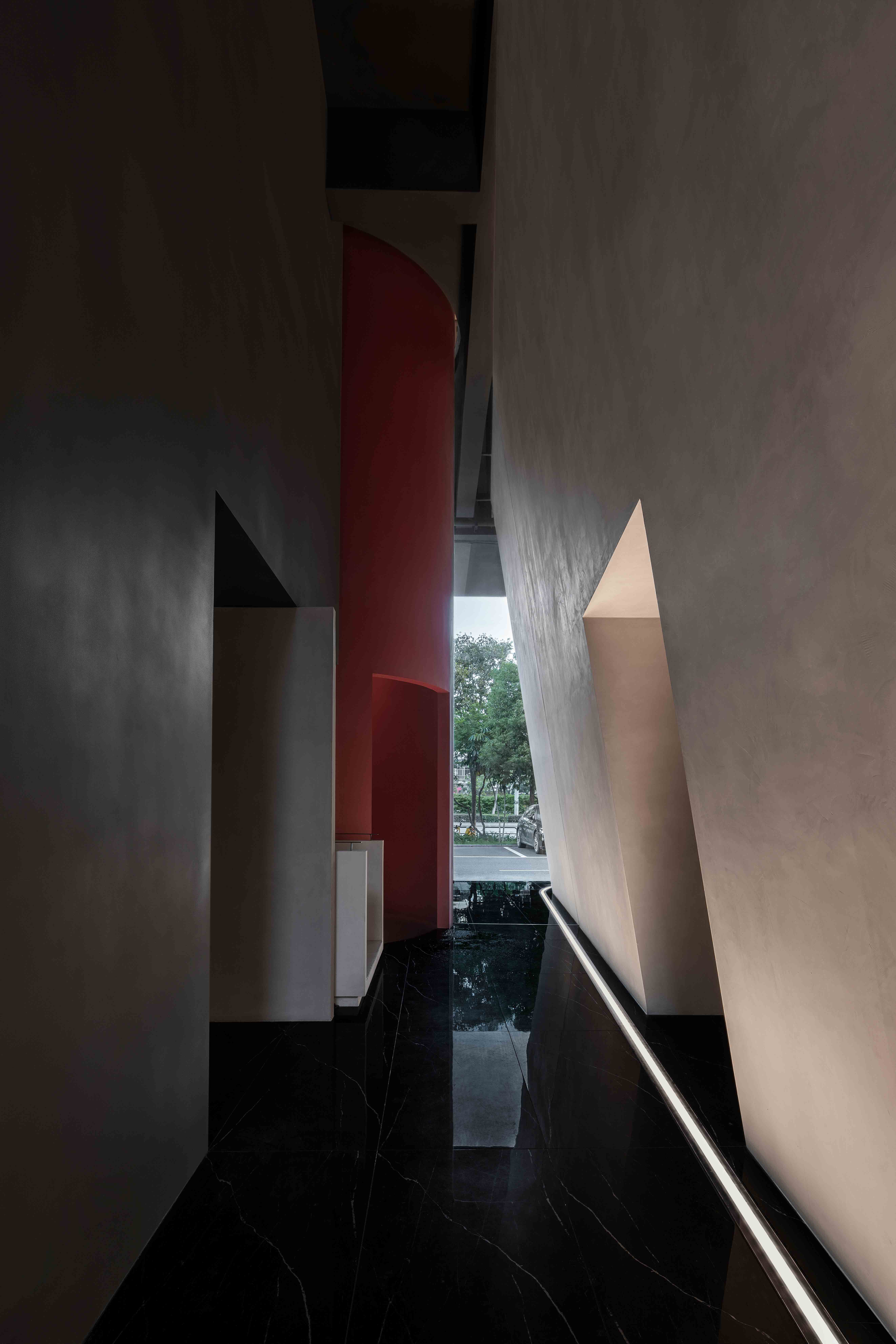 This project is the working and exhibition space of the clothing brand "MAIMENG," headquartered in Foshan, China. Situated next to a major urban thoroughfare, it benefits from convenient transportation. This is a comprehensive area that brings in plants, sunlight, and rainwater while accommodating user activity and sound. The entrance is concealed beside a rectangular block. The clean white tones of the polished cement create a serene atmosphere and reveal well-organized sides. On the second floor, discontinuous walls surround a square corridor. The separated yet connected relationship of the walls creates a tranquil spatial atmosphere, providing separation from the hustle and bustle of the outside.