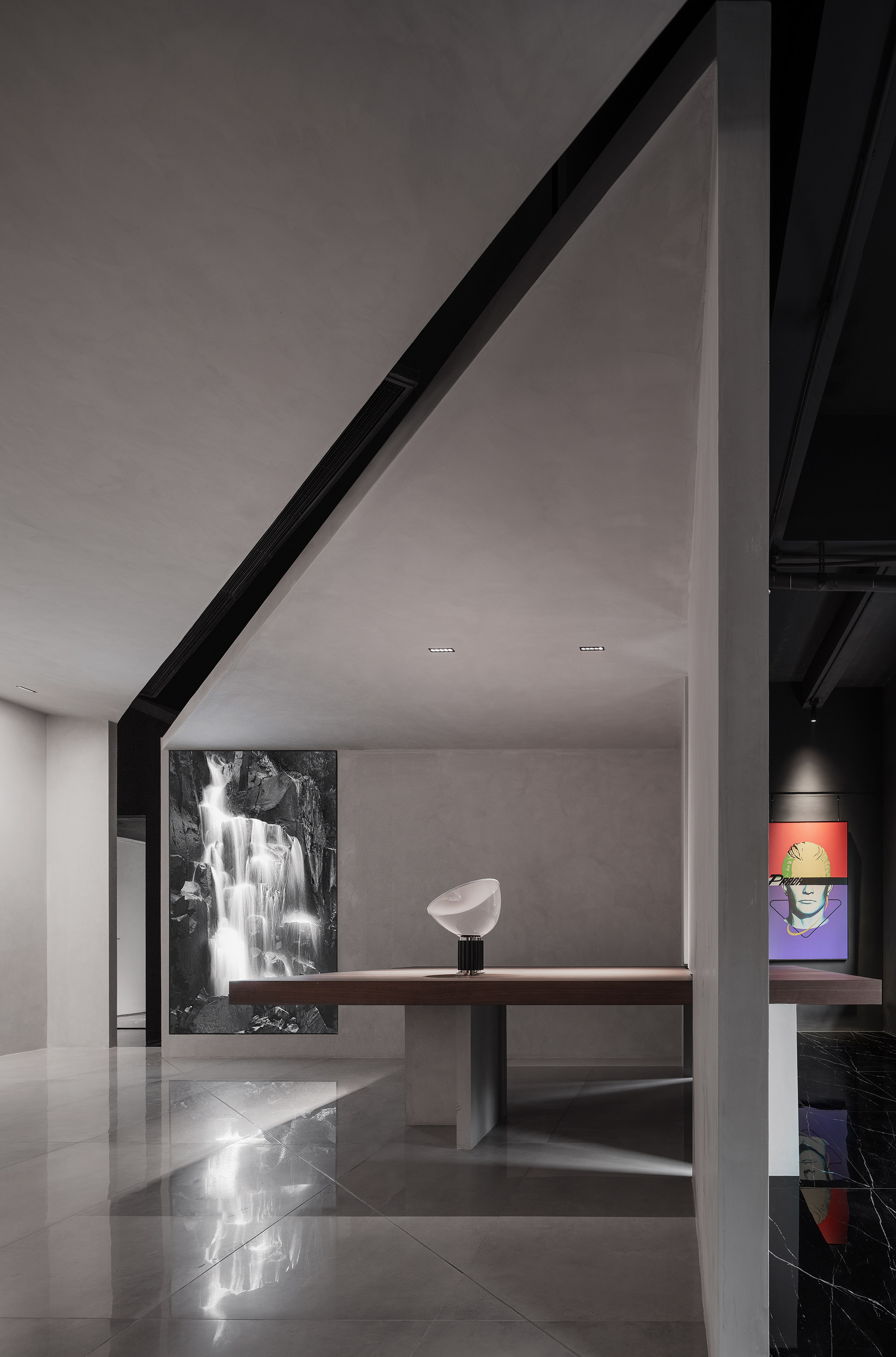 This project is the working and exhibition space of the clothing brand "MAIMENG," headquartered in Foshan, China. Situated next to a major urban thoroughfare, it benefits from convenient transportation. This is a comprehensive area that brings in plants, sunlight, and rainwater while accommodating user activity and sound. The entrance is concealed beside a rectangular block. The clean white tones of the polished cement create a serene atmosphere and reveal well-organized sides. On the second floor, discontinuous walls surround a square corridor. The separated yet connected relationship of the walls creates a tranquil spatial atmosphere, providing separation from the hustle and bustle of the outside.