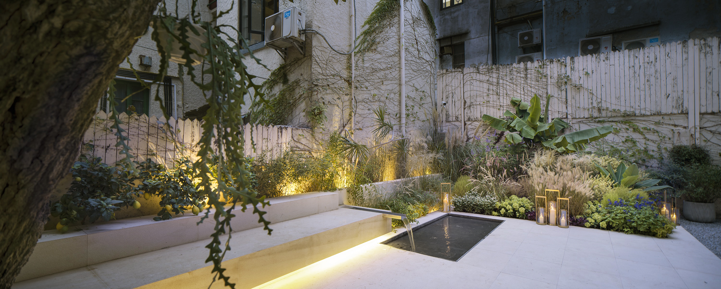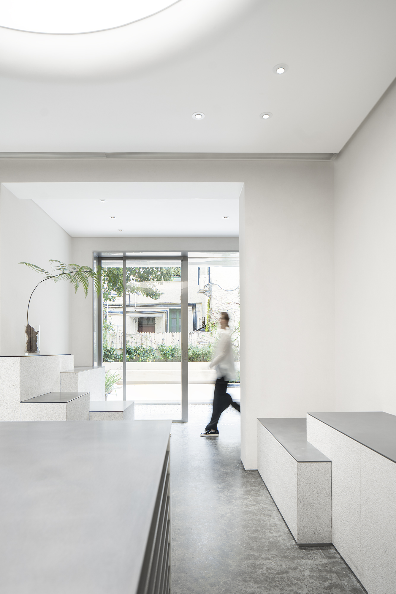 This newly established flower shop is located on the ground floor of an old house and is composed of a series of spaces that seem to be woven from crops, even to the large garden at the back. The design is divided into three zones: the street gallery, artificial landscape, and secret garden. Entering from the street, visitors pass by the gallery before experiencing the actual plants. The garden serves as a rest area where the owner and friends can enjoy tea. Utilizing existing trees in the seating area, an L-shaped bench wraps around the trees, creating a peaceful oasis in the heart of the city. The interior of the flower shop is designed with a consistent layout that connects with the exterior, and the verticality of the trees provides balance.
