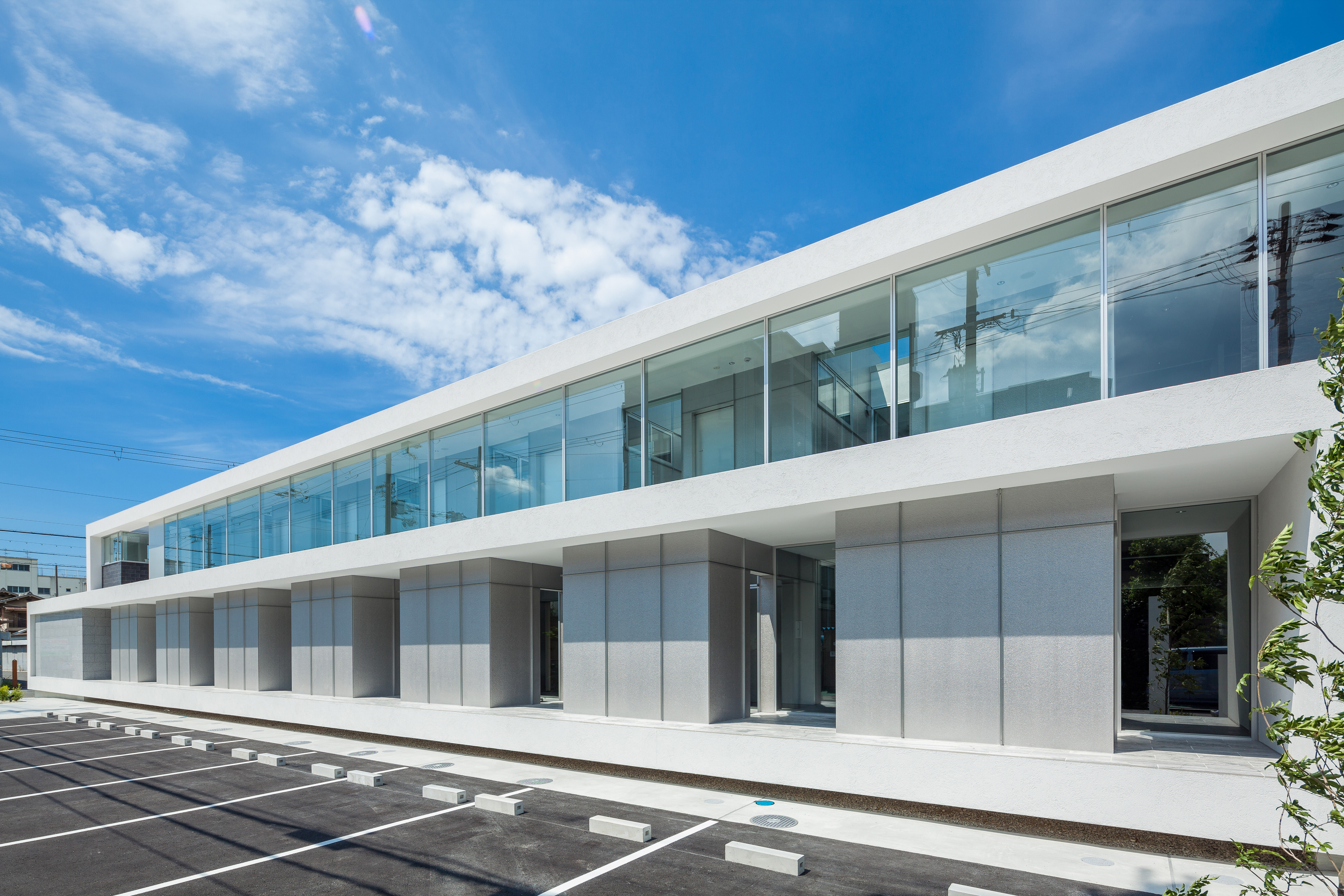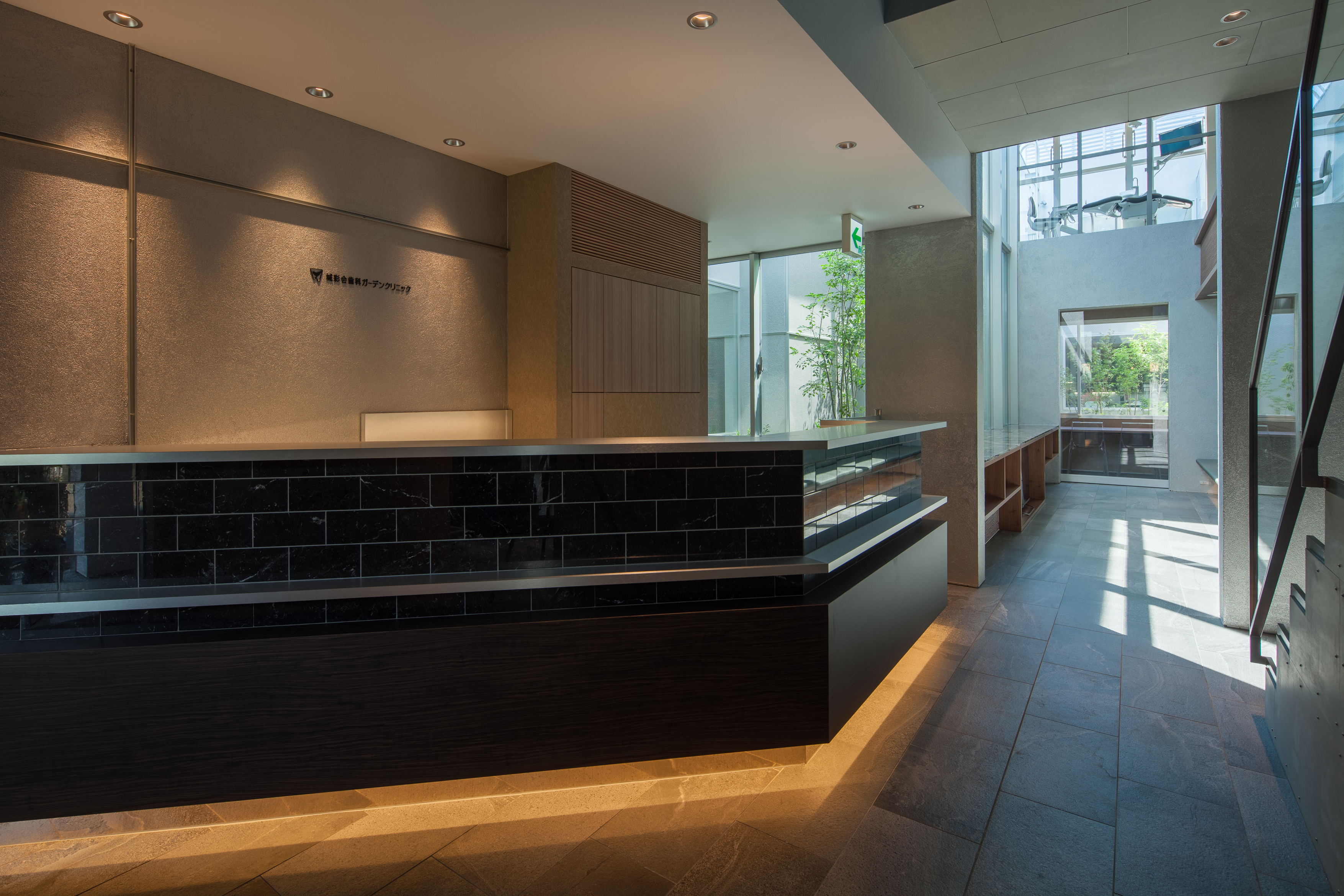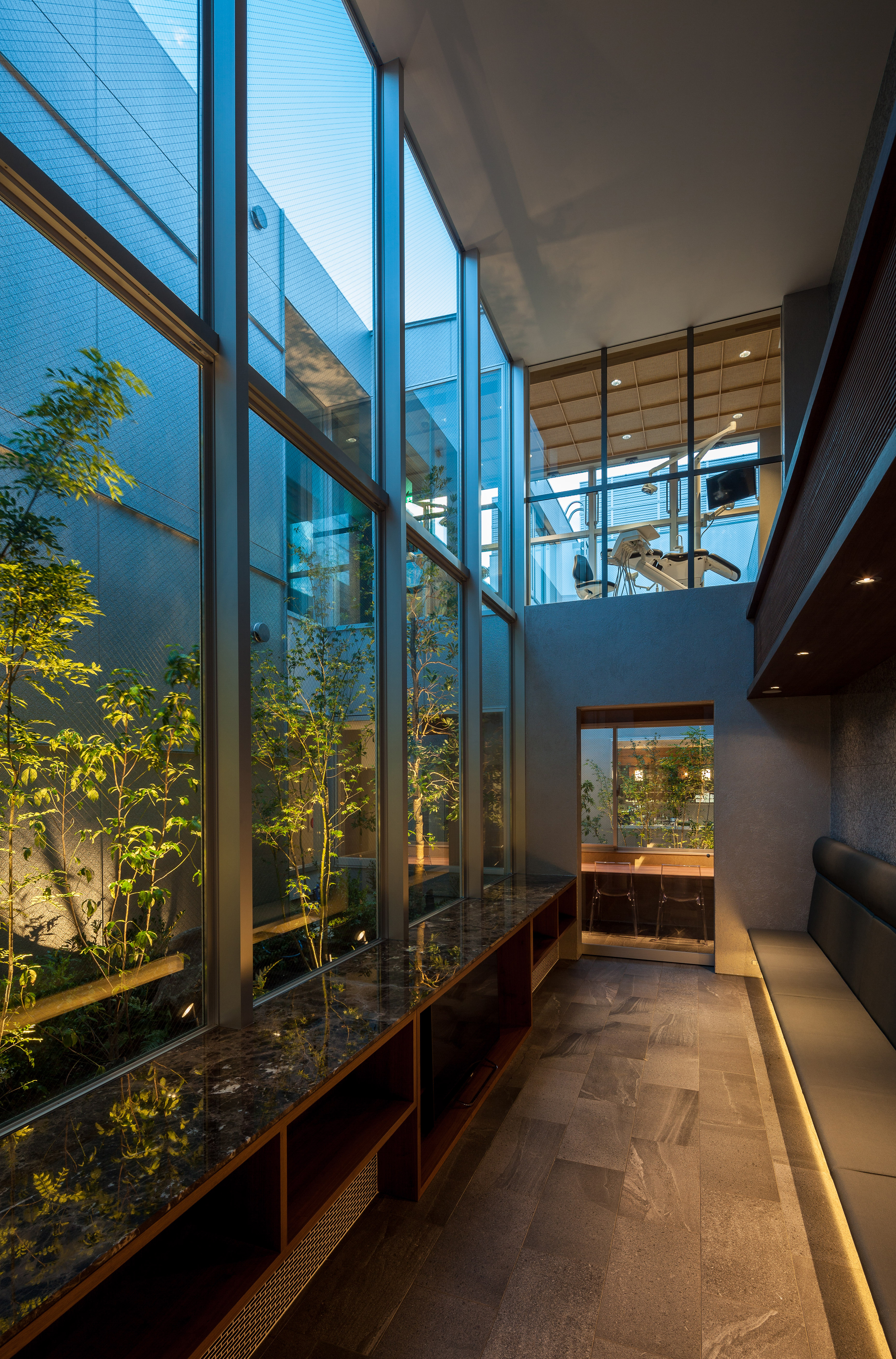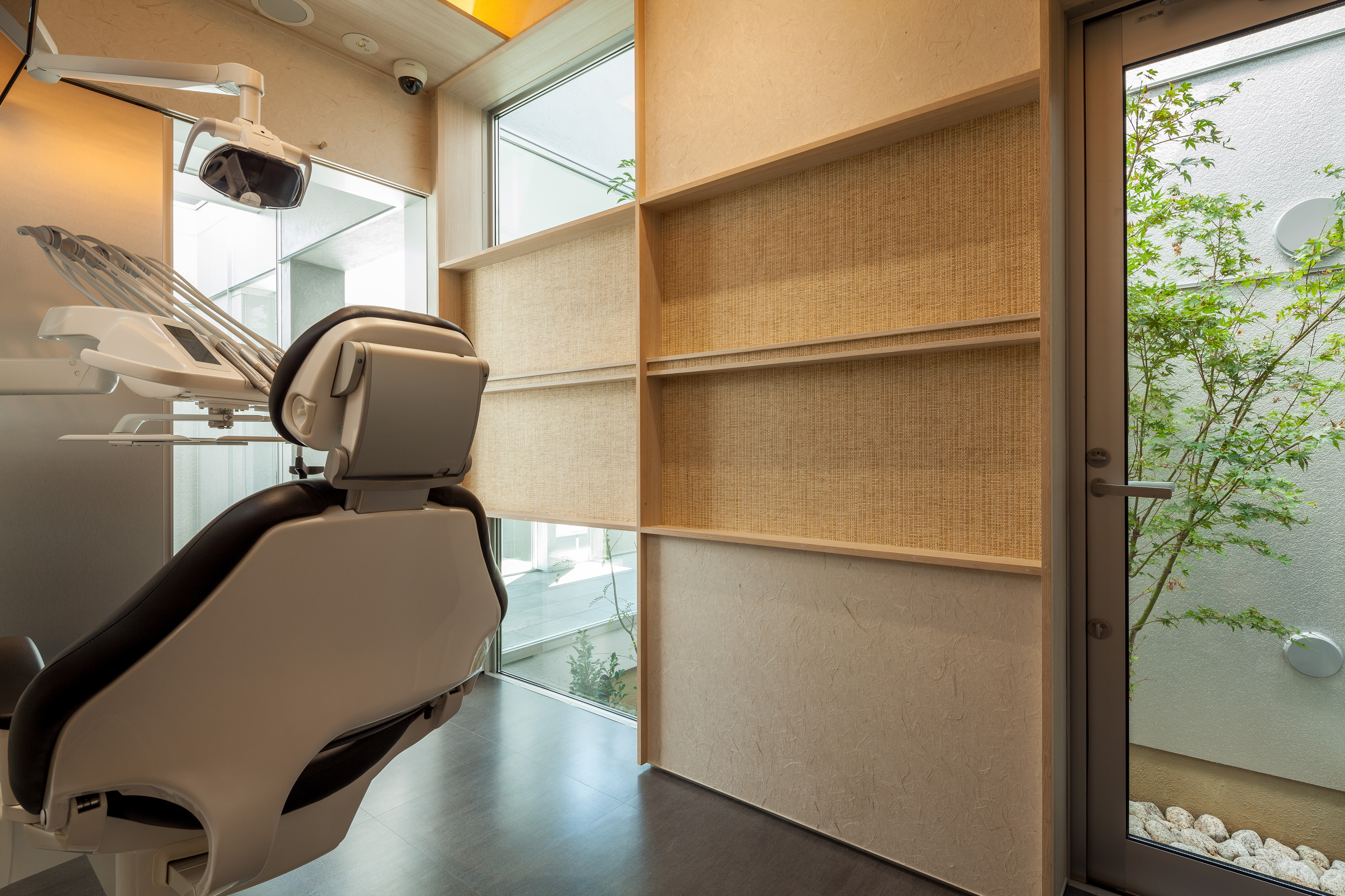 Josaikai Dental Clinic boasts a highly unique design. While traditional dental clinics typically feature a layout where treatment rooms face the hallway, where patients only see the dentist, this space is designed to provide patients with views of plants and the sky. Treatment rooms and gardens are arranged in a cross pattern, and patients enter through an elegant waiting room where they can observe the staff's activities and treatment rooms beyond the garden. When viewed from the outside, the treatment rooms appear to be enclosed by the long frame of the hallway, adding a striking visual element to the horizontal landscape.