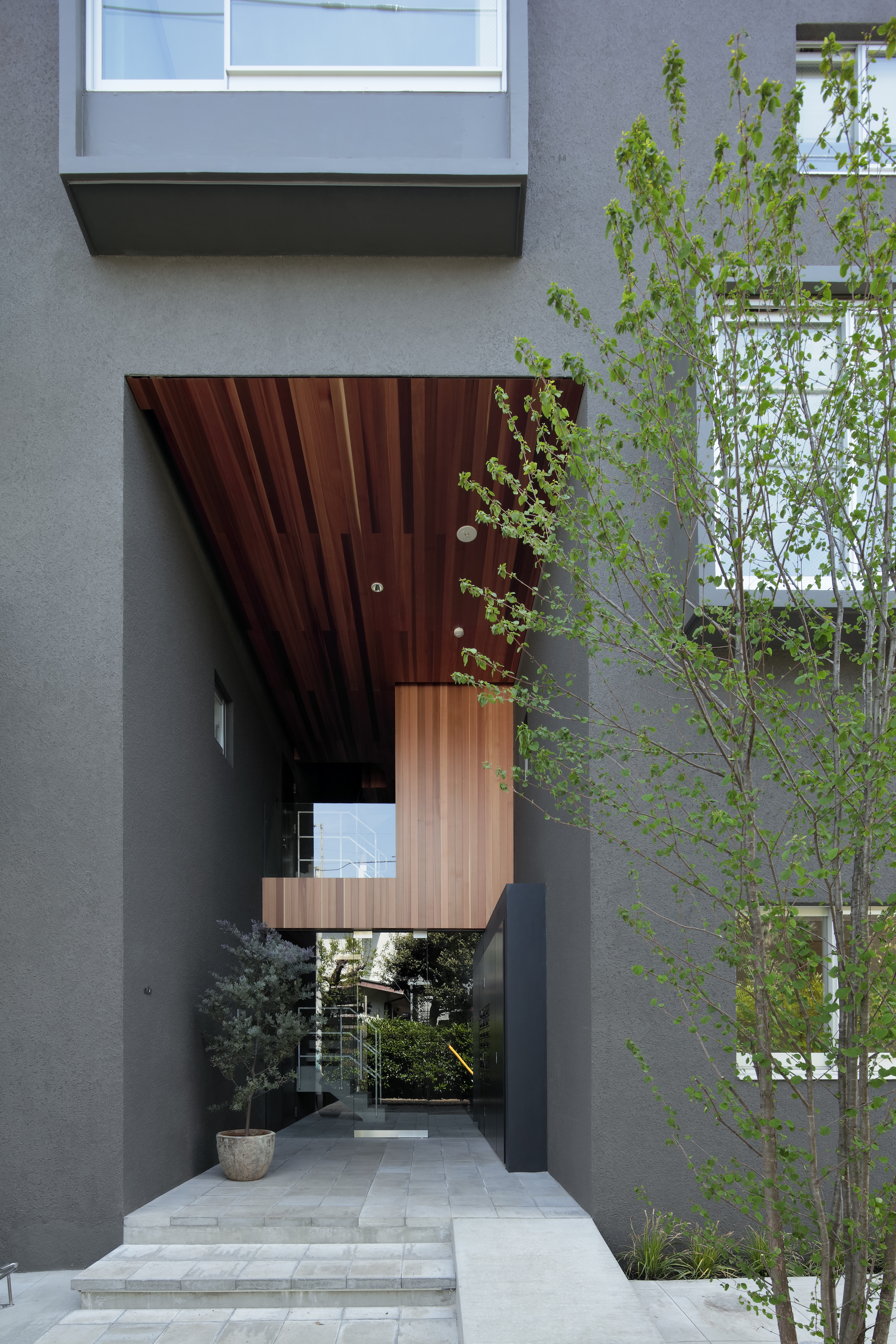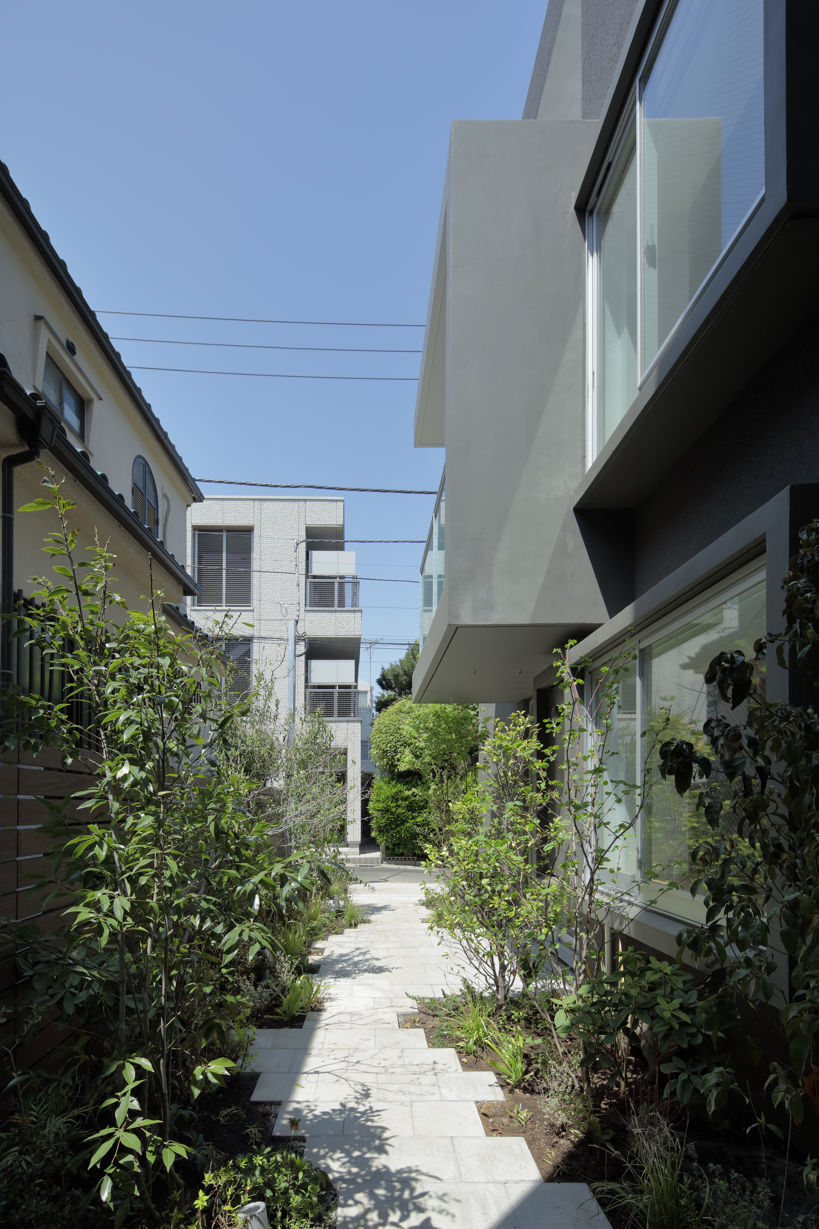 Planned on a plot of approximately 300m2, this apartment complex accommodates the owner's request for a garden in the south and small windows for ventilation. To create a comfortable space connecting eight apartment units, the architect designed small gardens between adjacent buildings and units. Seamlessly connected communal spaces serve as link between the houses and the outside. The apartment units ensure privacy from the outside world by incorporating trees and small windows, while also fostering community interaction through internal shared gardens.
