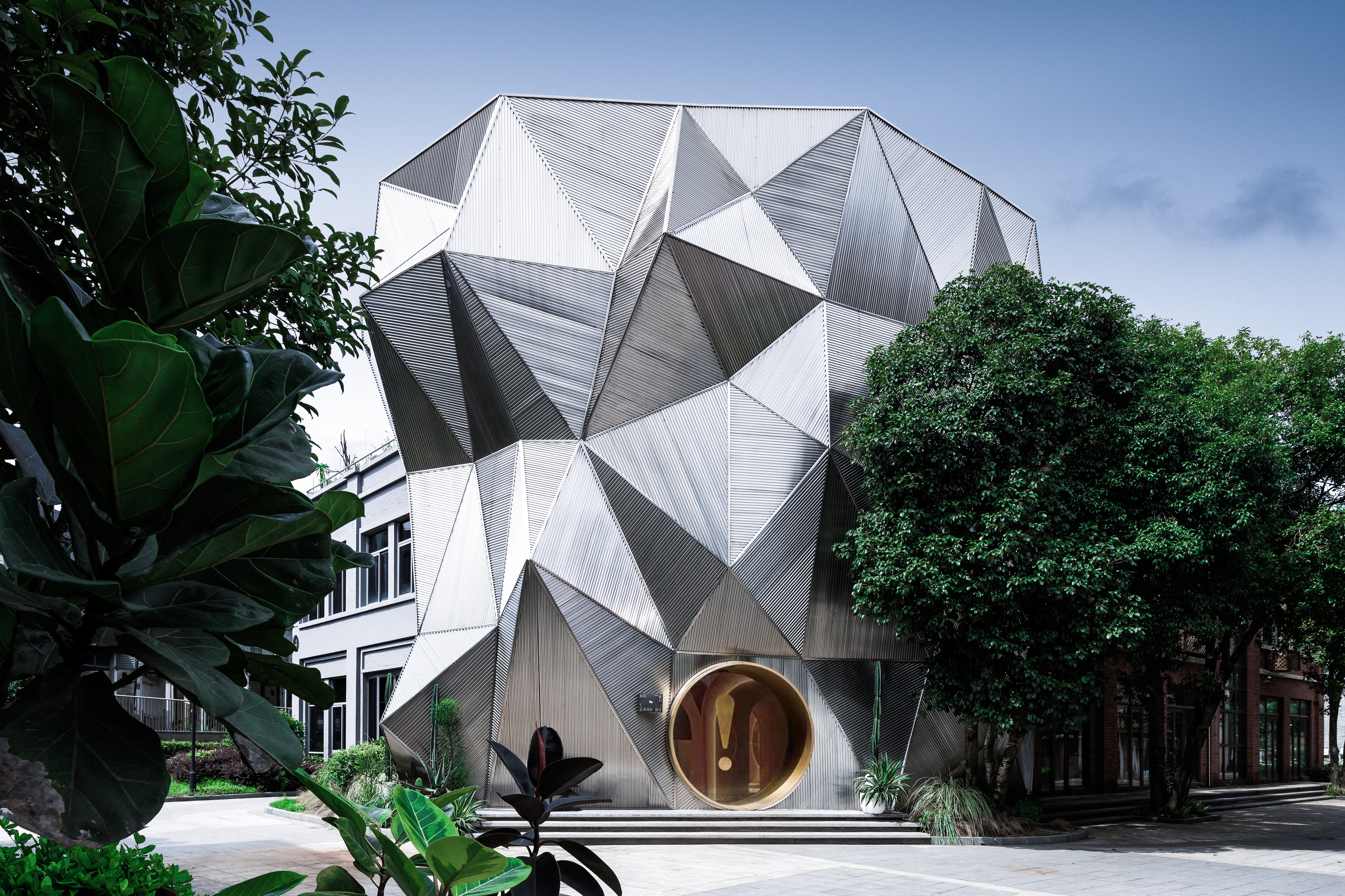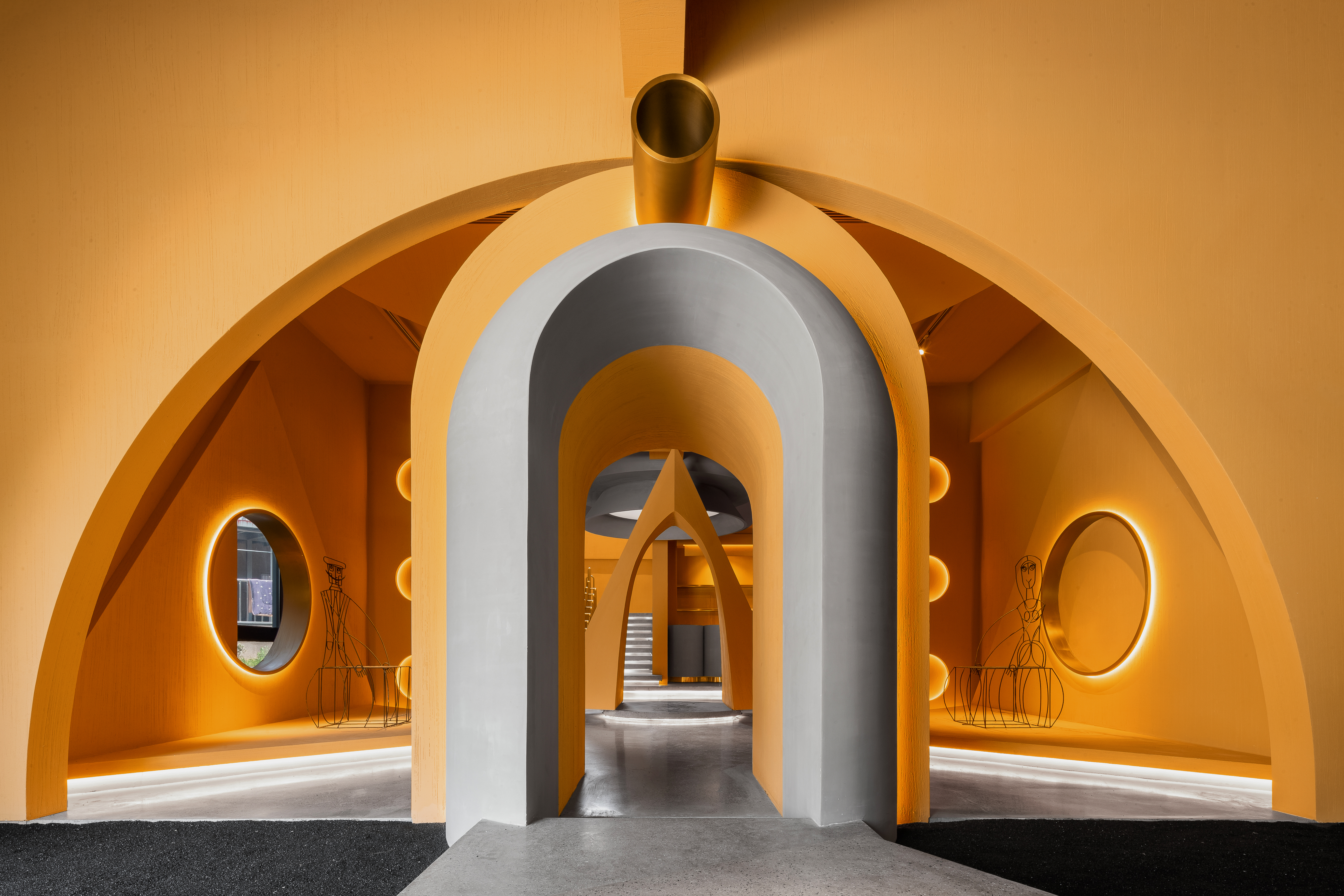 This project, designed as a space to exhibit Memphis furniture, incorporates iconic elements of the Memphis style, including geometric shapes and freeform compositions, into its spatial design. The facade, based on the design concept of "cliff," is made of wavy stainless-steel sheets creating a mesmerizing visual effect. A large exclamation mark at the building's entrance emphasizes and guides visitors into the unknown interior space.