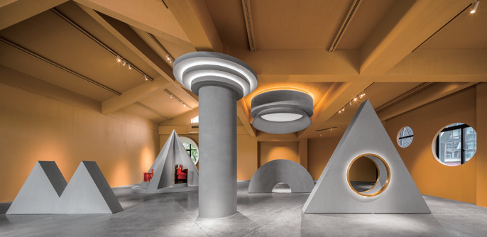 멤피스 가구를 전시하기 위한 공간으로 계획된 본 프로젝트는 기하학적인 모양과 자유로운 구성을 포함한 멤피스 스타일의 대표적인 요소들이 공간구성에 적용되었다. “Cliff”의 디자인 개념에 기초한 물결무늬 스테인레스 스틸 시트로 만들어진 입면은 기이한 시각적 효과를 가진다. 건물의 입구에는 커다란 느낌표가 강조되어 방문객을 미지의 내부공간으로 안내한다. 기하학적 형태의 독특한 조합으로 구성된 내부는 공간적 리듬을 생성하고 시각적 경험을 풍부하게 한다. 전시영역은 시각적 프레임을 기반으로 시야를 단절하고 재결합하여 관찰하는 행위를 더욱 즐겁게 만든다.