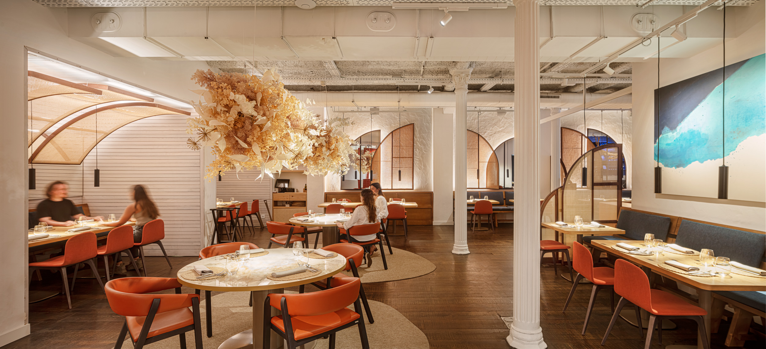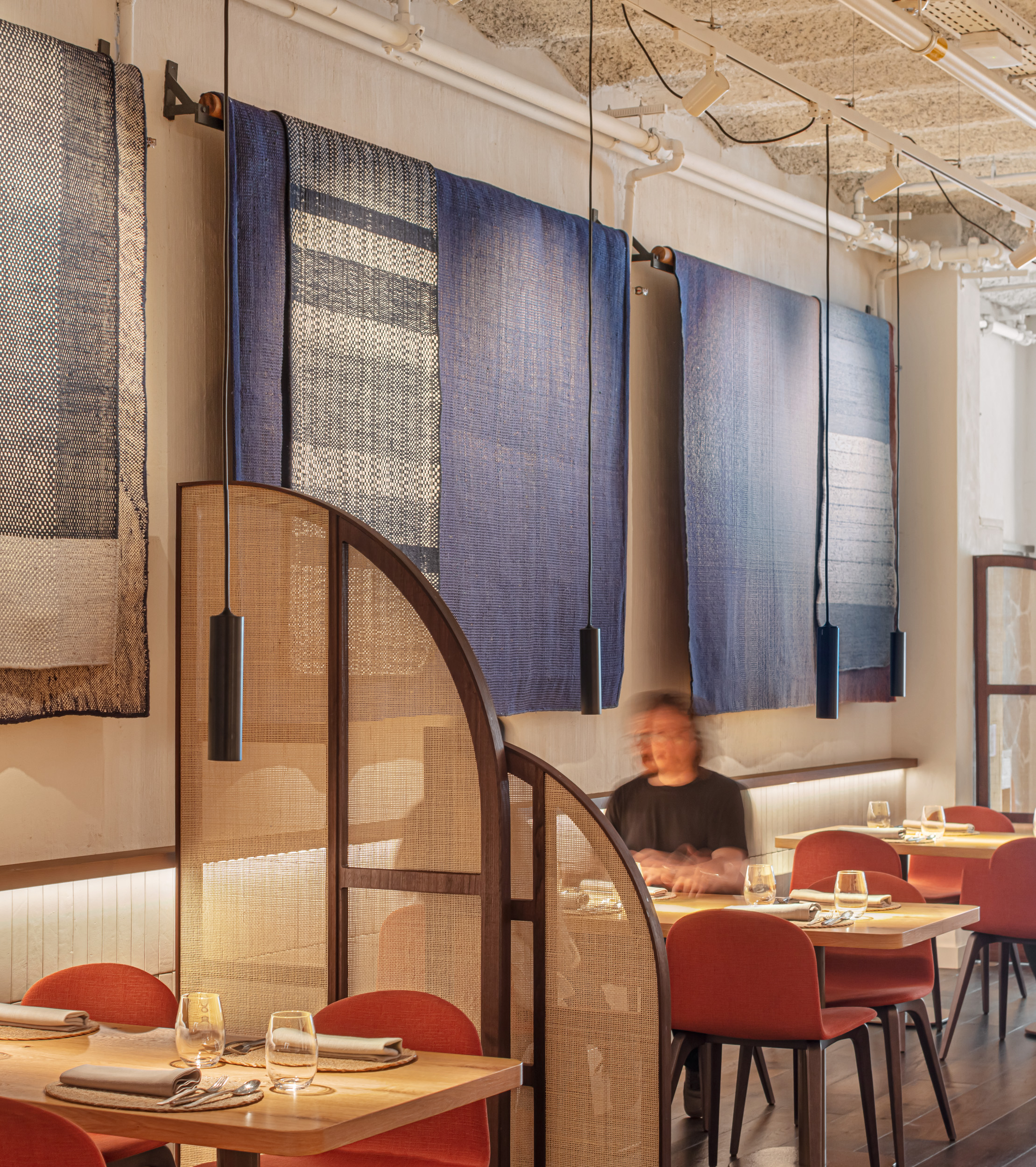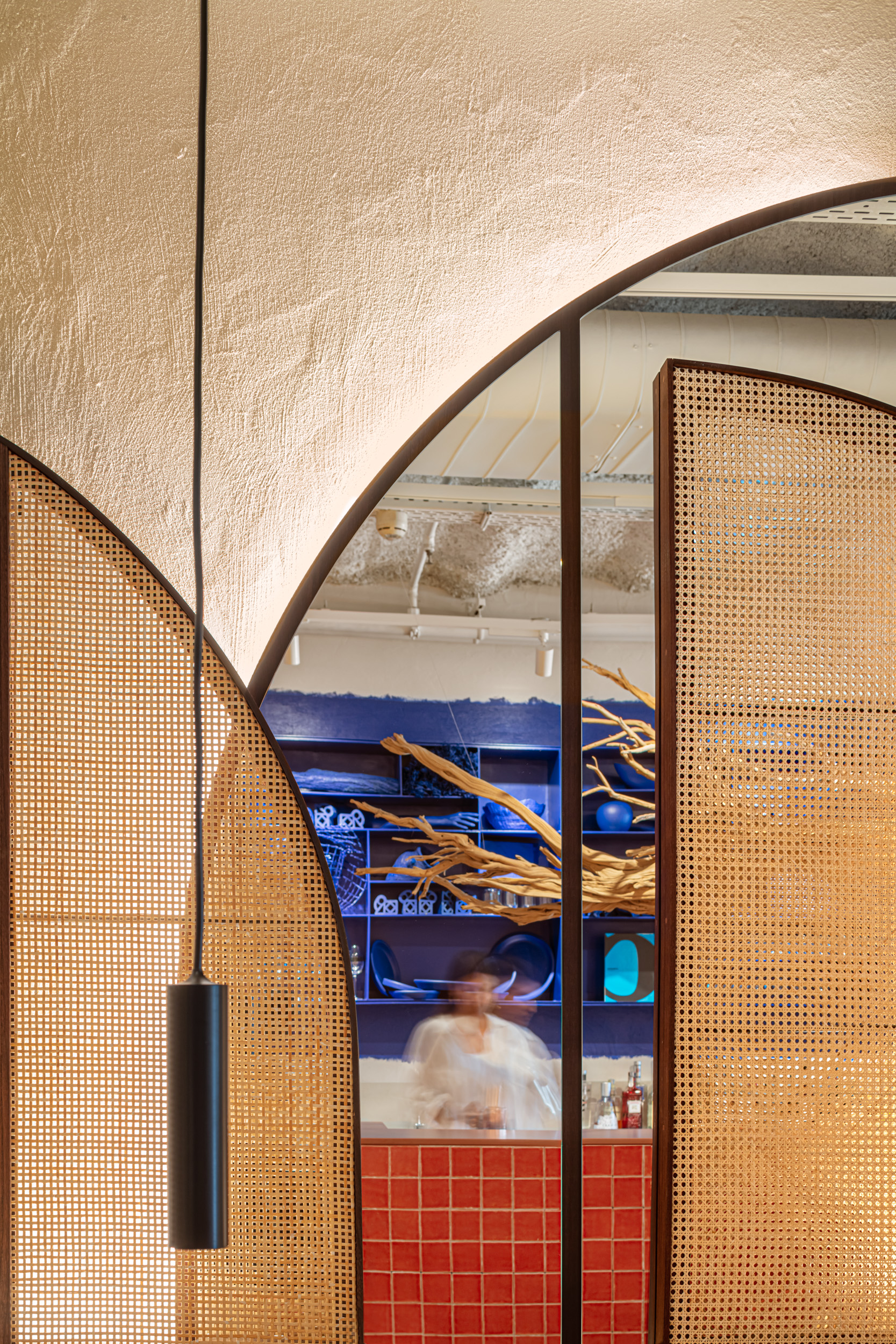 The curved shapes of mirrors and wicker dividers bring a warm counterpoint, converted into lamps of warm light scattered along the space, and bringing privacy to the tables, one of our client's priorities. They recreate an abstract landscape of sails and vessels, referencing the bay of Cadaques.