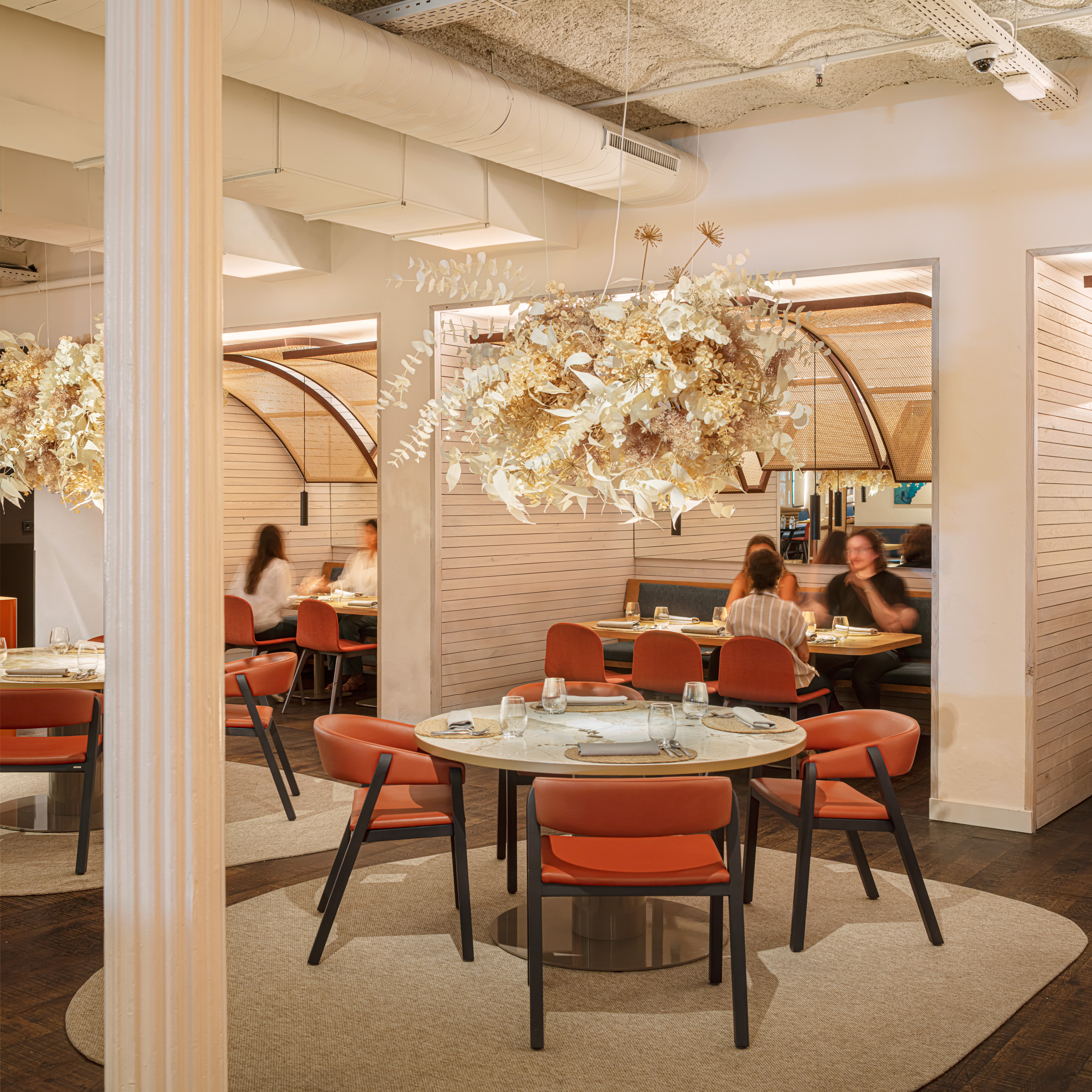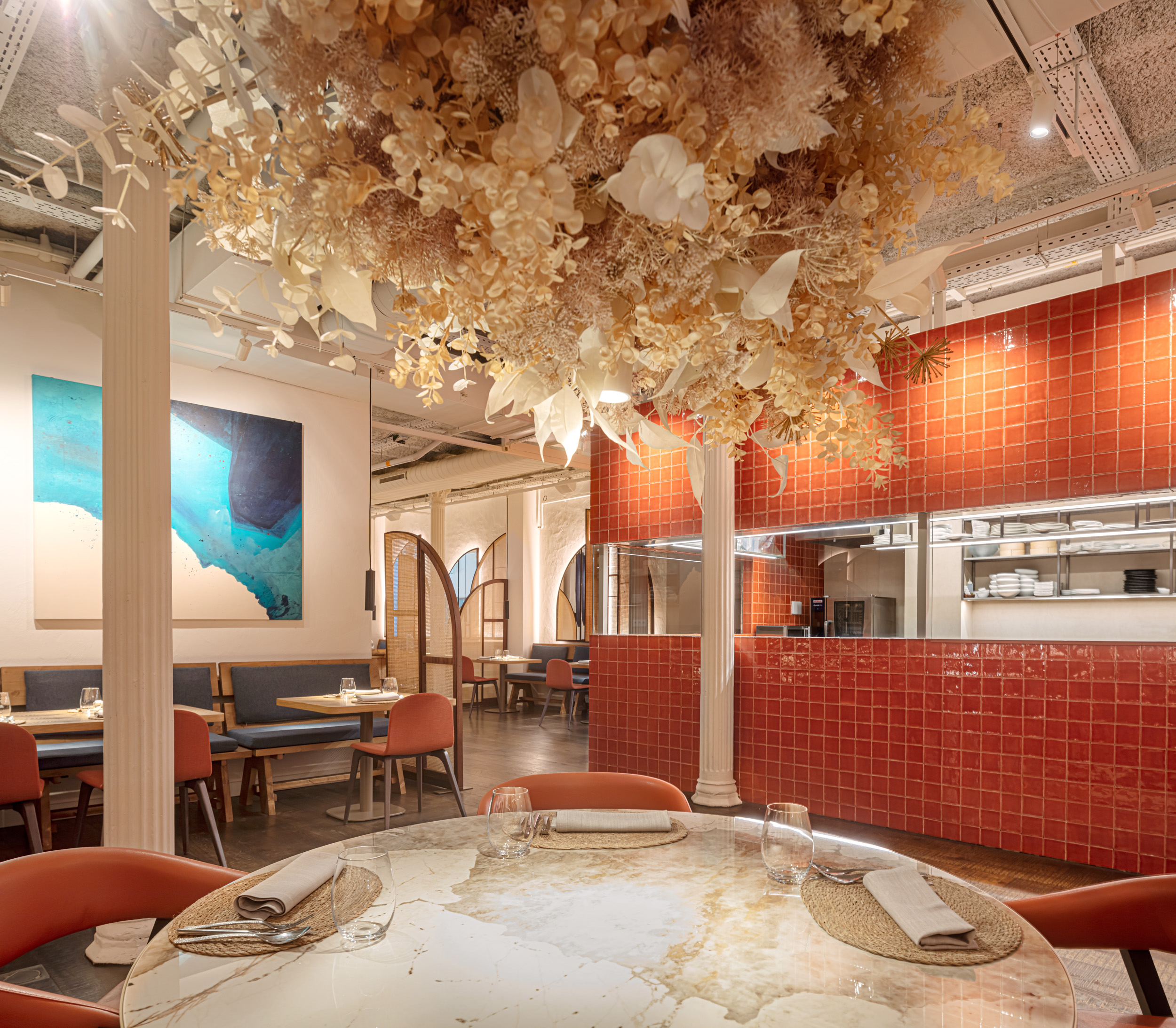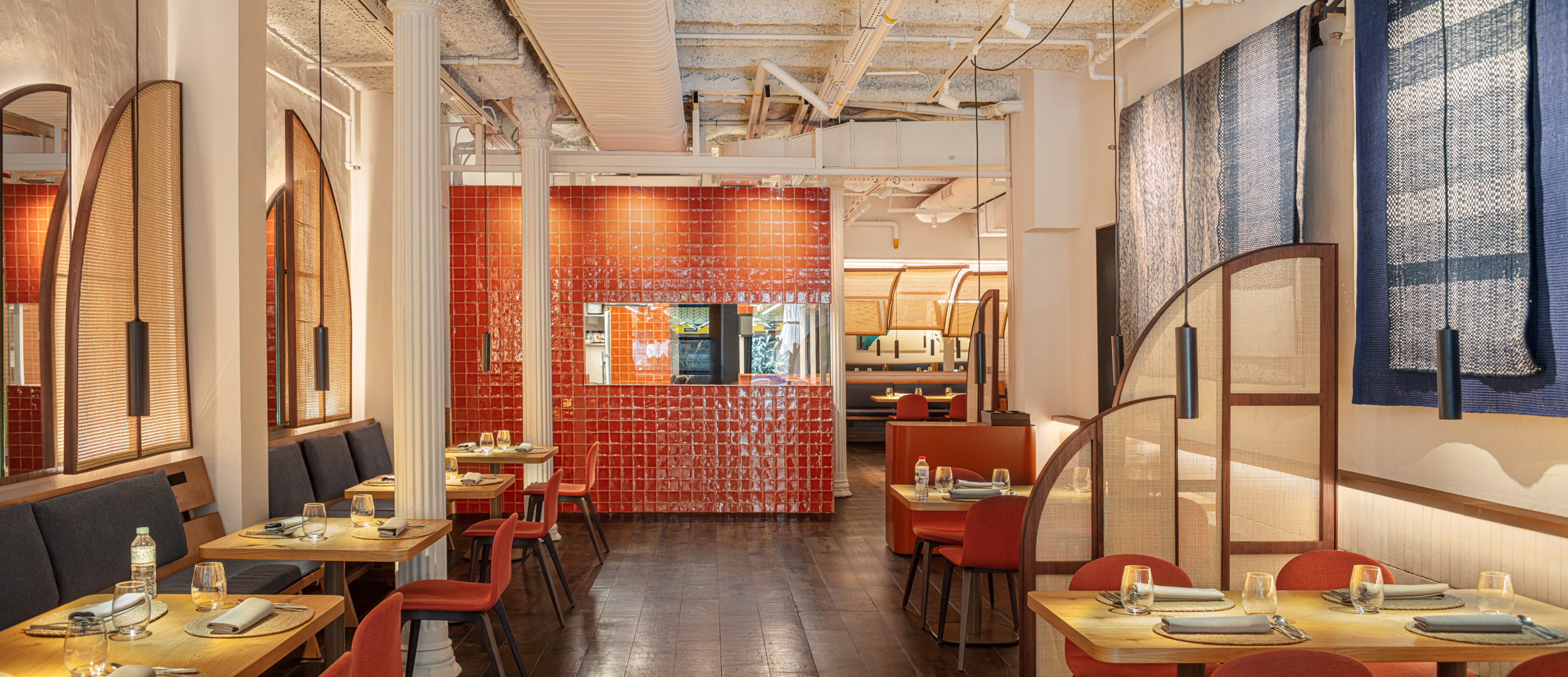 The curved shapes of mirrors and wicker dividers bring a warm counterpoint, converted into lamps of warm light scattered along the space, and bringing privacy to the tables, one of our client's priorities. They recreate an abstract landscape of sails and vessels, referencing the bay of Cadaques.