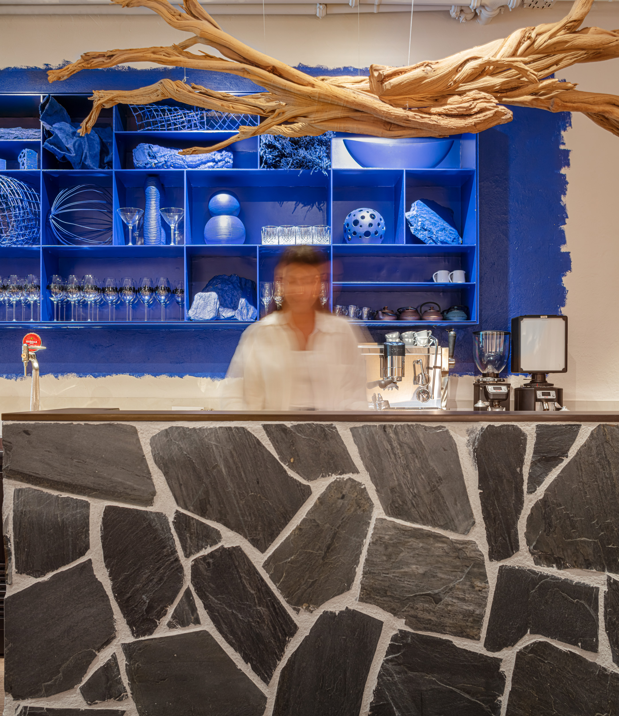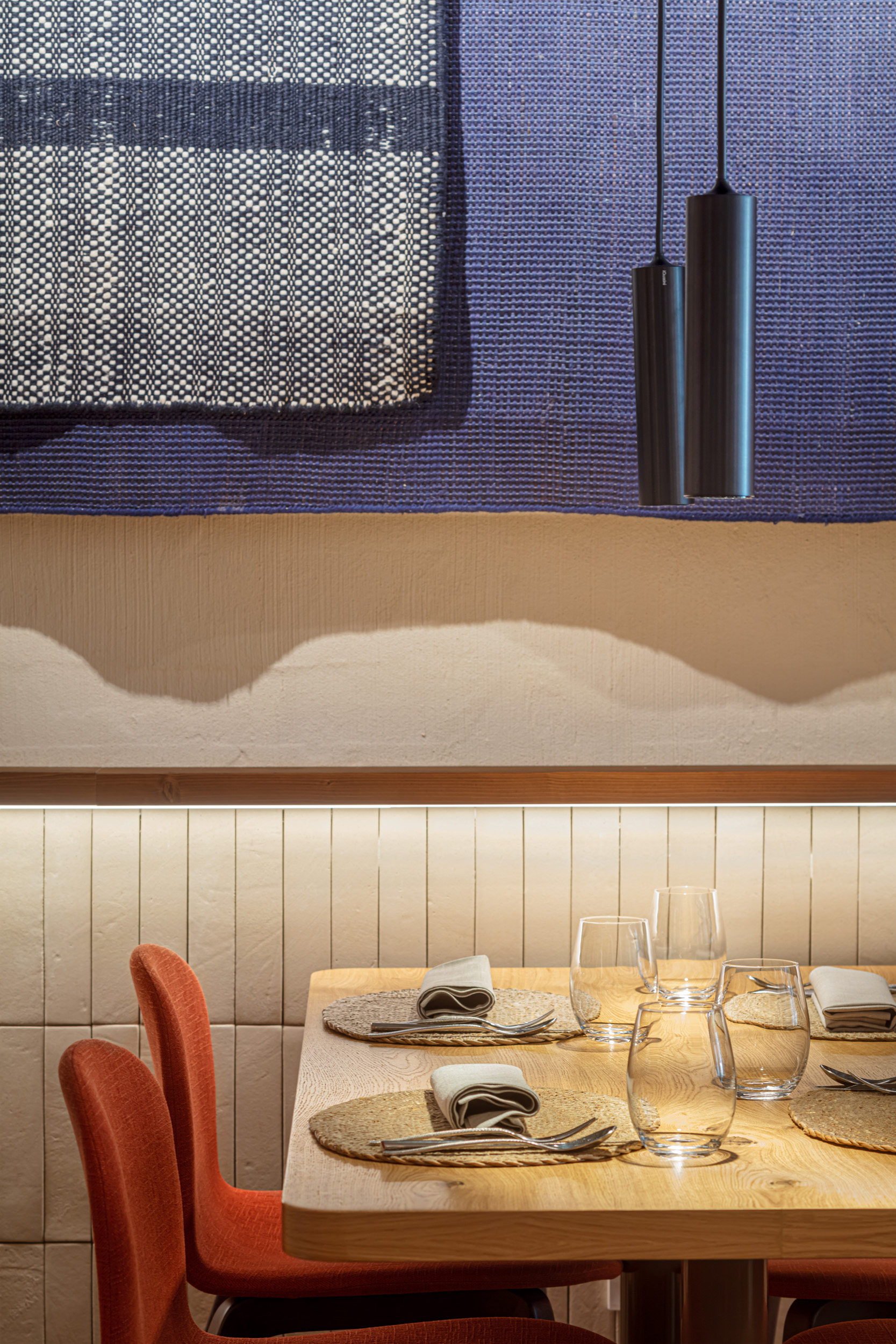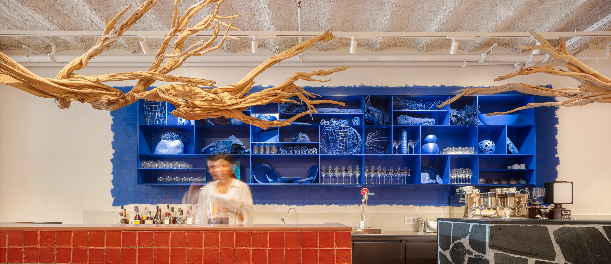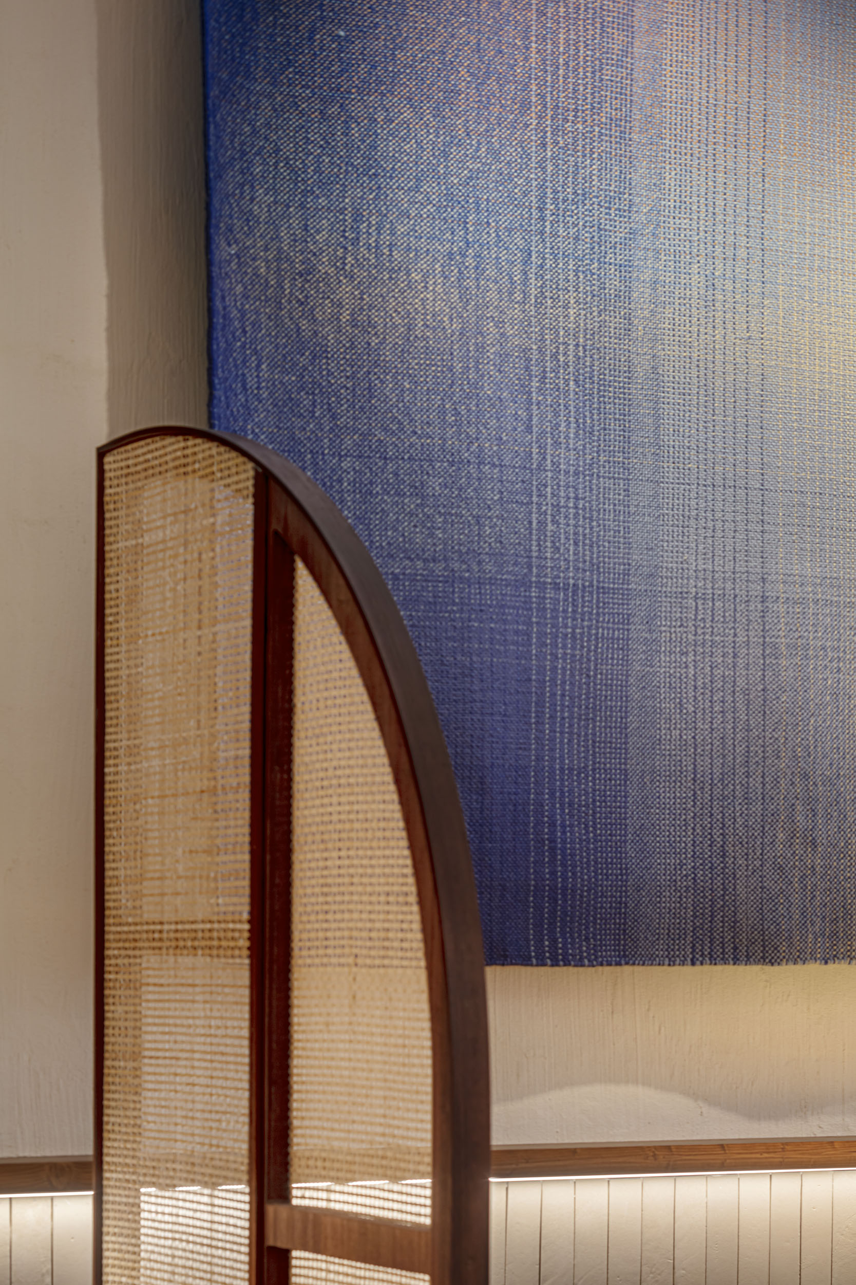 And so it is that we have imagined the design: an ample white space presided by three blue abstract "windows" towards the Mediterranean Sea: a sculptural, a pictorial and a textile window. Each of these "windows" became an opportunity tocollaborate with a different local artist, with whom we created custom-made pieces for the restaurant.