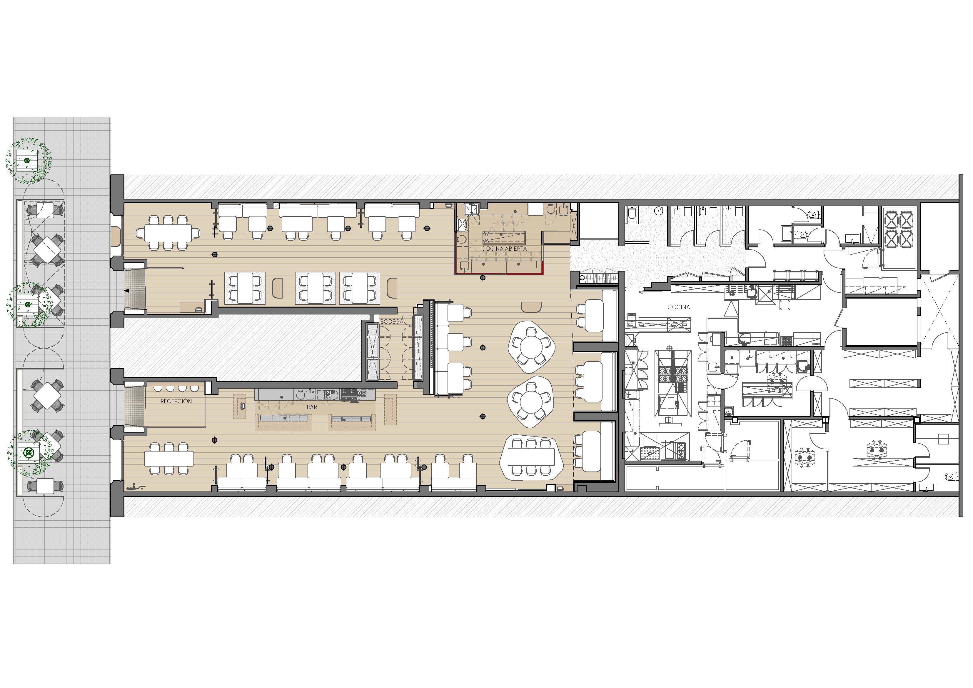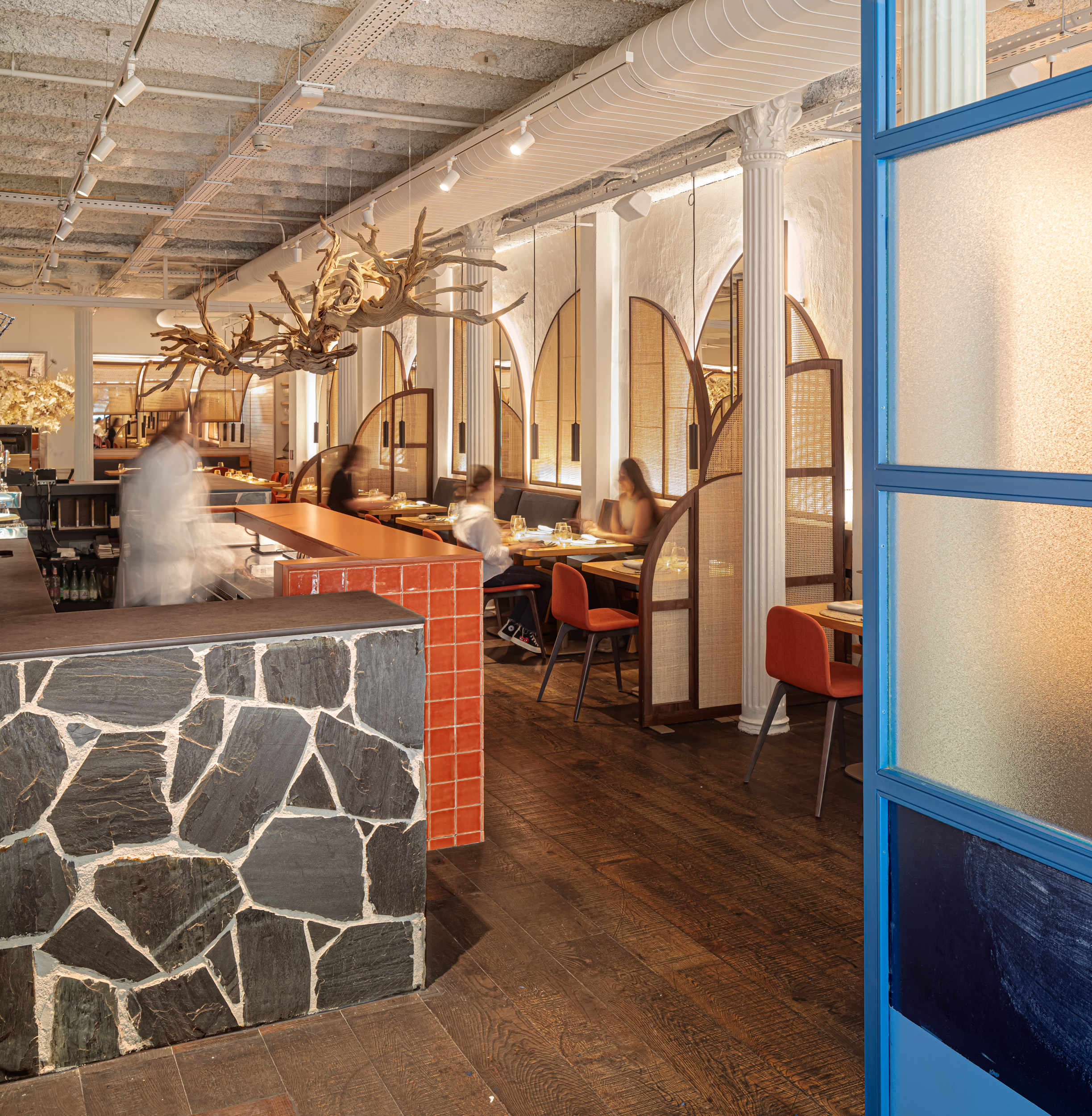 Bars and kitchens have simple and bold shapes, while they perform as energy nodes activating the different areas of the restaurant.
