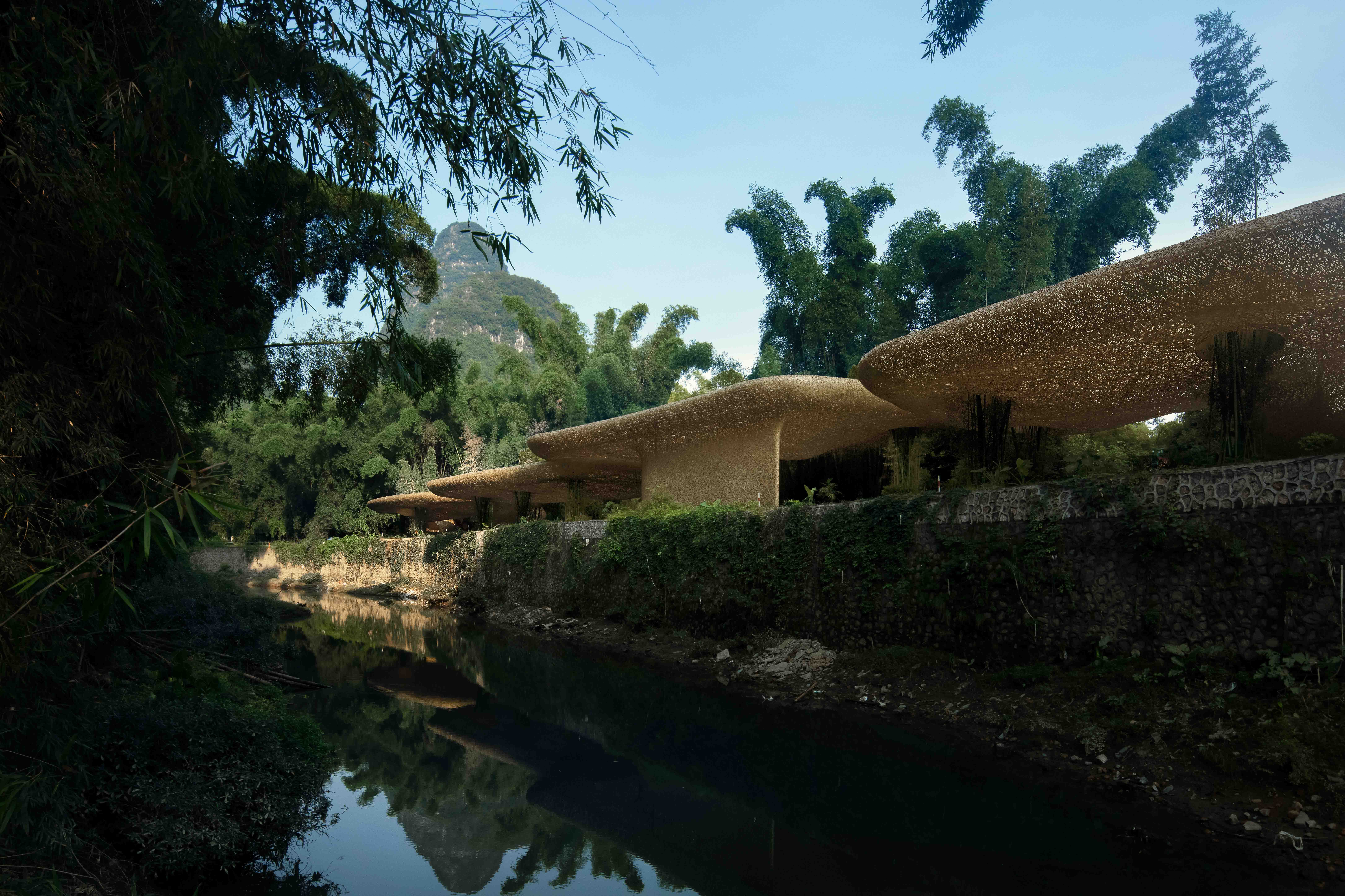 This project was developed while maintaining most of the existing Impression Sanjie Liu Performance Building, which has been in operation for 15 years. Currently, a vast bamboo cluster covers most of the site, creating a structure where pipes and leaves intertwine. The new space harmonizes with the existing elements while introducing new spaces, utilizing the characteristics of bamboo in the process. The goal is to naturally fill the surroundings with bamboo forests and hills. The structure of the canopy, supported by tube-like columns, is not visible on the spot. It features a woven ceiling with a reversed landscape form, undulating between surfaces of different heights. This expands an understanding of nature and captivates people's fascination with it.