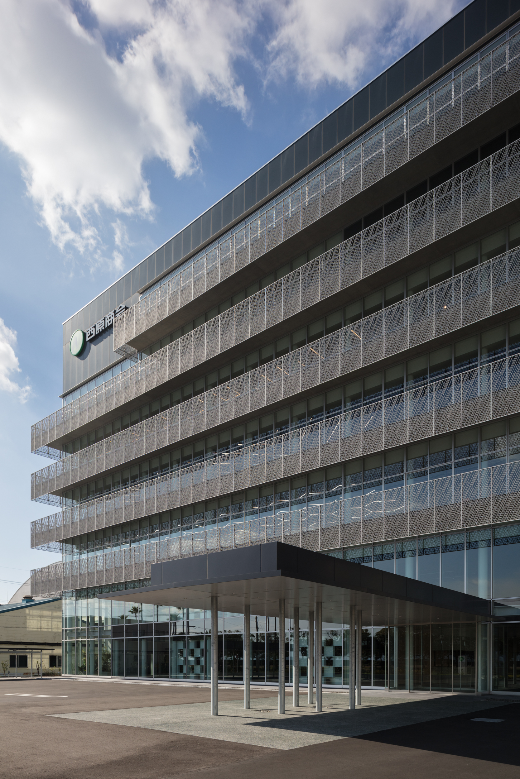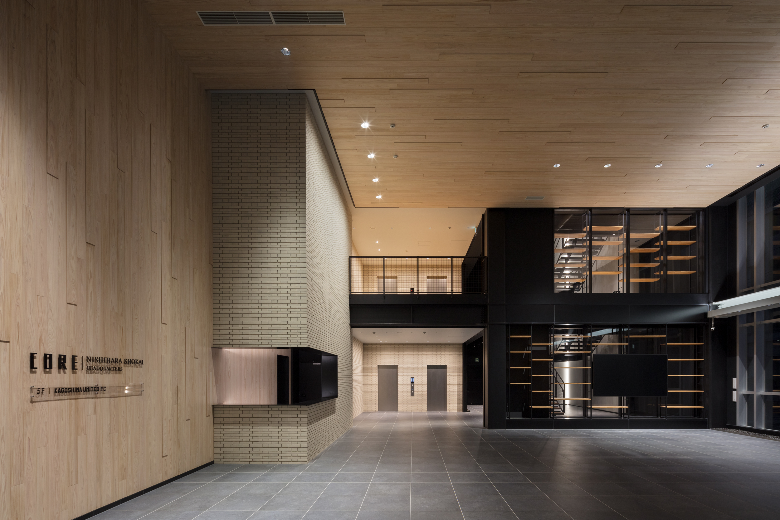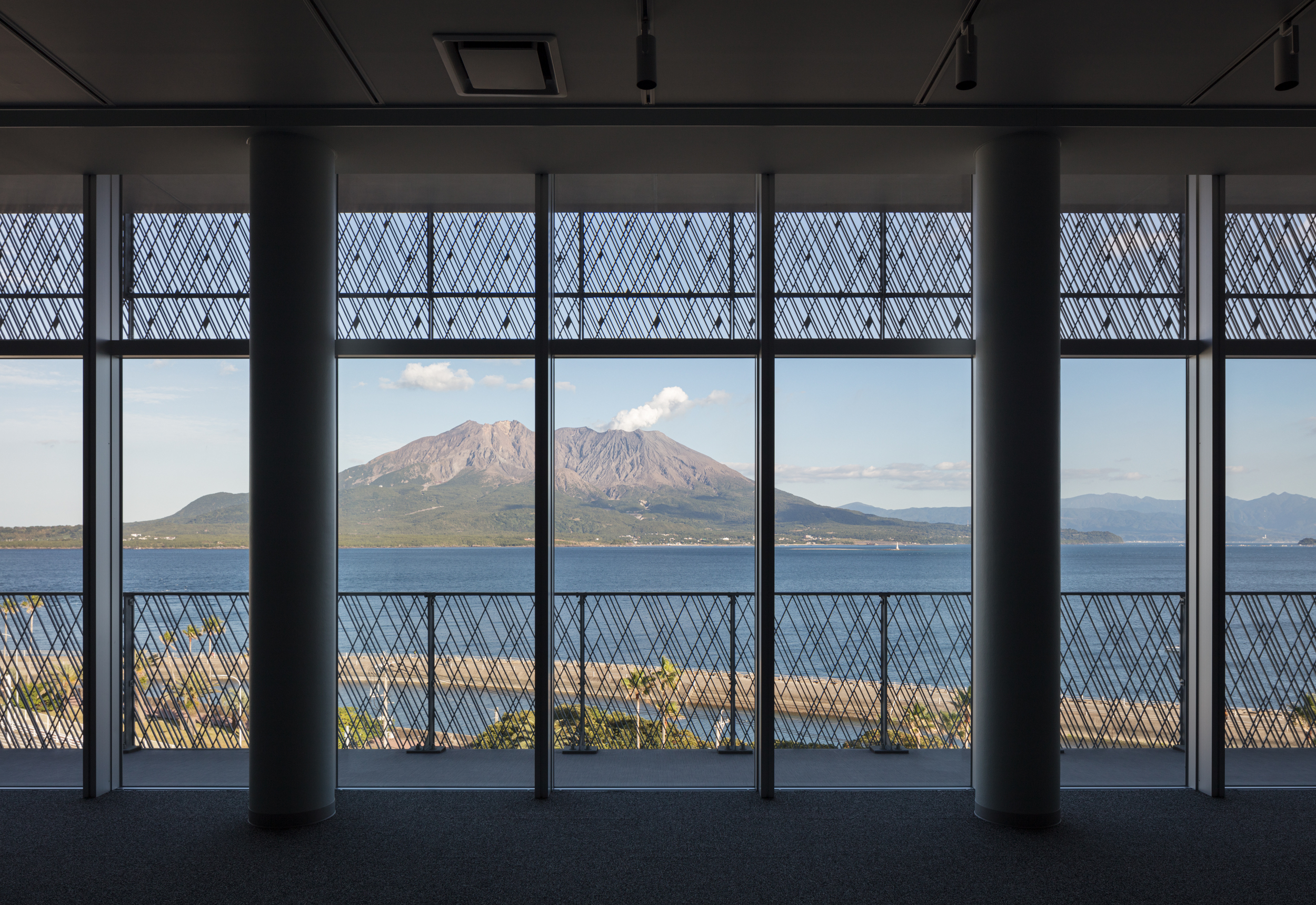 This site overlooks the iconic island of Sakurajima, known for its active volcano. Given the privilege of being able to observe the volcanic activity from the new building, a transparent façade was essential. At the same time, energy efficiency was a requirement, so long balconies that could block sunlight were designed, and unique panels were attached. The windows of the office let in sunlight without obstructing the view of the volcano. The architecture expresses the food business as its core concept. Locally sourced fire-treated wood, white tiles resembling cookies, and light-colored interior finishes were chosen. In response to the client's request, a distinctive design was established for each floor, focusing on ceiling and lighting to create unique indoor spaces, and the overall glass façade was designed to be impressive and symbolic.