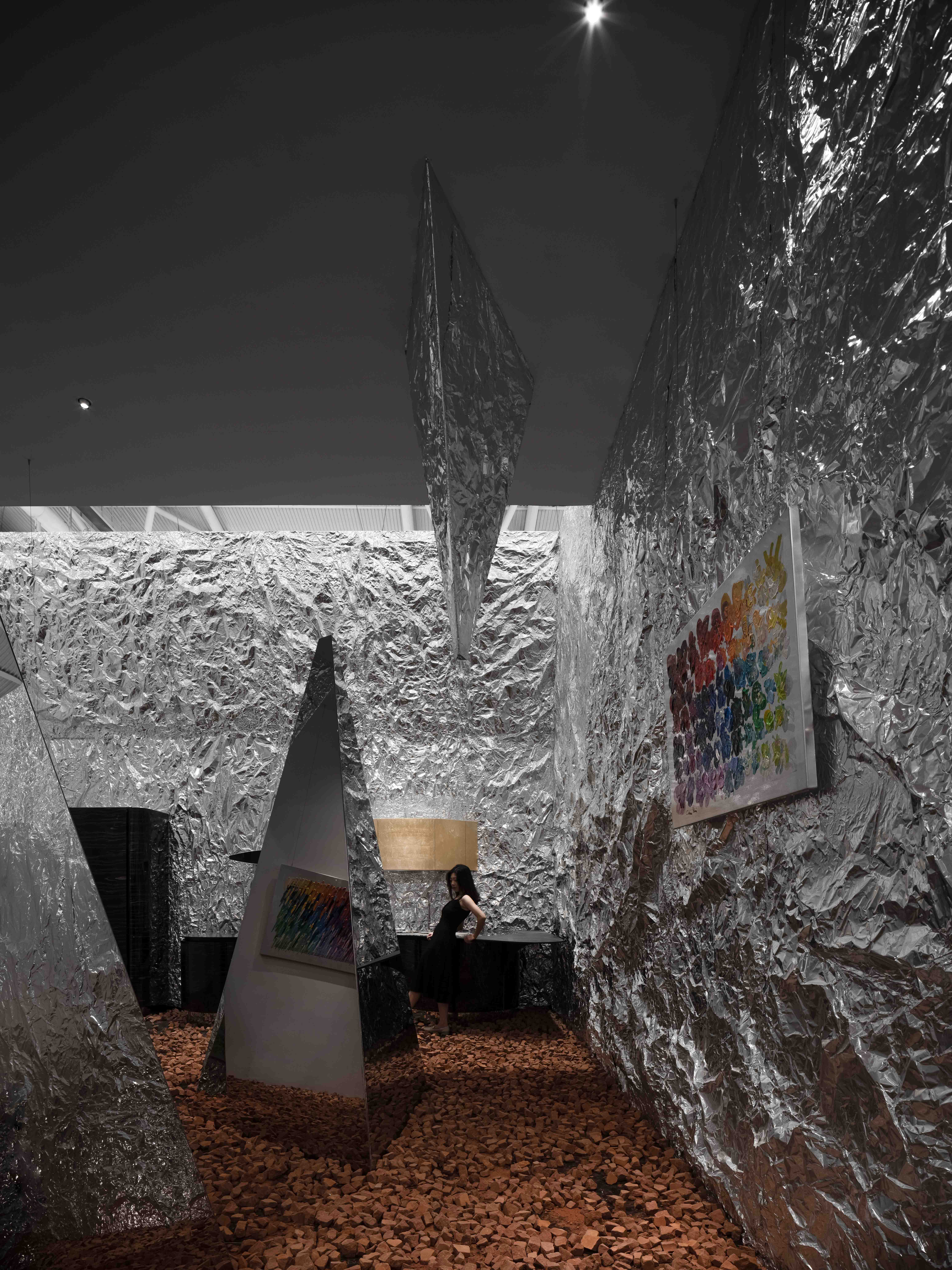 미러갤러리는 그림과 주방용품을 전시하기 위한 단기 전시 공간이다. 한 공간에 어울리지 않는 두 물건을 통합하여 방문객과 소통함으로써 인상적이며, 다양한 경험들을 담은 “예술 갤러리”를 디자인했다. 수많은 방문객들을 고려하여, 공간 분할을 통해 자유롭지만 직관적인 분위기를 조성하기 위해 삼각형 구조를 활용했다. 방문객들이 공간으로 움직이는 순간, 삼각형의 거울은 반사에 의해 변화하는 이미지들을 보여준다. 이는 개인과 다른 사람들, 물건, 변화하는 풍경, 그리고 공간에서 일어나는 모든 활동을 비춘다.