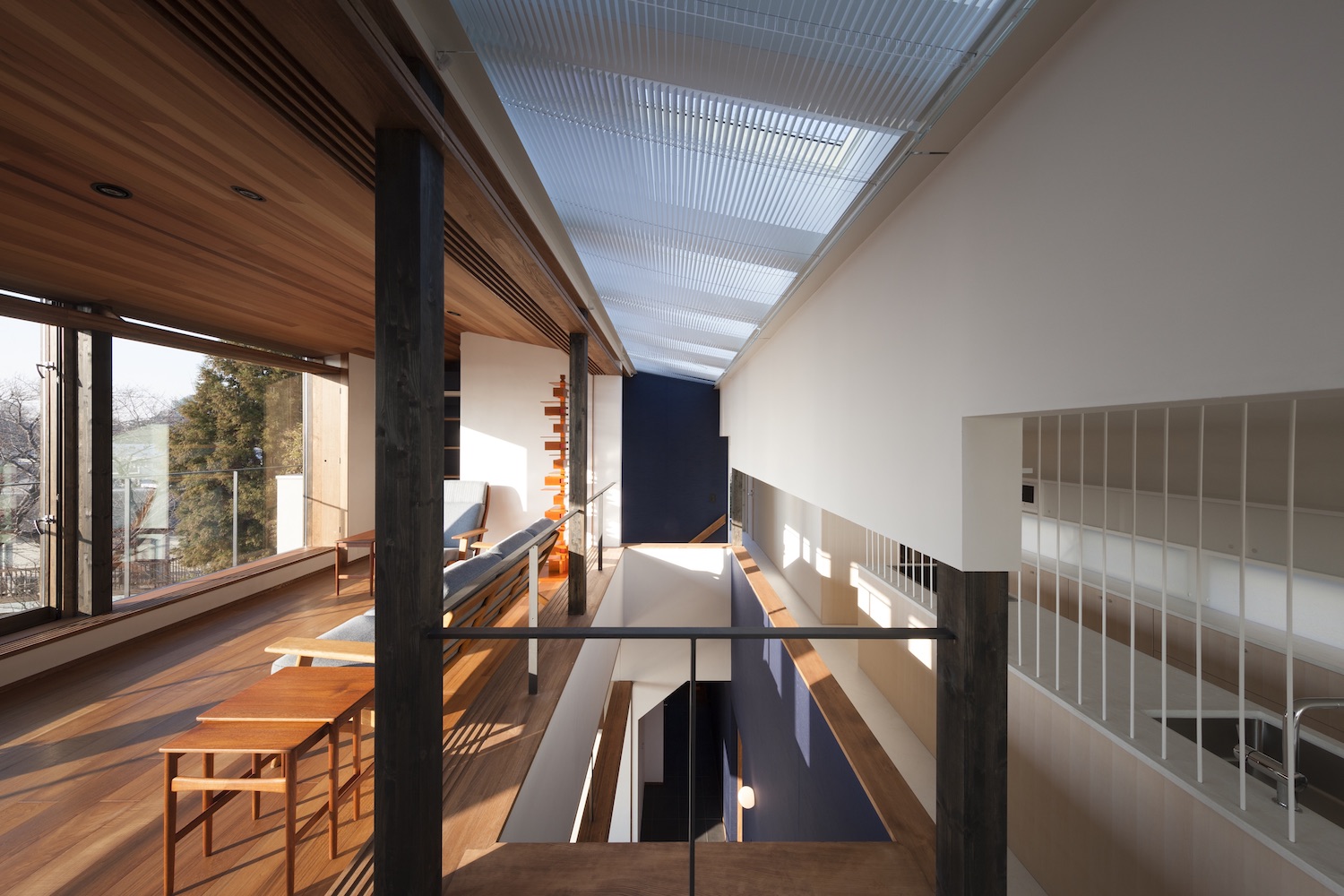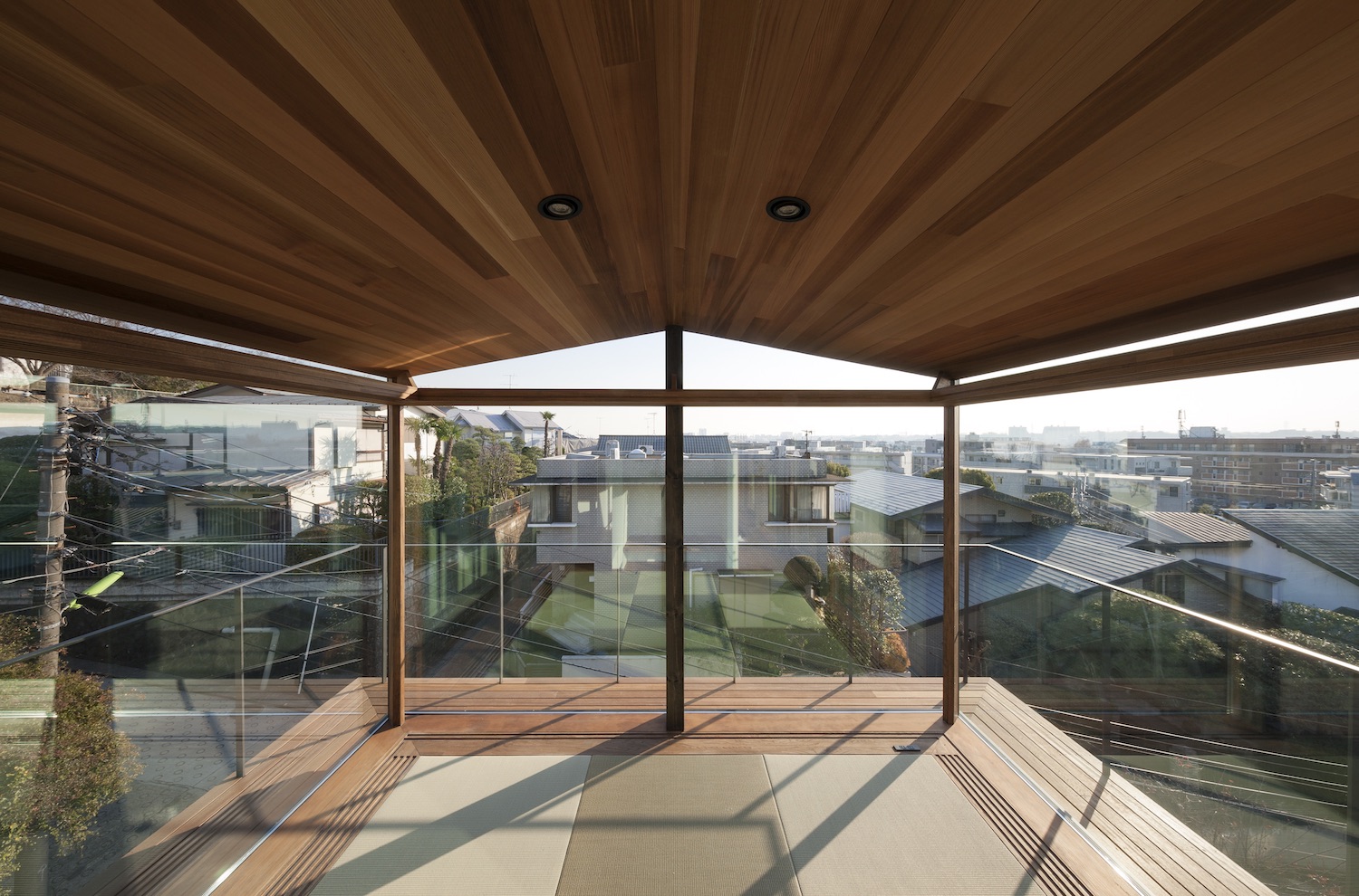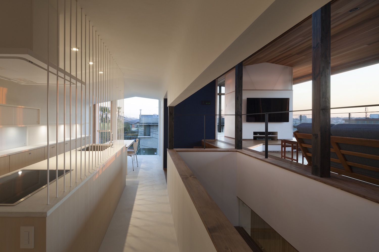 외부는 3개의 블록들로 구성되어 있다. 단일 층의 차고는 경사를 파고 들어가며, 거실은 공중에 떠있는 것처럼 보이고, 다이닝룸은 벽으로 둘러싸여 있다. 지하 차고는 철근 콘크리트로 건설되었다. 1층은 철재 프레임이 있는 유리 벽이 둘러싸고 있으며, 2층은 목재로 만들어졌고, 기둥, 빔, 그리고 벽으로 구성되어 있다. 이는 지진 및 바람에 대한 저항을 고려한 결과이며, 주변 환경에 적합한 구조적 형식을 포함하고 있다. 내부는 블록들 사이에서 변화하고 계단과 천창에 의해 분할된다. 공간은 안에 있는 사람이 움직일 때마다 급격하게 변화한다.