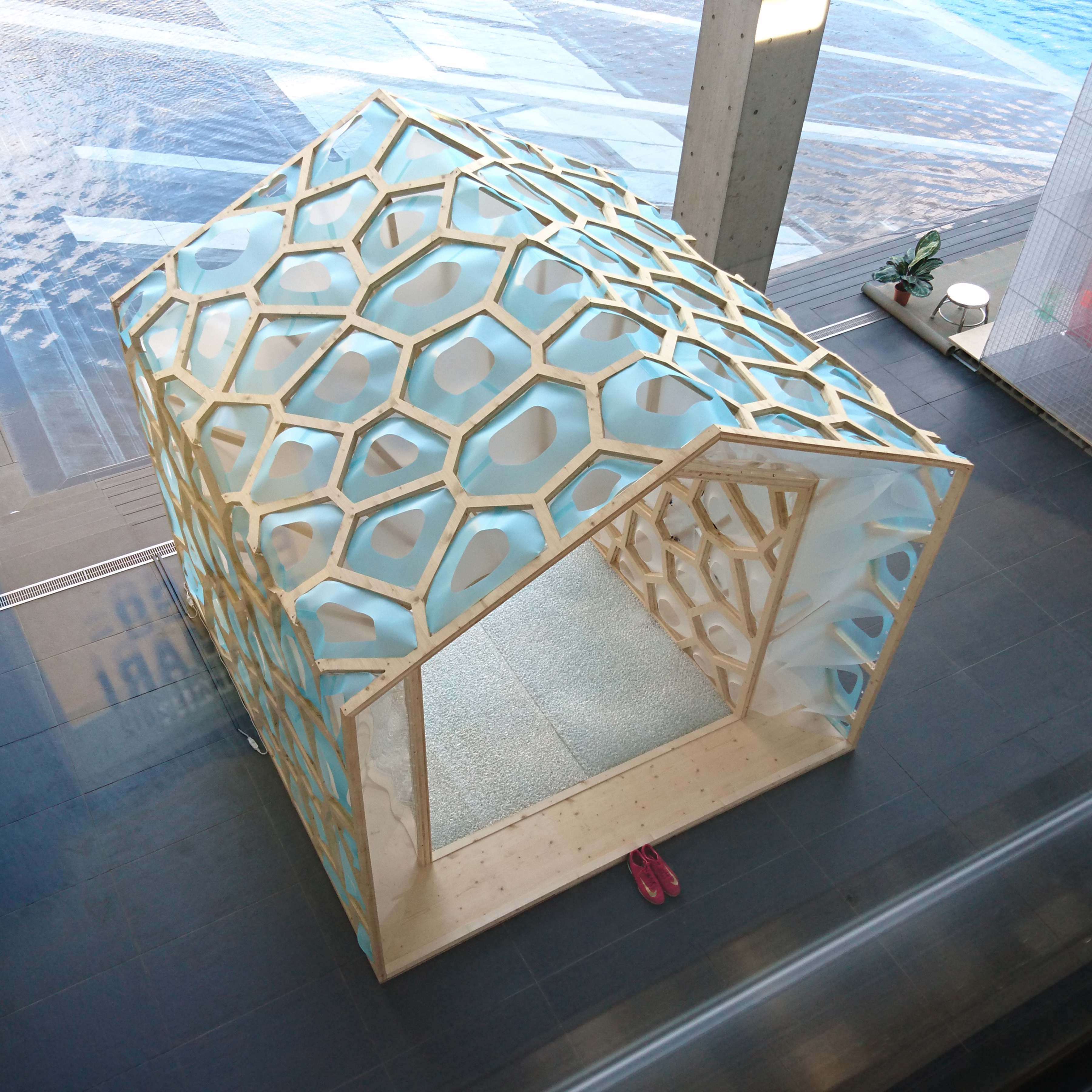 이 임시 예술작품은 약 0.9m2 규모의 오두막에 두 개의 다다미 공간이 포함된 구조물이다. 용도는 일본식 정통 다도공간이다. 2018년도 이치고 츠마리 예술 트리엔날레(Echigo-tsumari Art Triennale)에서 건축가들이 20세기의 주류를 이뤘던 일원적인 공간의 개념을 극복하는 방법이라는 주제를 바탕으로 계획됐다. 우리는 무작위적인 골조 패턴을 통해 변칙을 창조하기 위한 왜곡된 단일 공간이면서, 생물과 같은 외부와 소통의 필요성에 의해 닫히고 열리는 많은 구멍들을 갖춘 건축물을 제시했다.