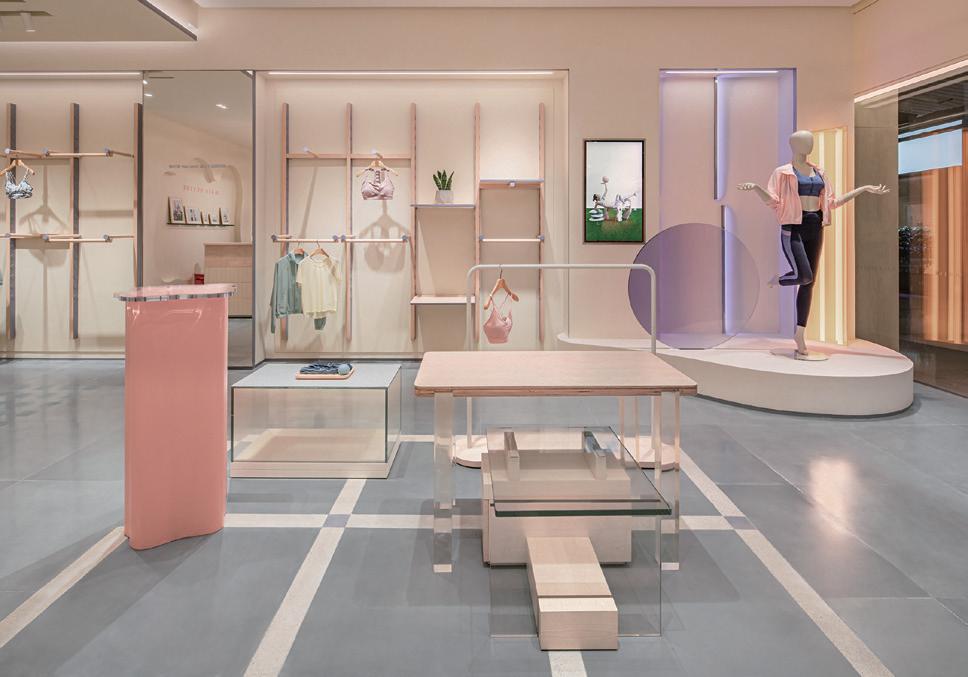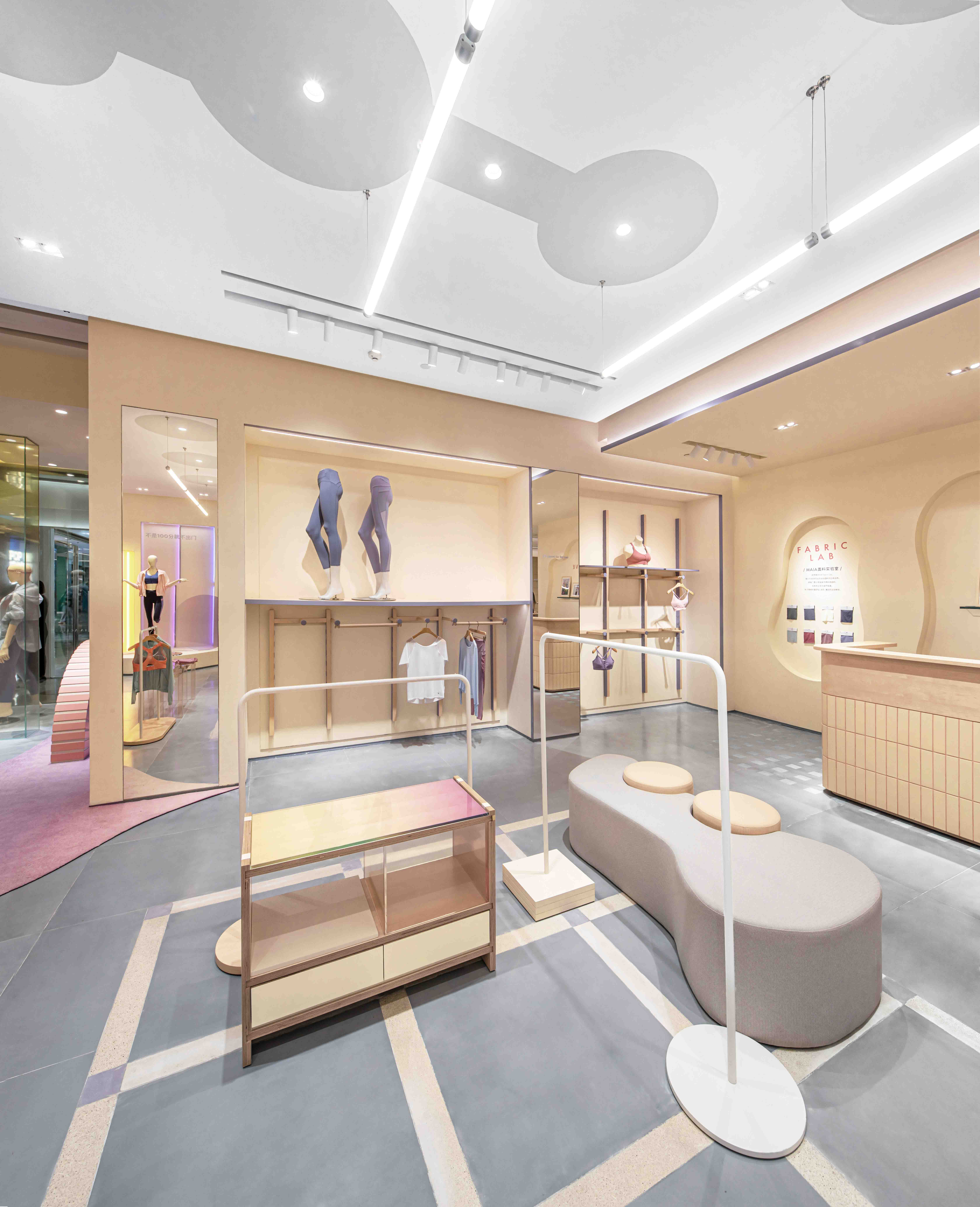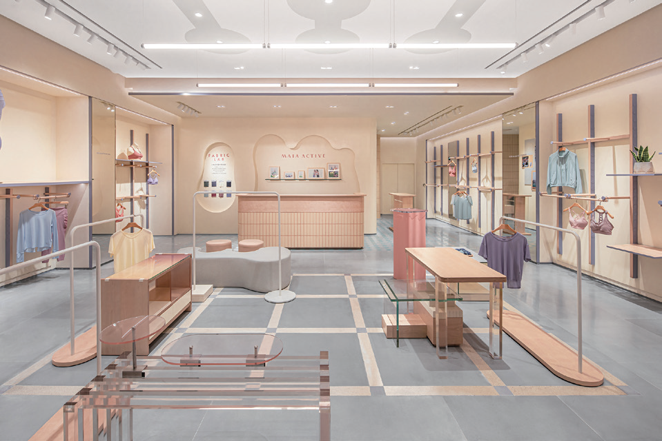 이 프로젝트는 중국의 스포츠웨어 브랜드인 MAIA ACTIVE의 베이징 산리툰에 새로 들어선 플래그십 스토어다. 브랜드 특유의 편안하고, 자유로운 야망에서 영감을 받은 설계자는 “자유로운 영혼”을 디자인 콘셉트로 설정했다. 매장은 전체적으로 크림옐로우색이 사용됐으며, 굴곡진 입구를 통해 멀리서 들여다보면 크림 케이크의 한 단면처럼 보인다. 부드러운 노란색은 고객들을 공간으로 끌어당긴다. 뿐만 아니라, 인테리어에 활력과 율동감을 불어 넣어주는 살몬 핑크와 보라빛이 나는 회색도 다양한 질감과 형태로 사용되어 있다. 불규칙적인 다각형의 공간은 입구 안쪽의 둥근 스탠드와 중앙에 놓인 가구들을 통해 피팅 영역, 휴식 영역 그리고 월 디스플레이 영역의 여러 핵심 블록들로 나눠진다. 전체적으로 둥글둥글한 콘셉트의 형태는 이 매장의 활기와 운동감은 높이고 지루함을 깨기 위한 요소이기도 하다.