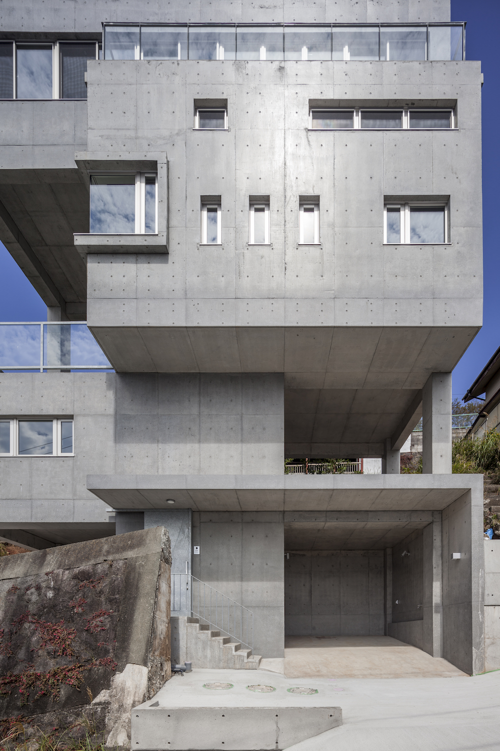 바다의 아름다운 경관을 마주하는 가파른 언덕에 있는 아타미 타워하우스는 강한 해안 바람에 견딜 수 있도록 철근콘크리트조로 지어졌다. 건축주의 요청에 따라 바다를 내려다보기 위해 수직적 형태를 가지고 있으며, 거실과 낮은 층에 있는 침실은 탑처럼 쌓인 모습이다. 공사 당시에는 이 집이 들어서게 될 경사지가 이러한 수직 볼륨을 감당하기 어려운 상태였으나, 건축가는 수직으로 쌓을 고층 매스들을 최적화하면서 각 층마다 지지대가 분산되도록 배치하여 재밌는 형태를 만들어냈다. 이러한 각 층의 빈 공간들은 자연스럽게 열린 공간이 됐다.