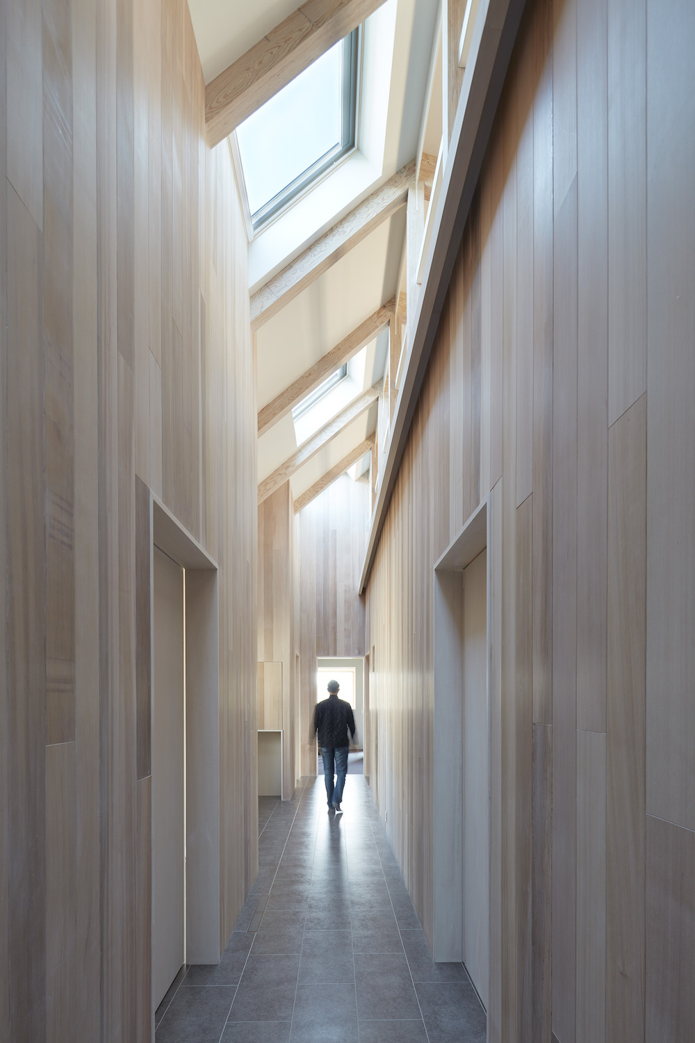 화장품 용기를 개발하고 제조하는 회사의 새로운 본사 건물은 균일한 채광, 안정적인 실내 온도가 유지되는 편안한 작업 공간으로 설계됐다. 가동 공간은 사업의 전반을 관리하는 사무실 주변에 배치되어 있으며, 외벽을 따라 외부와 접할 수 있는 주량식 현관이 있고, 지붕은 가장자리에 설치되어 있다. 깊게 드리우는 처마는 실내를 감싼다. 중심 공간을 따라 박공 형태로 만들어진 지붕은 내부 실의 층계를 다양하게 활용한 결과물로 만들었고, 업무 공간의 다양성을 보여준다. 하얀색으로 감싸진 나무 박스 같은 느낌을 주는 건축물의 외벽은 방열금속시트로 덮인 단열성 높은 목재로 만들어져 있으며, 내부 환경을 쾌적하게 조절한다.