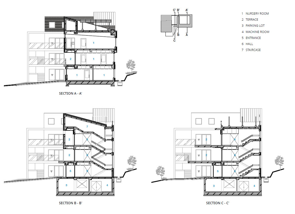 기존 다원 어린이집은 하나의 대지에 경로당과 어린이집이 존치되어 있었다. 부지는 서측 산속 막다른 6m의 미성길 도로와 인접하며, 동측과 남측은 생태공원과 연결되는 임야와 인접했다. 새로운 어린이집은 경사가 있는 6m 도로에서 보행자 동선과 차량 동선을 분리했고, 단차를 이용하여 일부 개방된 지하주차장를 계획했다. 주출입구 쪽에는 다양하고 개방적인 외부공간인 옥외 놀이터가 있다. 1층의 주진입부 근처에는 진입마당이, 보육실과 가까운 곳에는 전용마당이 있다. 홀과 계단실을 중심으로는 뒷산과 연결되어 주변과 소통하는 열린 배치 및 개방적인 공간이 펼쳐진다. 2층과 3층 외부데크는 홀과 연결되어 홀에서 열린 풍경을 볼 수 있으며, 아이들의 외부 놀이공간으로도 사용된다. 뿐만 아니라, 외부데크는 피난계단까지 연결되어 피난통로의 역할도 한다. 홀을 중심으로 계단과 외부테크는 뒷산과 남측 생태공원으로 열린 시야를 확보했다. 3층의 유희실은 경사지붕 측면 창으로 들어오는 햇살로 빛이 가득한 공간이 된다.
