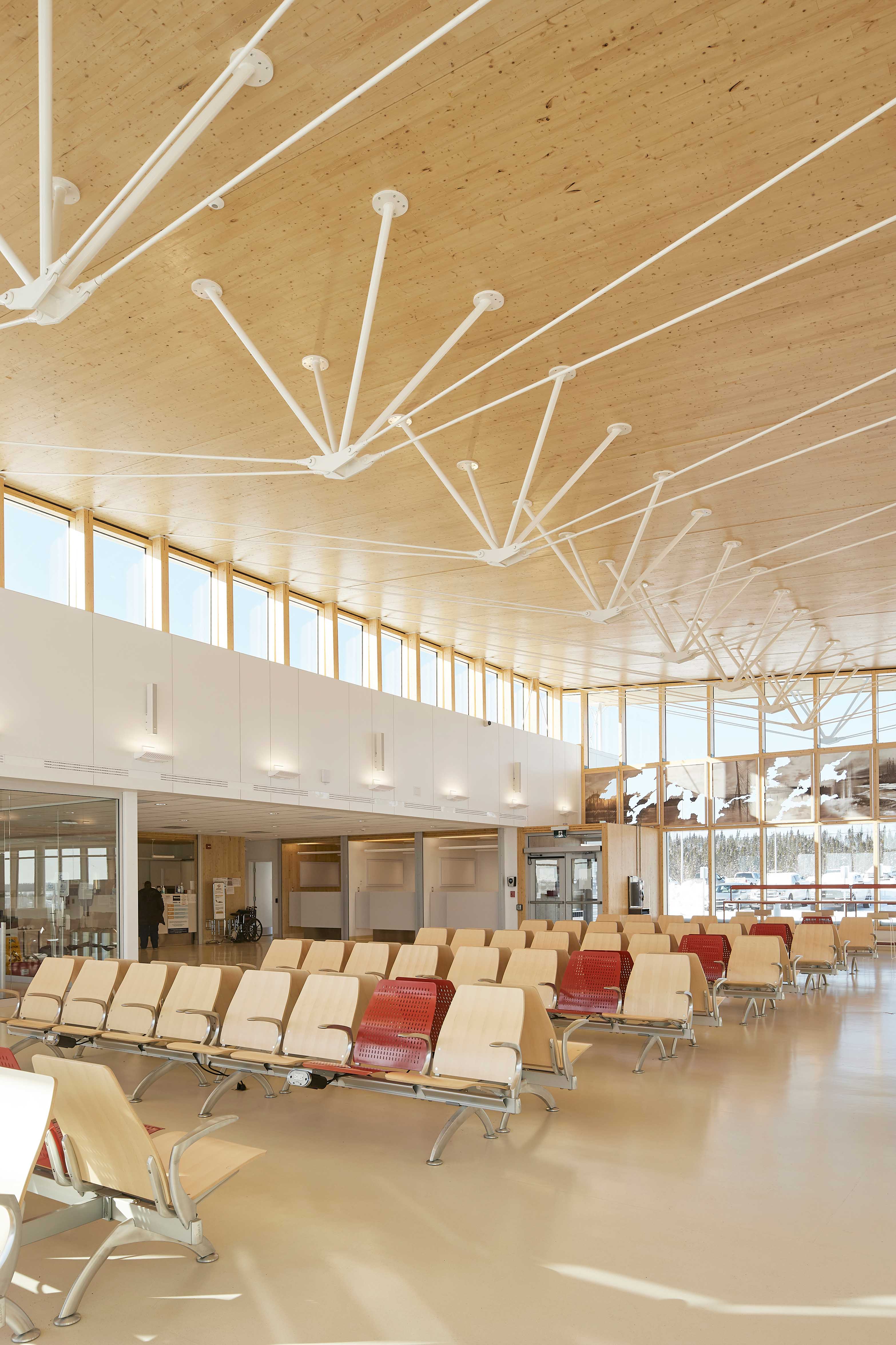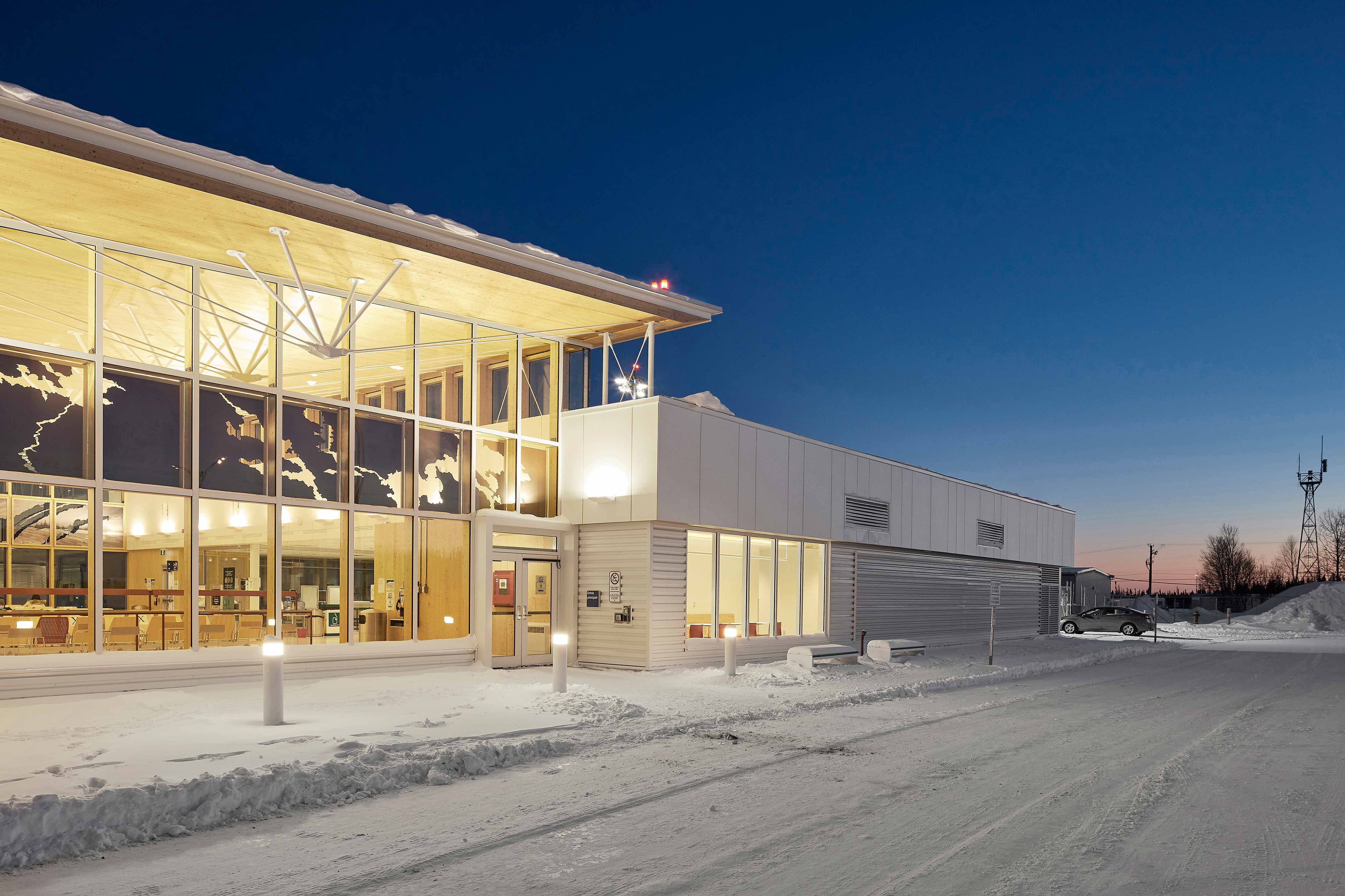 The new terminal building is composed of two low structures on either side of a glazed concourse. The latter serves as a central hub for passengers and connects all terminal functions and services, ensuring that they are easily identifiable and accessible. Its design establishes visual connectivity from the parking lot to the runway. Waiting travelers can watch their plane on the tarmac while others can monitor the pick-up and drop-off zone. This fluidity is further reinforced by the consistent use of materials and lighting treatment when moving from interior to exterior spaces. The exterior facade features the name of the airport in Cree and in French and is adorned with artwork by Emmanuelle Gendron cleverly integrated into the transparency of the timber curtain walls, paying homage to the Eeyou Istchee region.