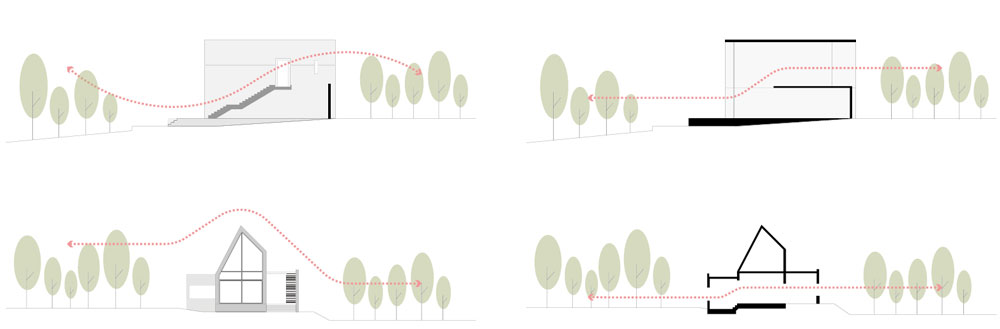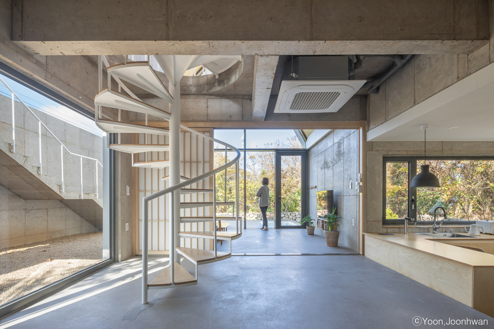 선흘숲은 선흘리 북쪽에 위치해 알밤 오름을 품고 멀리 수평선이 보이는 곳에 자리잡고 있다. 서측면으로 긴 땅은 6m도로에 면하며, 완만한 고저차를 가지고 있었다. 선흘숲은 지형적 속성을 반영하여 동선과 시선이 자연스럽게 흐르는 곳이다. 선흘숲 안에서는 어느 창문을 열더라도 곶자왈 숲이 보인다. 이런 한적한 땅에 어울리는 아담한 규모의 공간은 자연 속 한 켠에 담담히 서 있다. 방이 2개인 작은 주택의 공간은 레벨 차이로 더 풍부한 공간을 만든다. 깊숙이 내려 앉은 주방공간은 수평적 열림으로 인해 한층 더 매력적인 공간을 만든다. 노출콘크리트 벽에 접한 외부 계단은 제주의 자연을 만끽할 수 있도록 유도된 수직적 장치다. 작은 개구부가 있는 콘크리트 벽은 차단된 시선에 대한 배려이다.