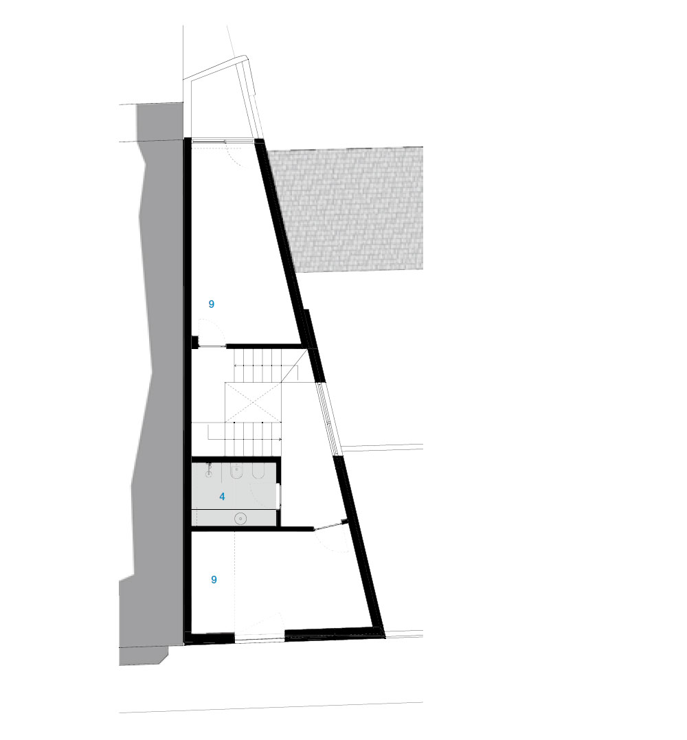 Casa Vertical is a single-family house located in the city of Porto, Portugal. The project intends to accommodate the functional program on a narrow plot in the downtown area of the city. The organization of the various spaces is done vertically and develops around a central staircase with the rooms distributed in half floors. The staircase unifies the intervention, where the guardrail unfolds like an origami piece. The verticality of the construction follows the street front, in the same scale and proportion. The house facade refers to the typical “Porto urban house” elevation composition, with its vertical windows, the tripartition of the facade and the cornice top. Likewise, it alludes to the classical structure of composition, with the demarcation of the base, shaft and chapiter. The monolithic character is reinforced by the uniform finish and the stereotomy lines of the facade.