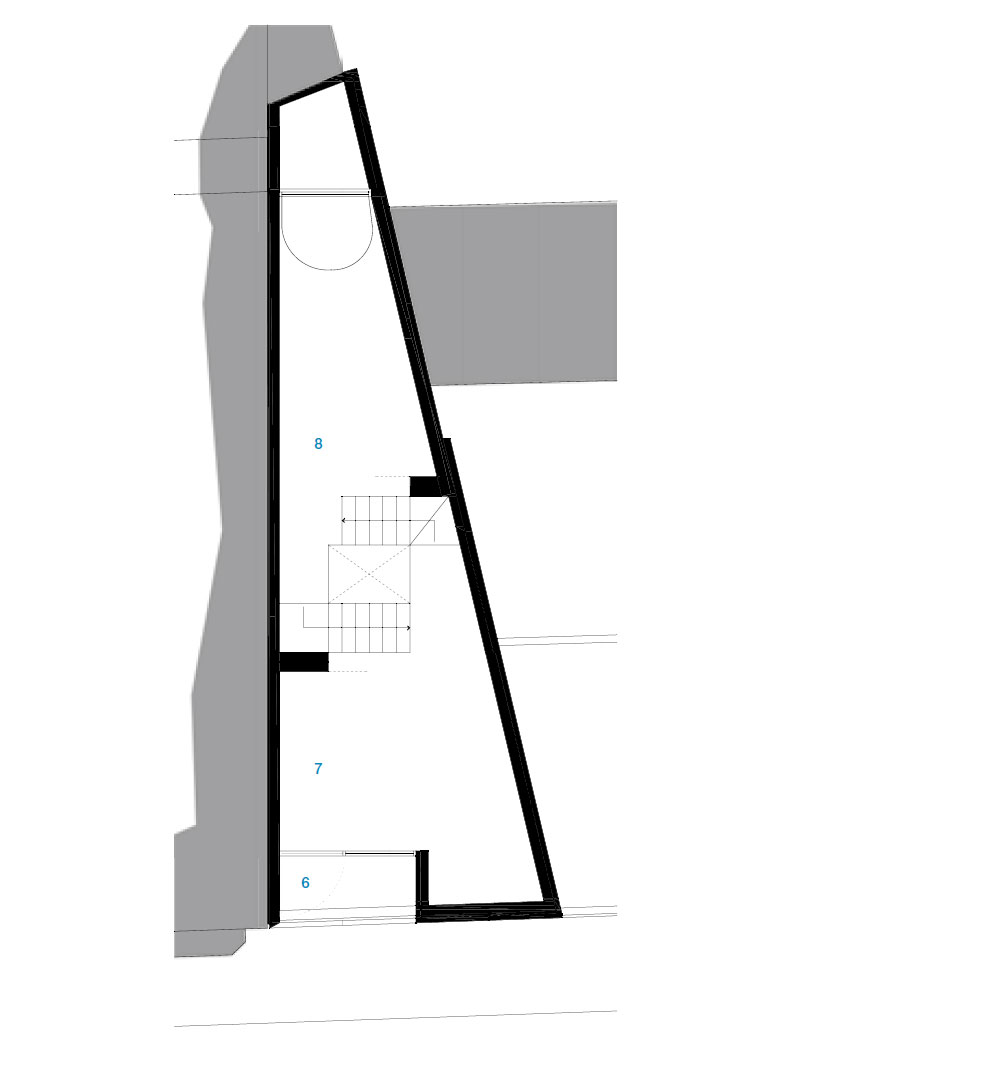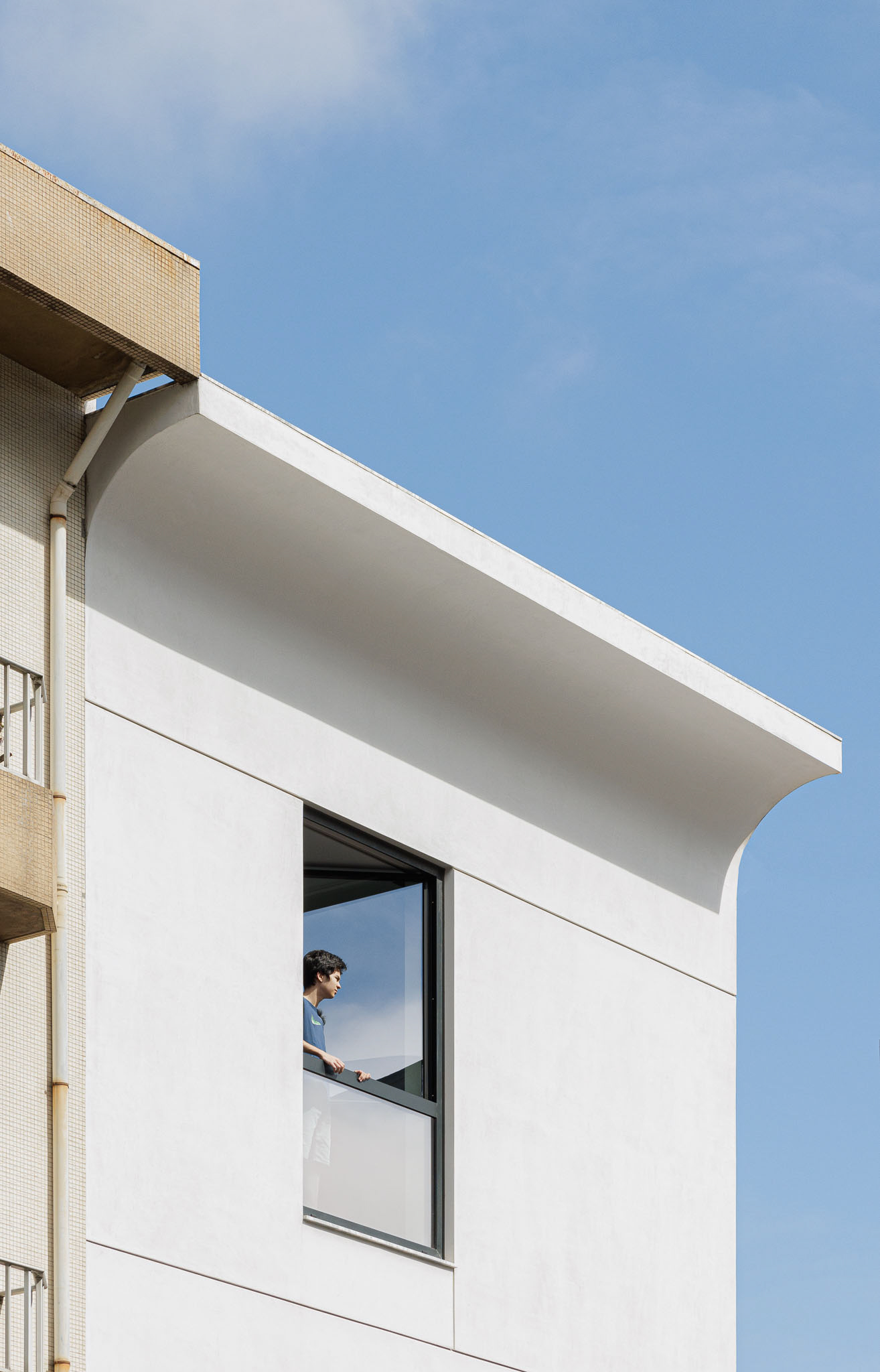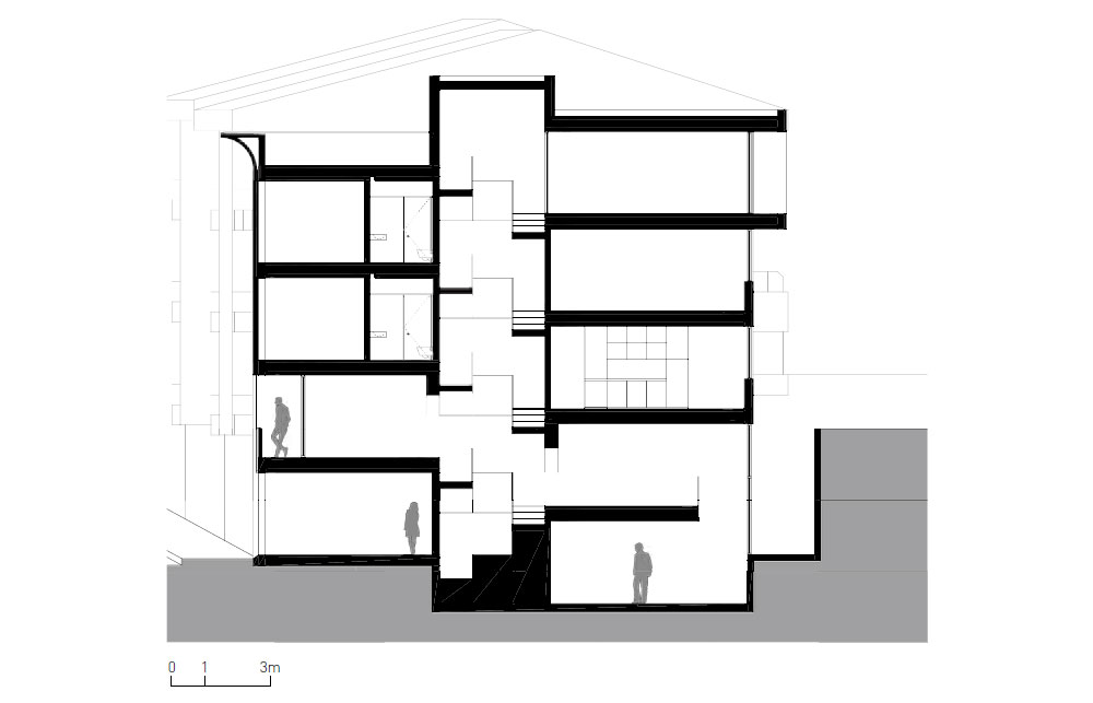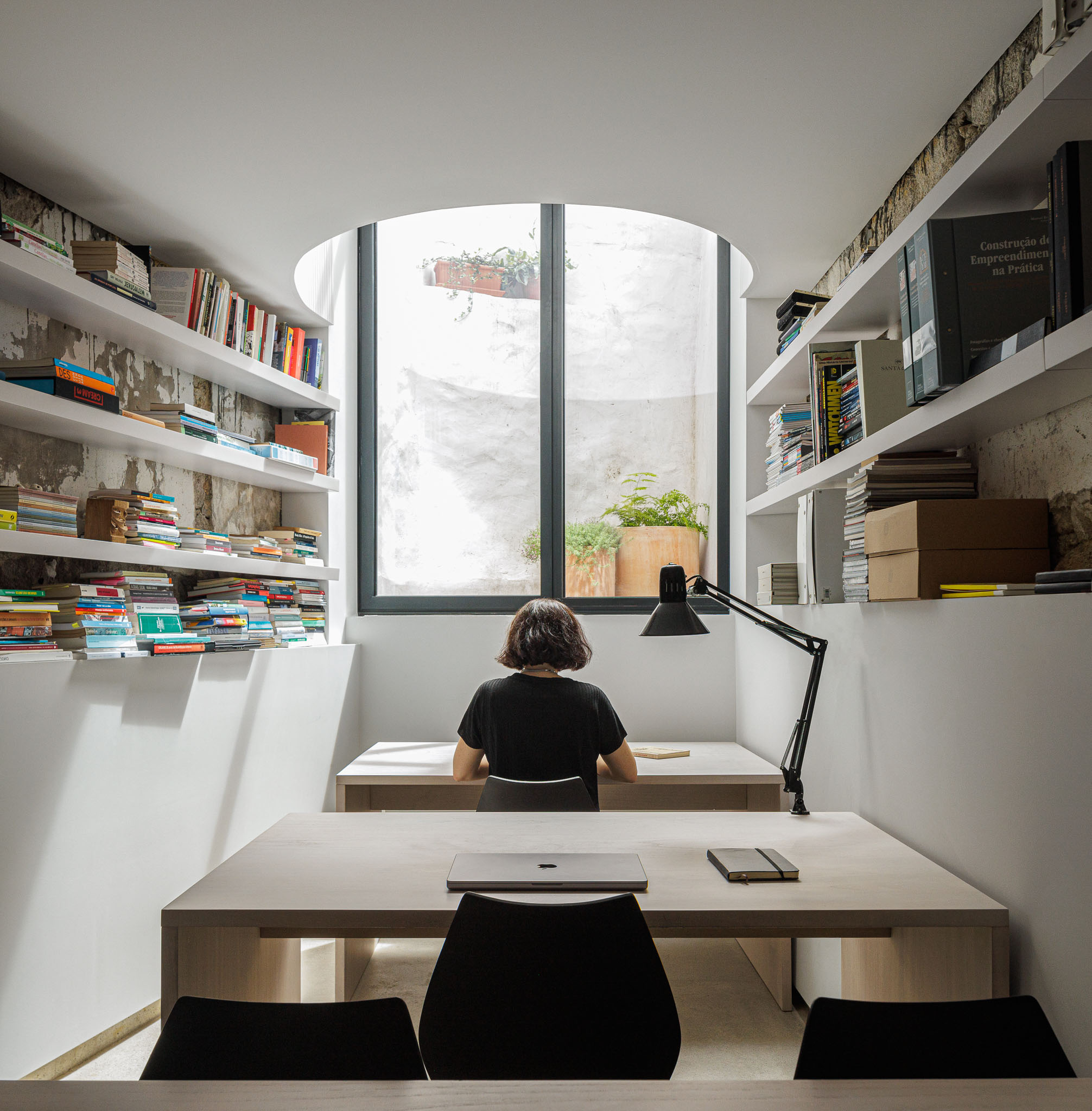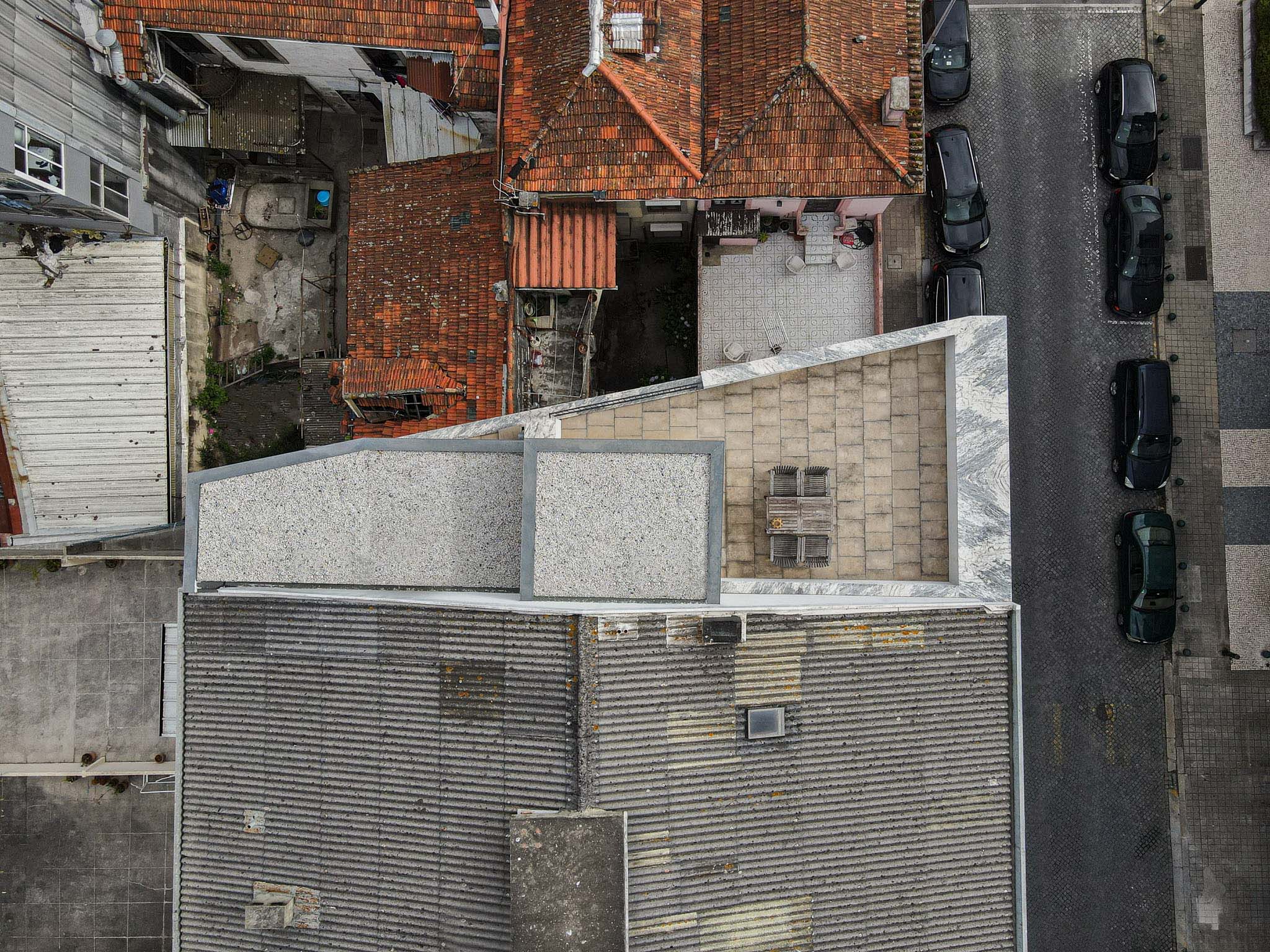 Casa Vertical is a single-family house located in the city of Porto, Portugal. The project intends to accommodate the functional program on a narrow plot in the downtown area of the city. The organization of the various spaces is done vertically and develops around a central staircase with the rooms distributed in half floors. The staircase unifies the intervention, where the guardrail unfolds like an origami piece. The verticality of the construction follows the street front, in the same scale and proportion. The house facade refers to the typical “Porto urban house” elevation composition, with its vertical windows, the tripartition of the facade and the cornice top. Likewise, it alludes to the classical structure of composition, with the demarcation of the base, shaft and chapiter. The monolithic character is reinforced by the uniform finish and the stereotomy lines of the facade.