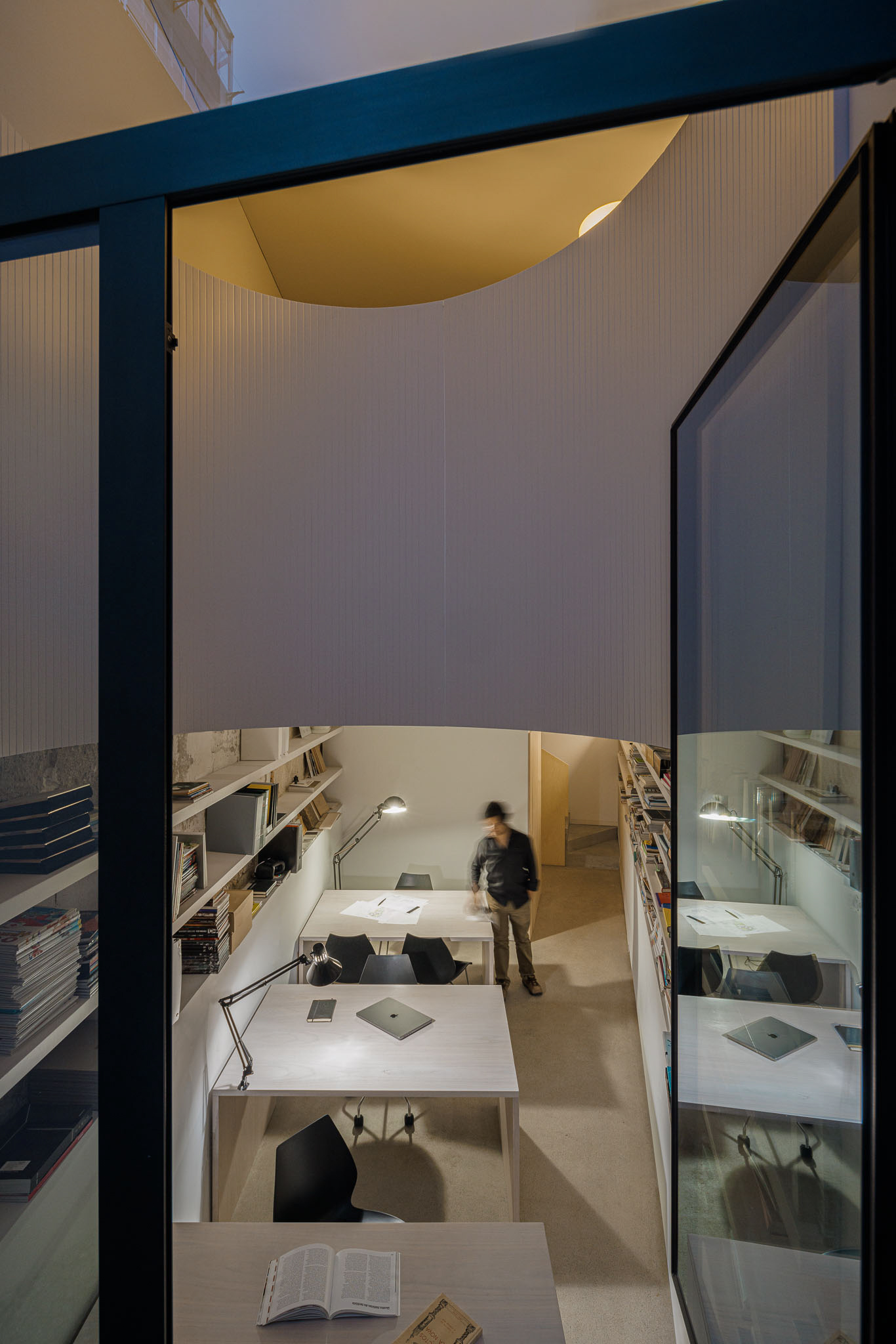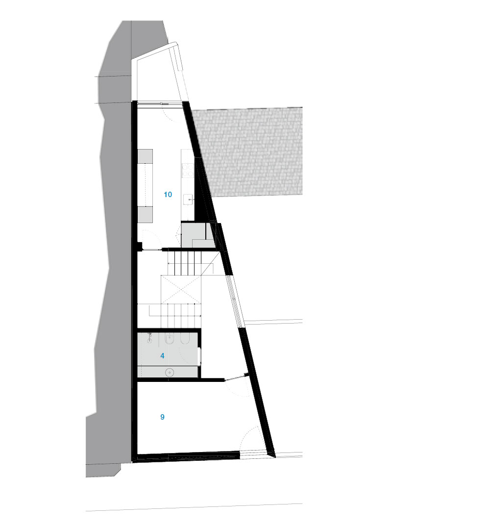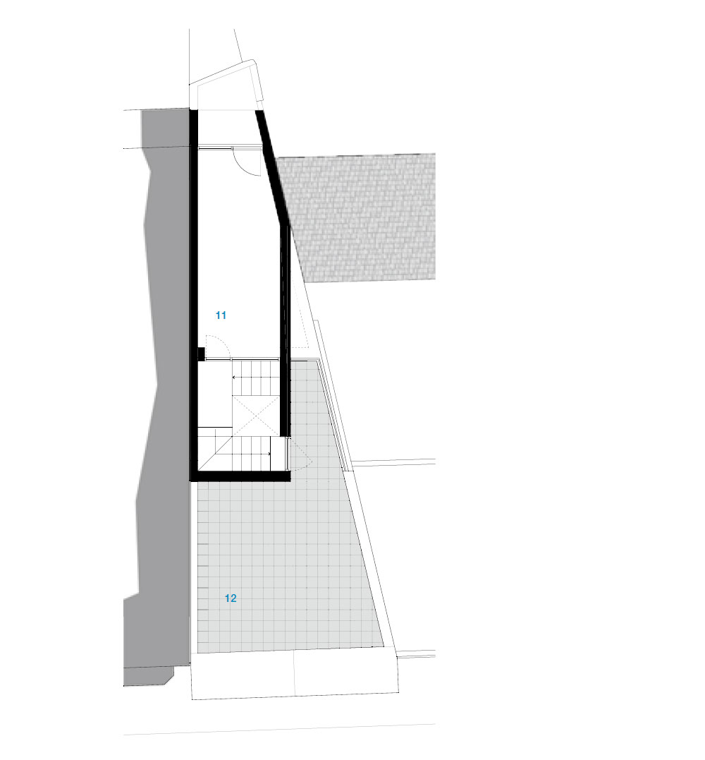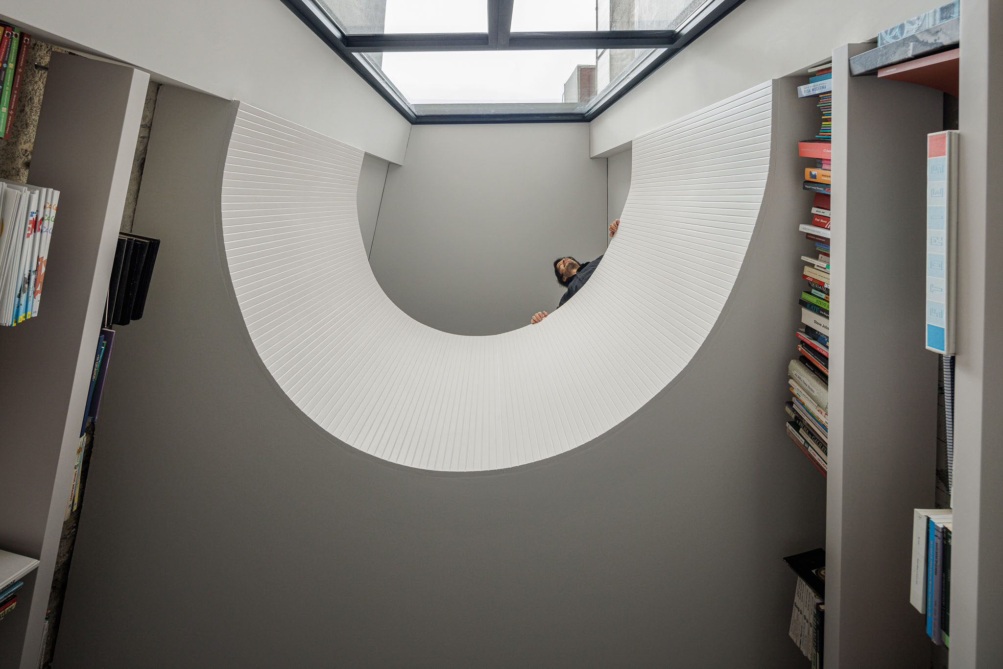 Casa Vertical is a single-family house located in the city of Porto, Portugal. The project intends to accommodate the functional program on a narrow plot in the downtown area of the city. The organization of the various spaces is done vertically and develops around a central staircase with the rooms distributed in half floors. The staircase unifies the intervention, where the guardrail unfolds like an origami piece. The verticality of the construction follows the street front, in the same scale and proportion. The house facade refers to the typical “Porto urban house” elevation composition, with its vertical windows, the tripartition of the facade and the cornice top. Likewise, it alludes to the classical structure of composition, with the demarcation of the base, shaft and chapiter. The monolithic character is reinforced by the uniform finish and the stereotomy lines of the facade.
