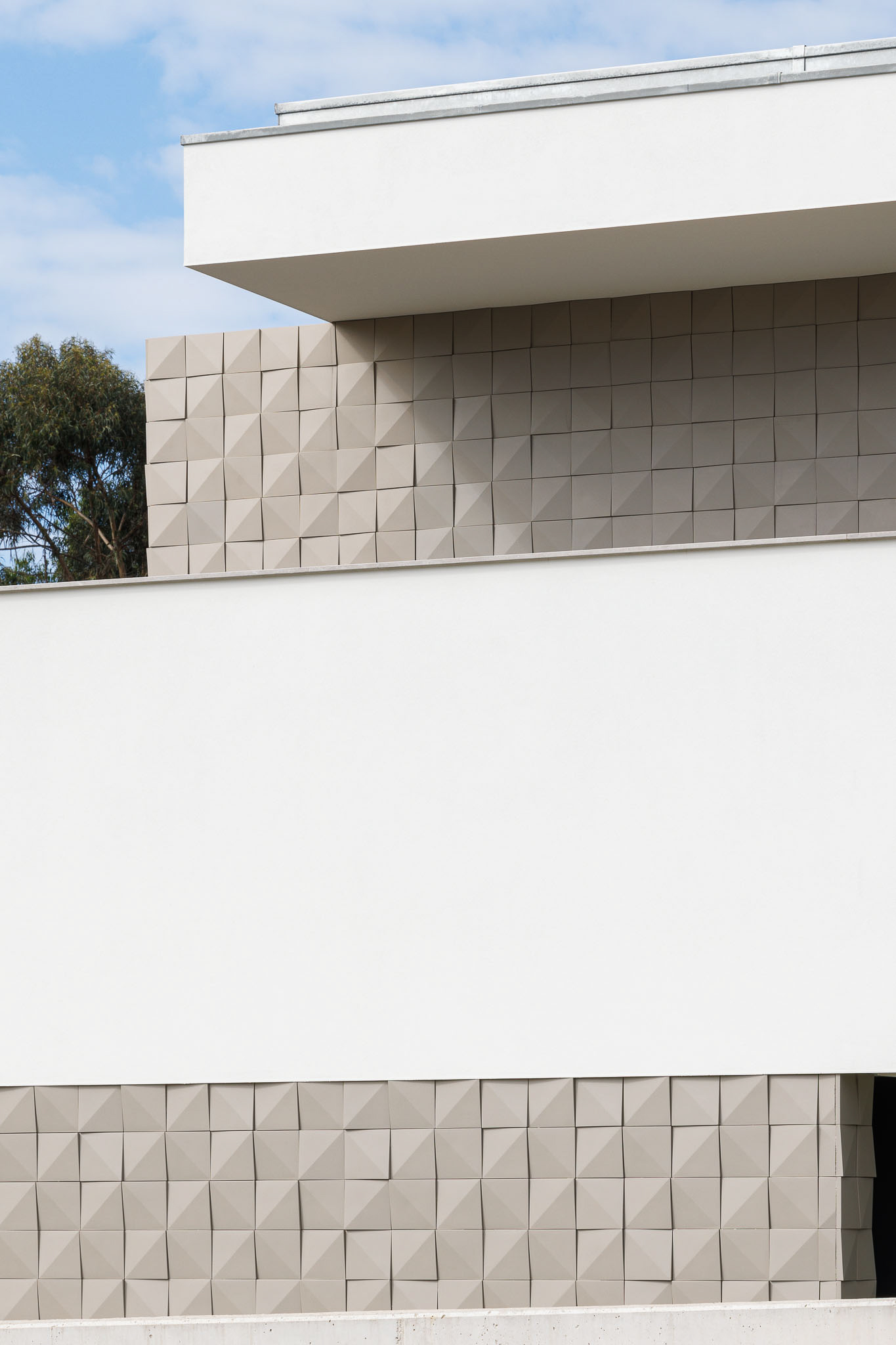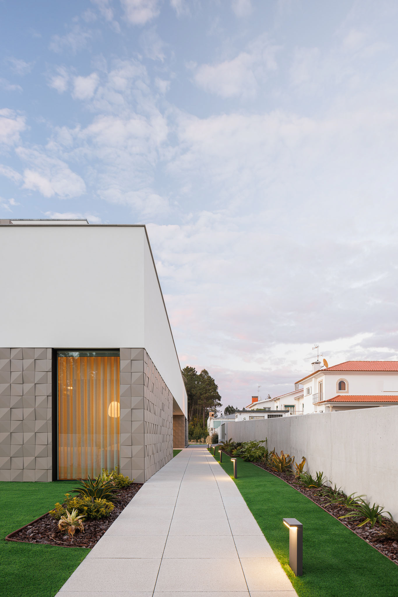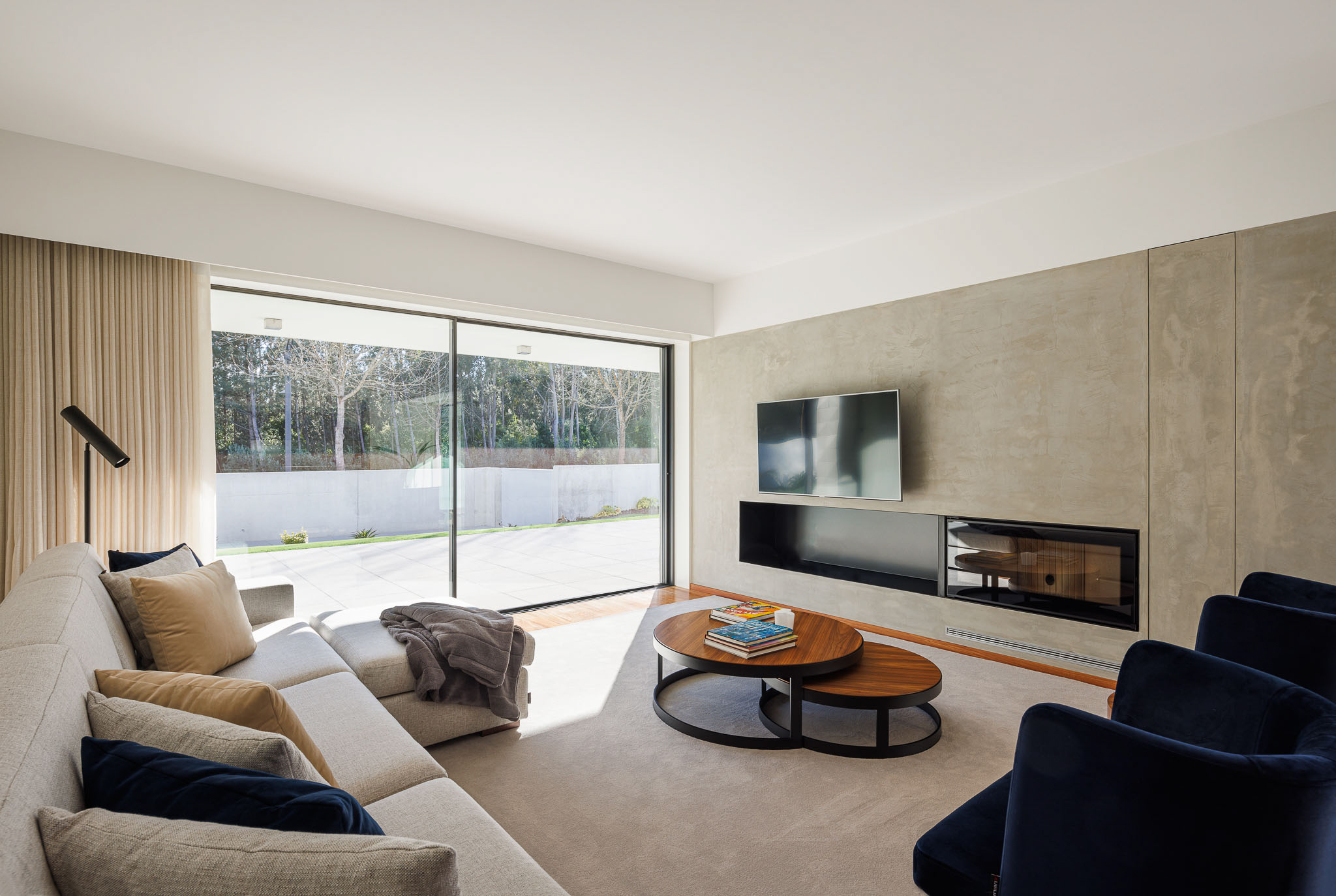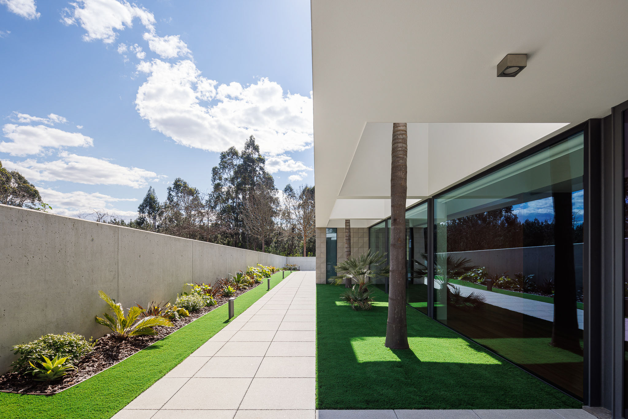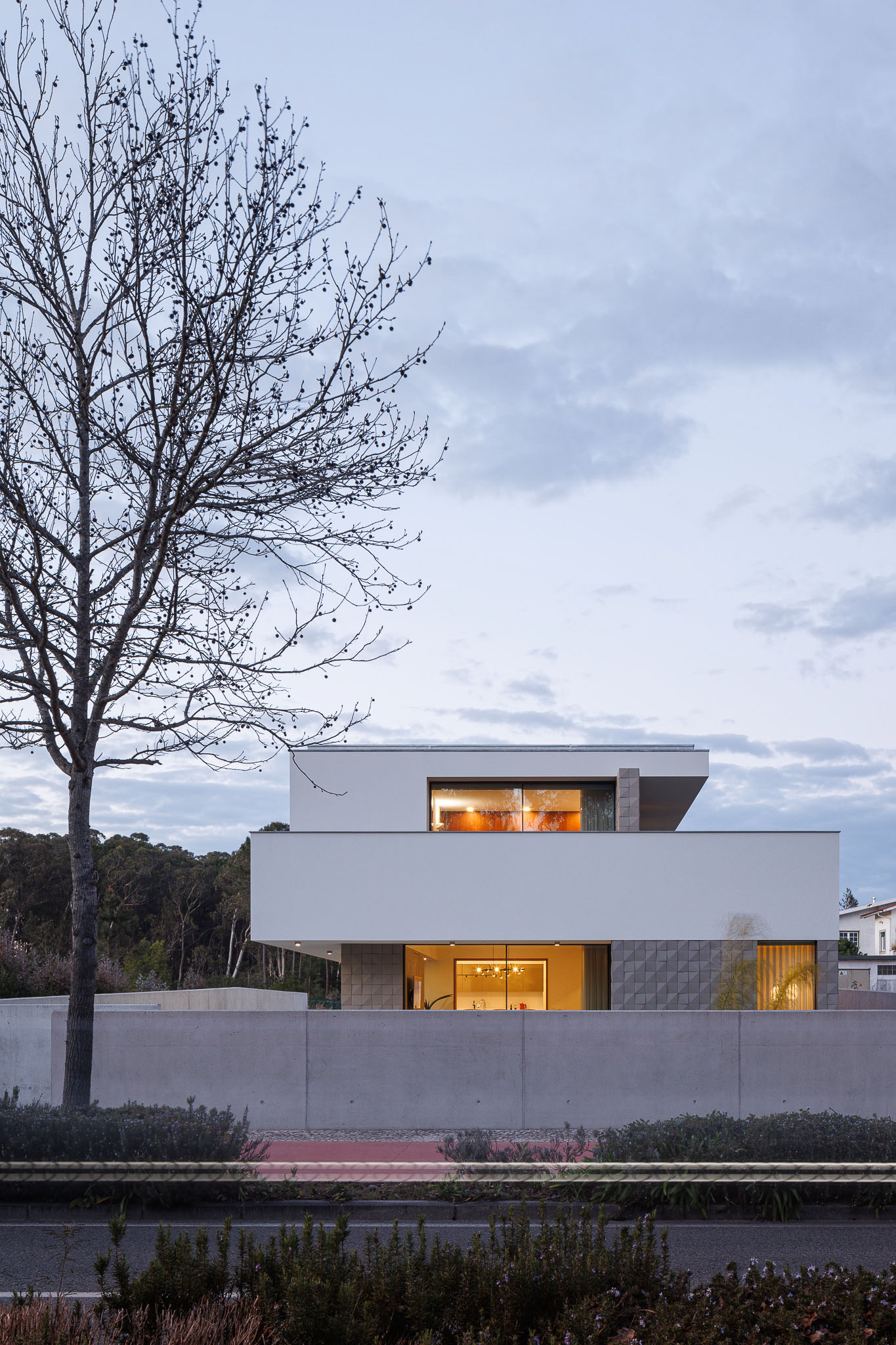 The house is located on a long and narrow plot of land, which conditioned the long shape of this building spread over two floors. The car access is carried out perpendicularly to the larger side of the land, from Maria Albertina Street, while pedestrian access takes place, to the South, on Regua Avenue, leading East, along the house to its entrance. From there, and from the entrance hall, you can access, to the South, the living rooms, the kitchen and the friends' room and to the North to the garage and gym. On the upper floor, which is smaller, there are two bedrooms with a common bathroom, the master suite and an office. The house, in a long shape, tries to make the best use of the relationship with the outside and the solar quadrant. The social and leisure areas open to the West and South, enjoying a long partially covered patio. To the East, the interior circulation takes place in a mirror with the exterior pedestrian access only separated by a large glazed area. On the upper floor, the bedrooms and the office open onto large balconies and terraces, either to the East, enjoying the morning light, or to the South. The volumetry is marked by horizontality, accentuated by the slabs and beams in white plaster, which contrast with the cladding of the walls in cement tiles, which give plasticity and animation to the set. The openings of the slabs at the 1st floor level and the large glazing complete the building's language. The conceptual idea is based on a simple, clean and almost minimalist design, as opposed to formal exaggeration and existing languages.