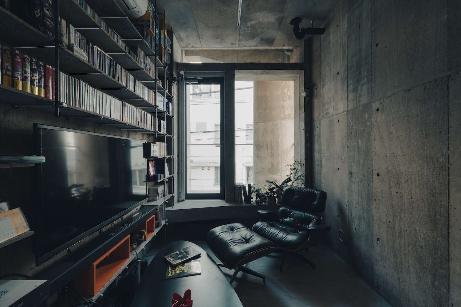 이 작은 도시형 주택의 건축주가 요구한 것은 평범하고 간단했다. 그는 거대한 책장으로 둘러싸인 수직적인 공간에서 자신만의 세계에 완전히 몰입할 수 있는 독신남의 공간을 원했다. 이를 위해 건축가는 그가 알고 있는 건축적 고의성을 부인하는 것에서 시작했다. 순수한 물질성과 도로, 다리와 같은 토목공학적 구조가 설계의 기준점을 제공했다.