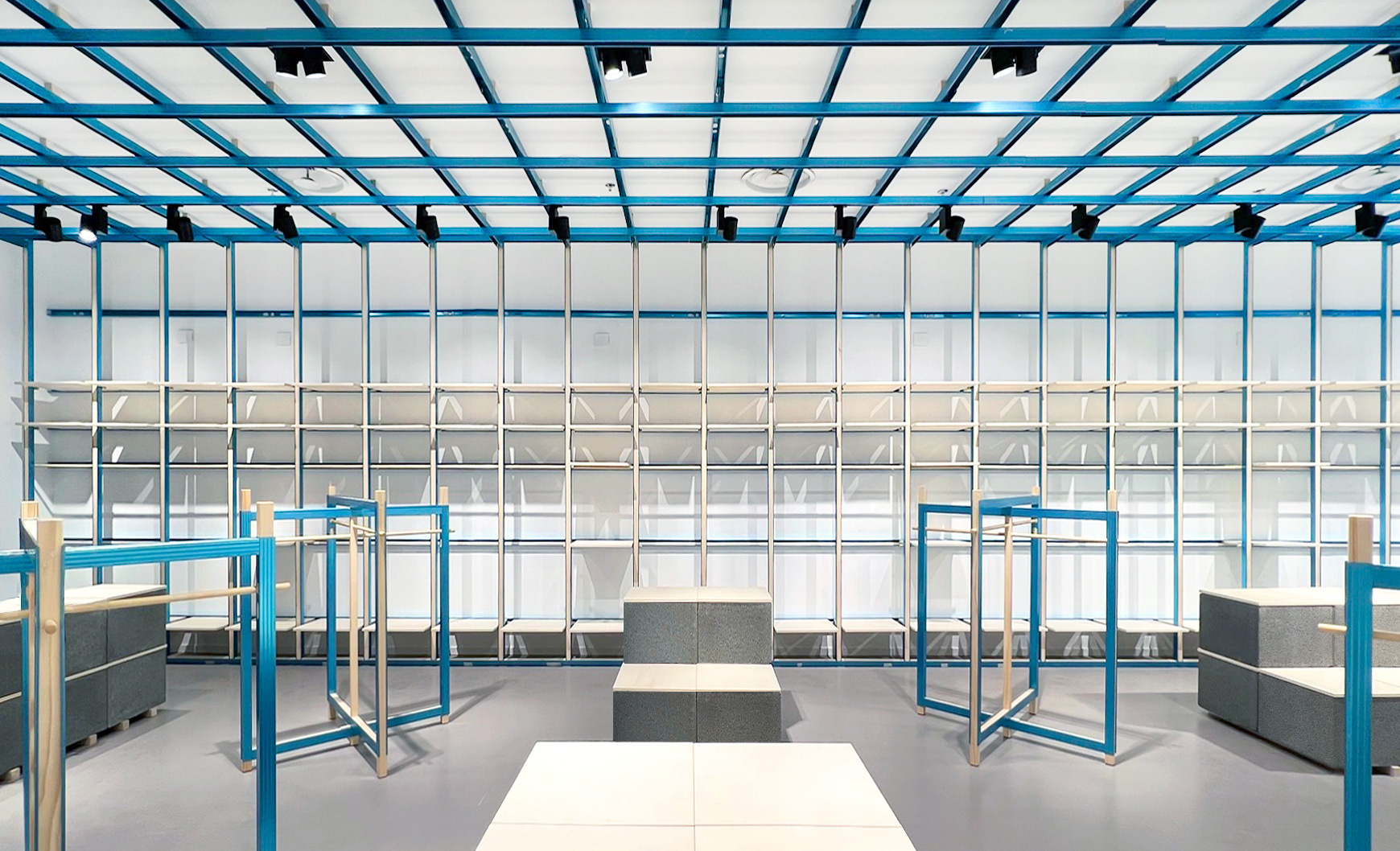 리버시블 샵은 이탈리아 밀라노의 다중 브랜드 소매업체인 온오프(ON-OFF)를 위한 새로운 매장이다. 건축가는 건축 산업에서의 유연하고 확장 가능한 디스플레이 솔루션에서 영감을 받아 미래 사업의 순환을 나타내는 계획안을 구상했다. 기존의 공간은 유지하면서 개선된 재료로 빠르고 쉽게 시공할 수 있는 방식을 선택하여 내부 공간의 배치를 개방적으로 구성하고, 다양한 상황에 유연한 대처가 가능하도록 구조적으로 계획했다. 상품을 매달 수 있는 디스플레이는 제품 자체가 공간의 건축적인 요소가 되어 브랜드 아이덴티티를 만들어낸다. 천장에서 내려오는 유색 금속 격자, 조절가능한 선반을 지탱하는 포플러 목재 레일, 파란색의 메타크릴레이트 노출 구조물 등 산업과 천연 재료를 재치있게 재해석하여 기업의 이미지를 정의한다.